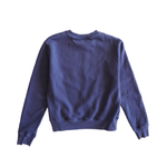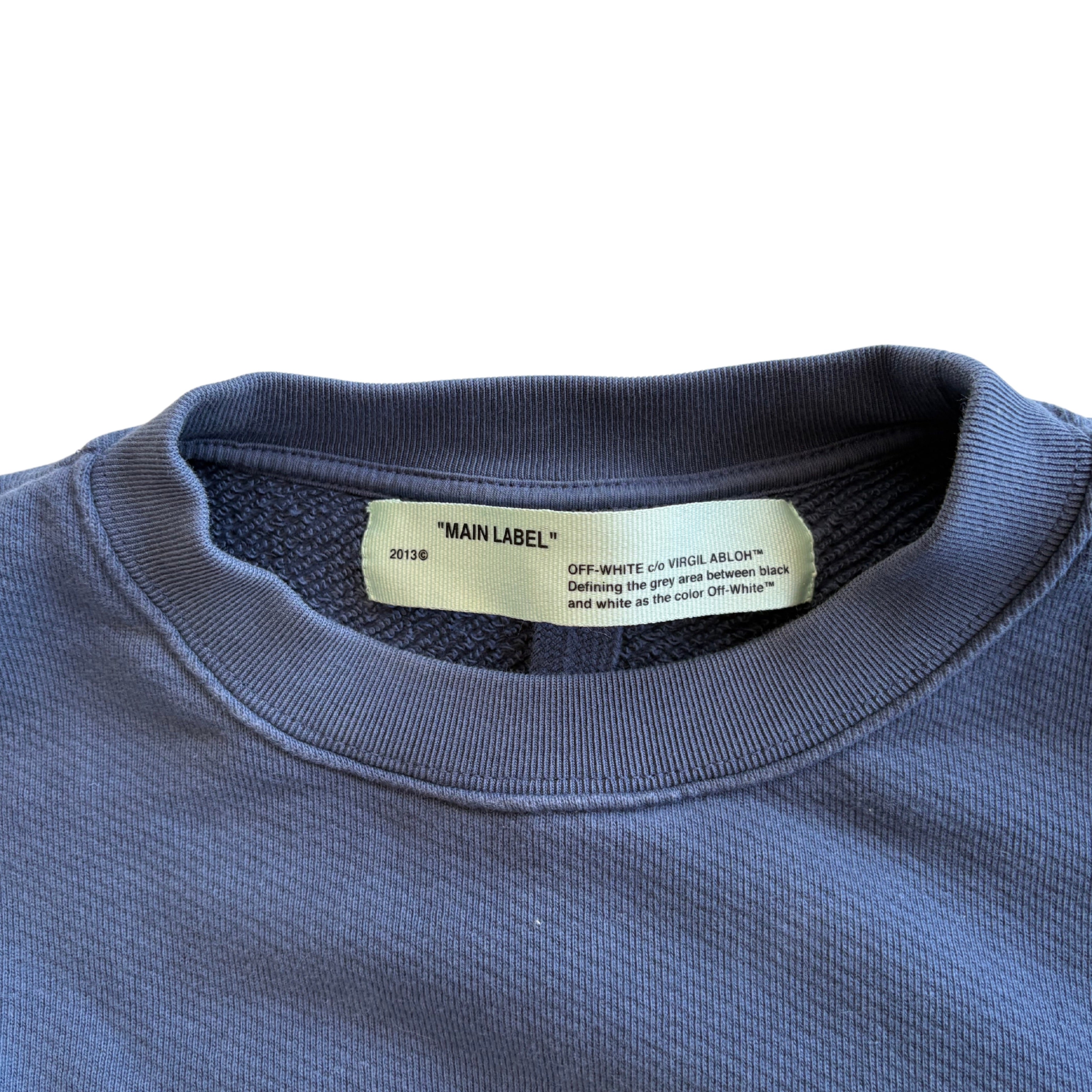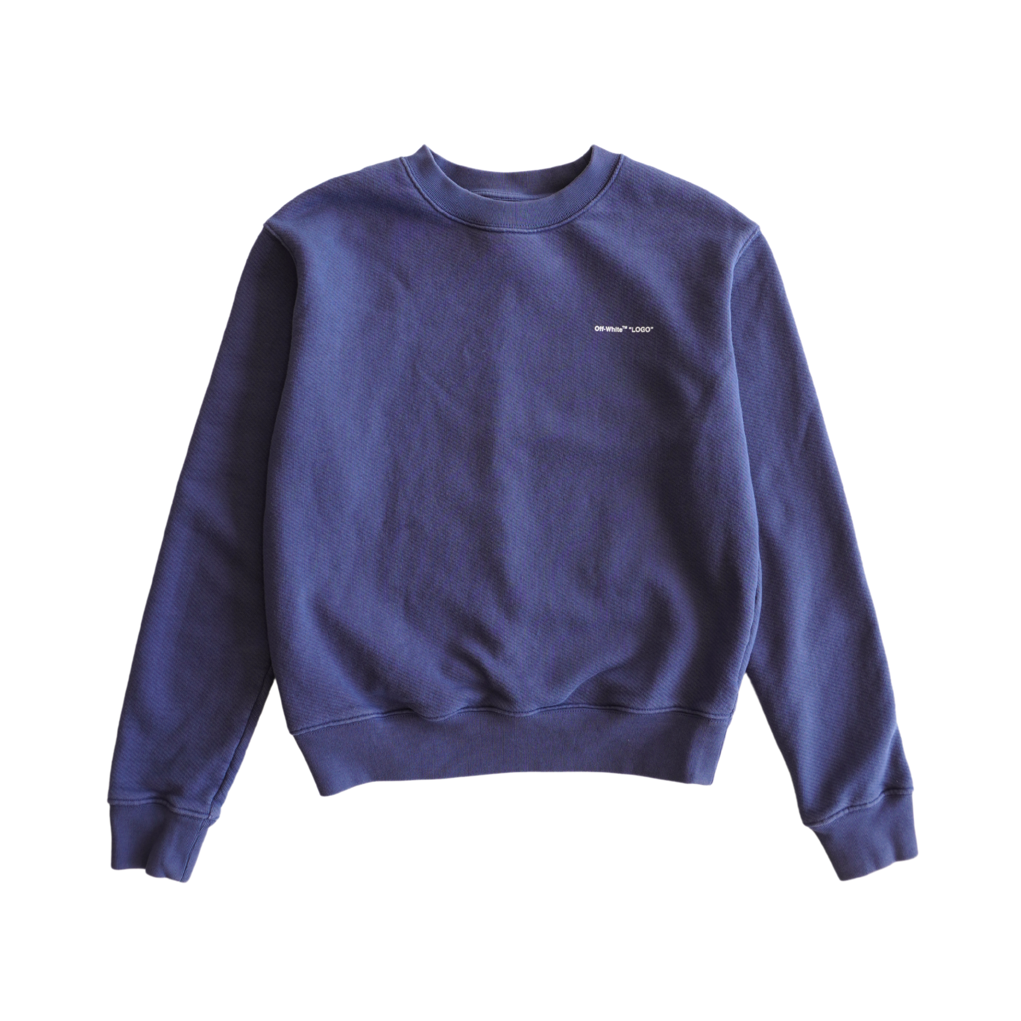 Off-White long-sleeve crewneck sweatshirt in blue cotton with a white logo on the chest and ribbed hem and cuffs.