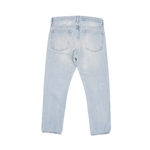 Our Legacy straight leg jeans in light wash cotton denim with copper and silver hardware.