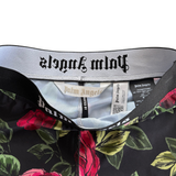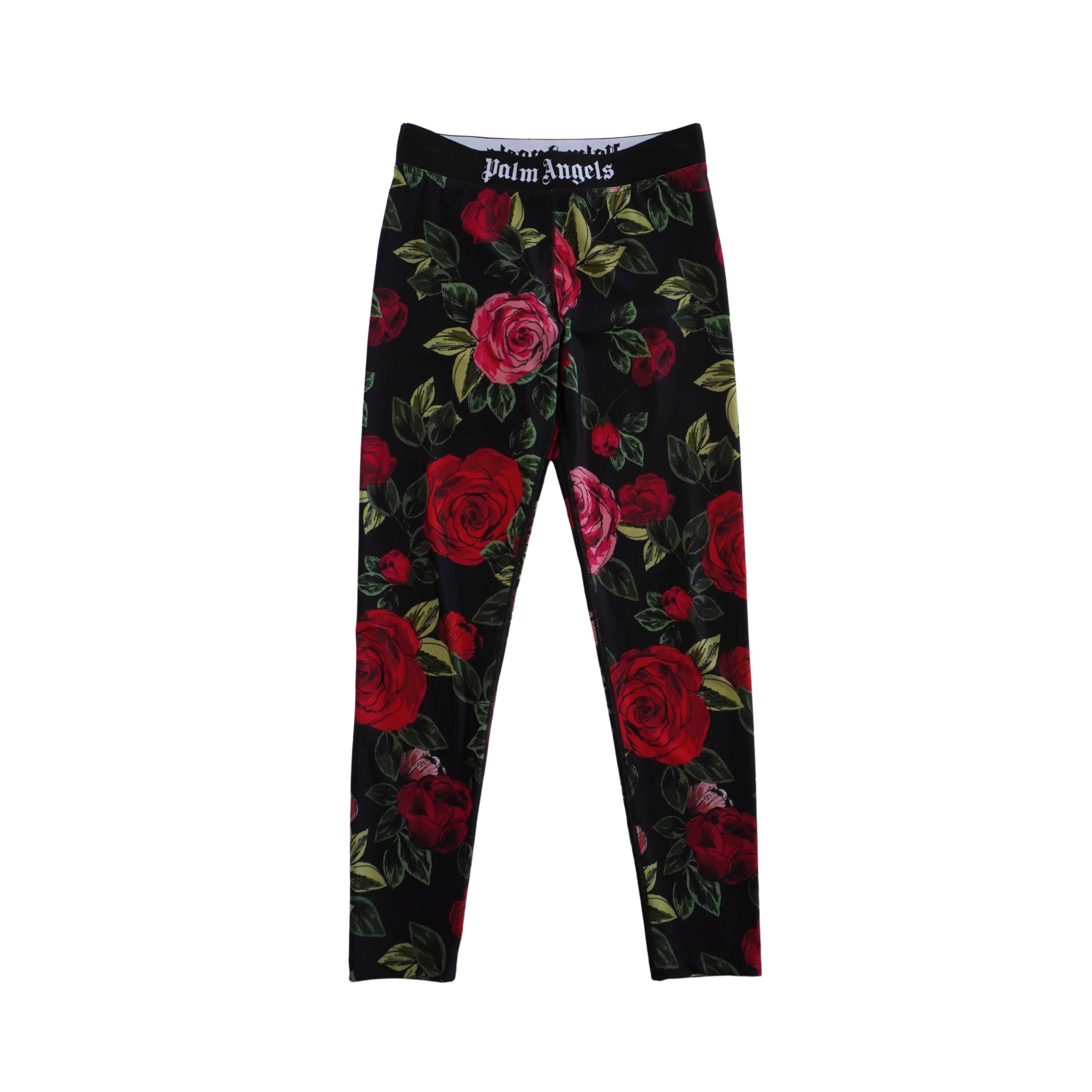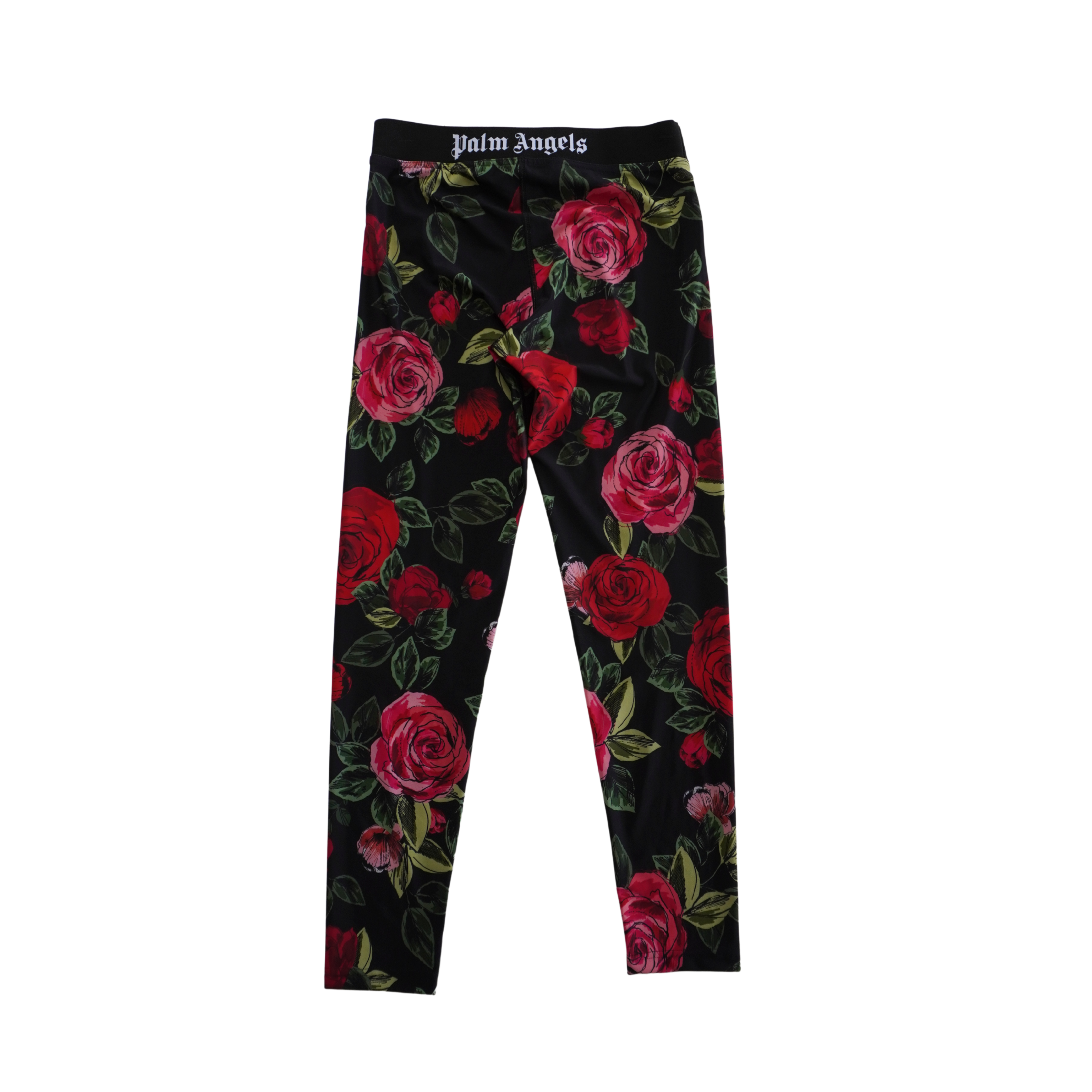 Palm Angels 'Rose Track' leggings in black nylon with an all-over red, pink and green rose print and an elastic black and white logo waistband.
