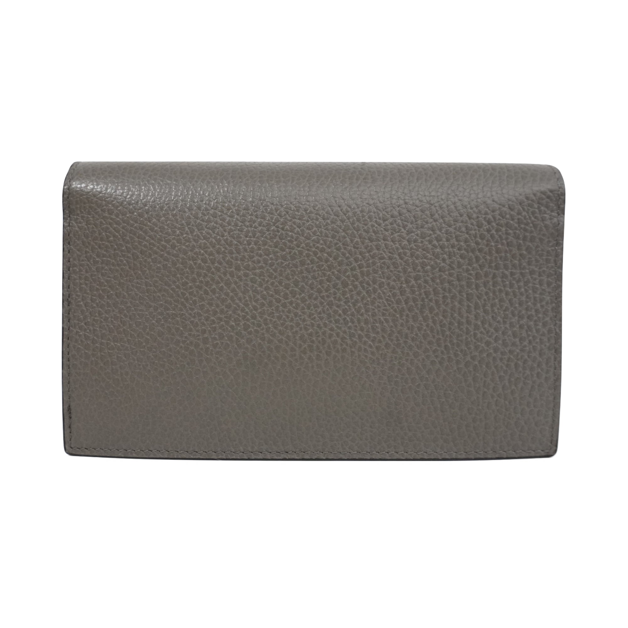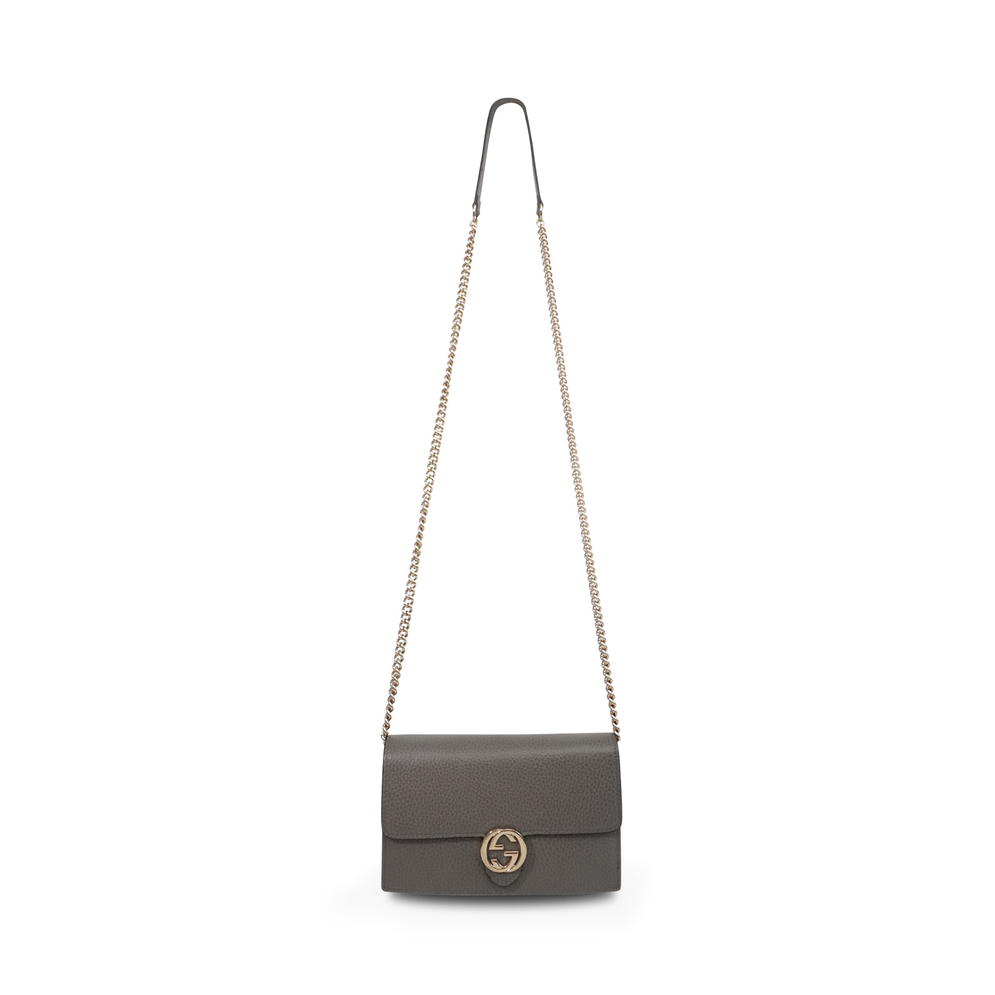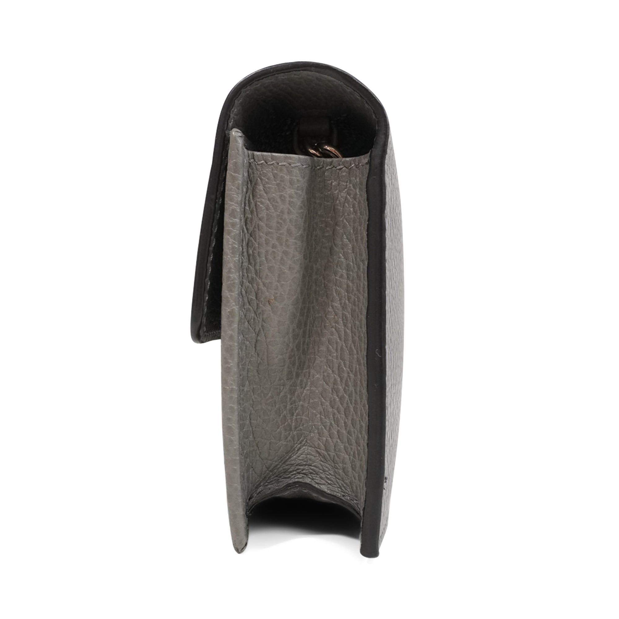 Gucci 'GG' wallet on chain in grey pebbled leather with small front flap and double interlocking G logo. Features a crossbody chain in gold hardware with leather shoulder rest. Interior features one main compartment, one zip pocket and sixteen card slots.