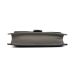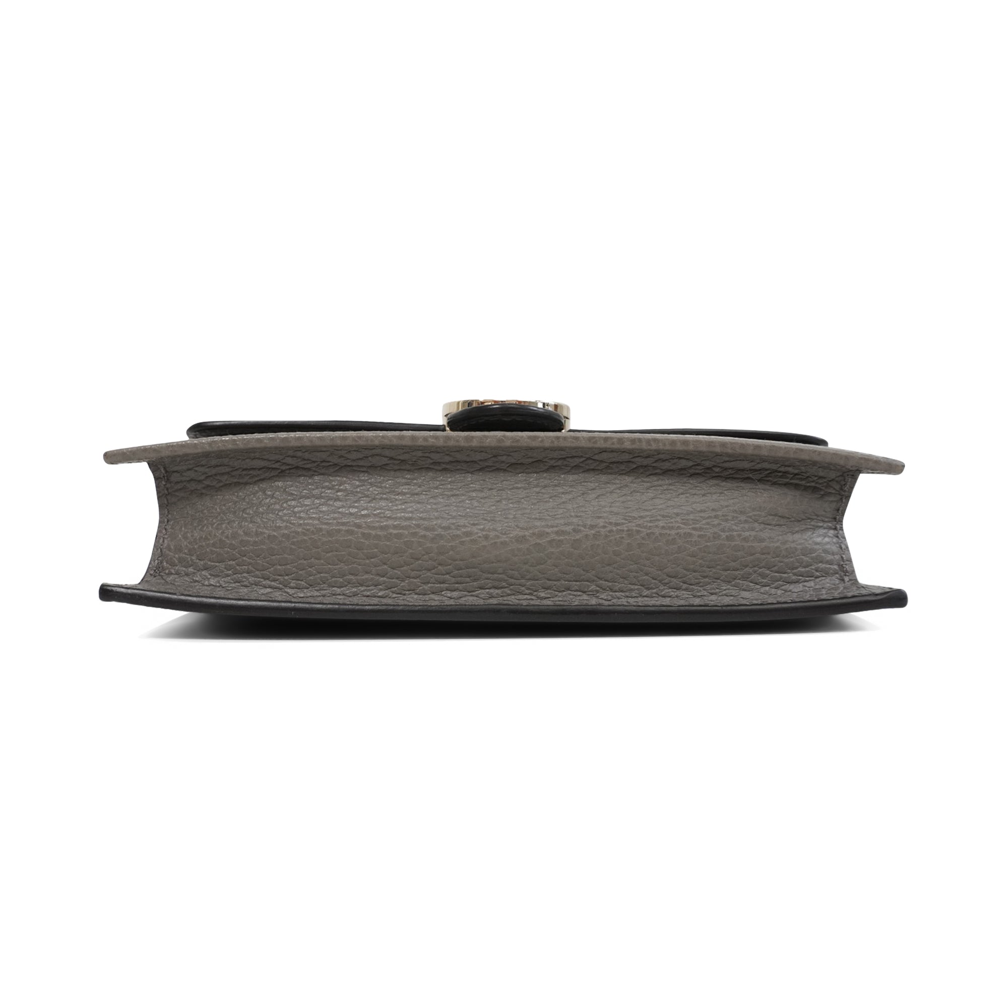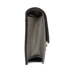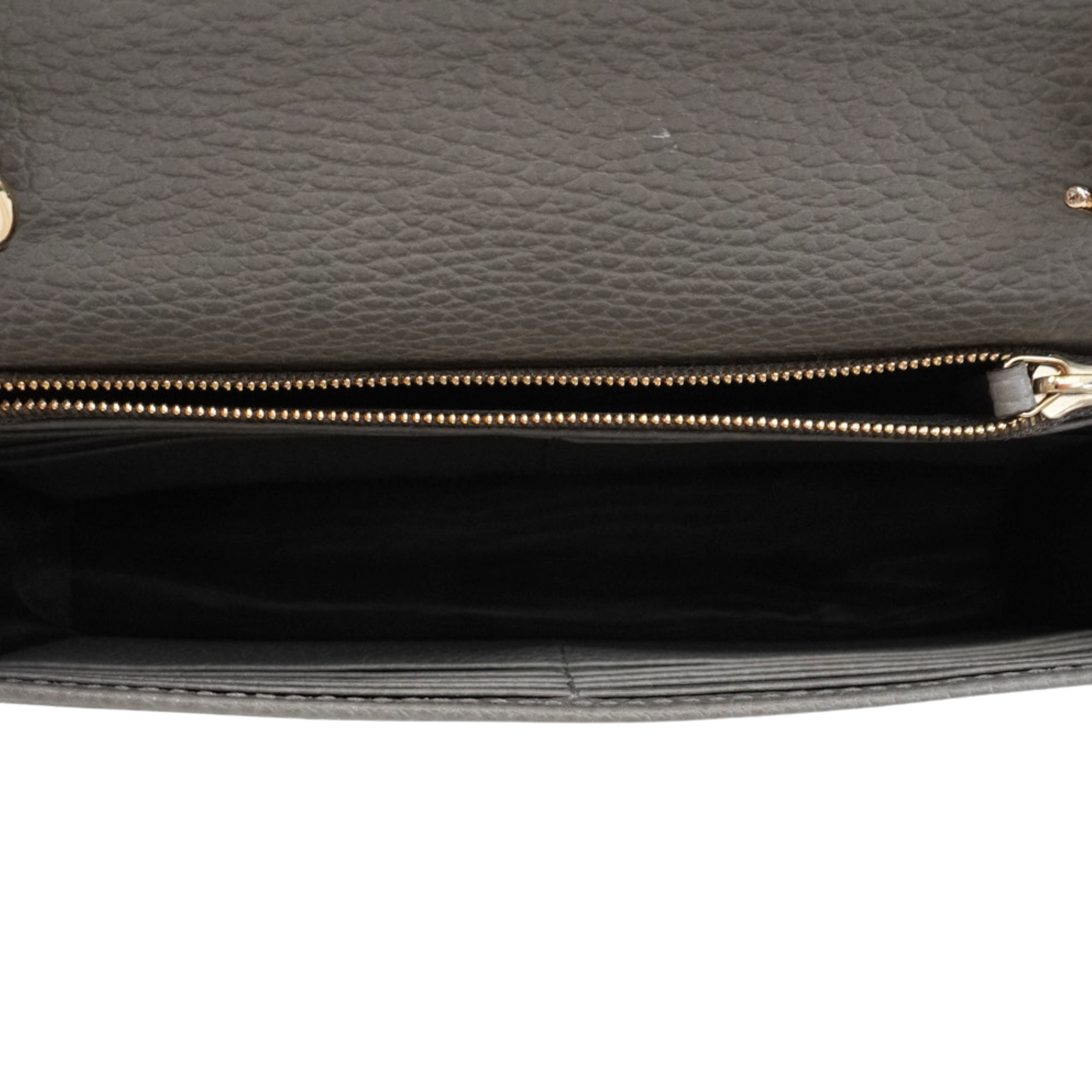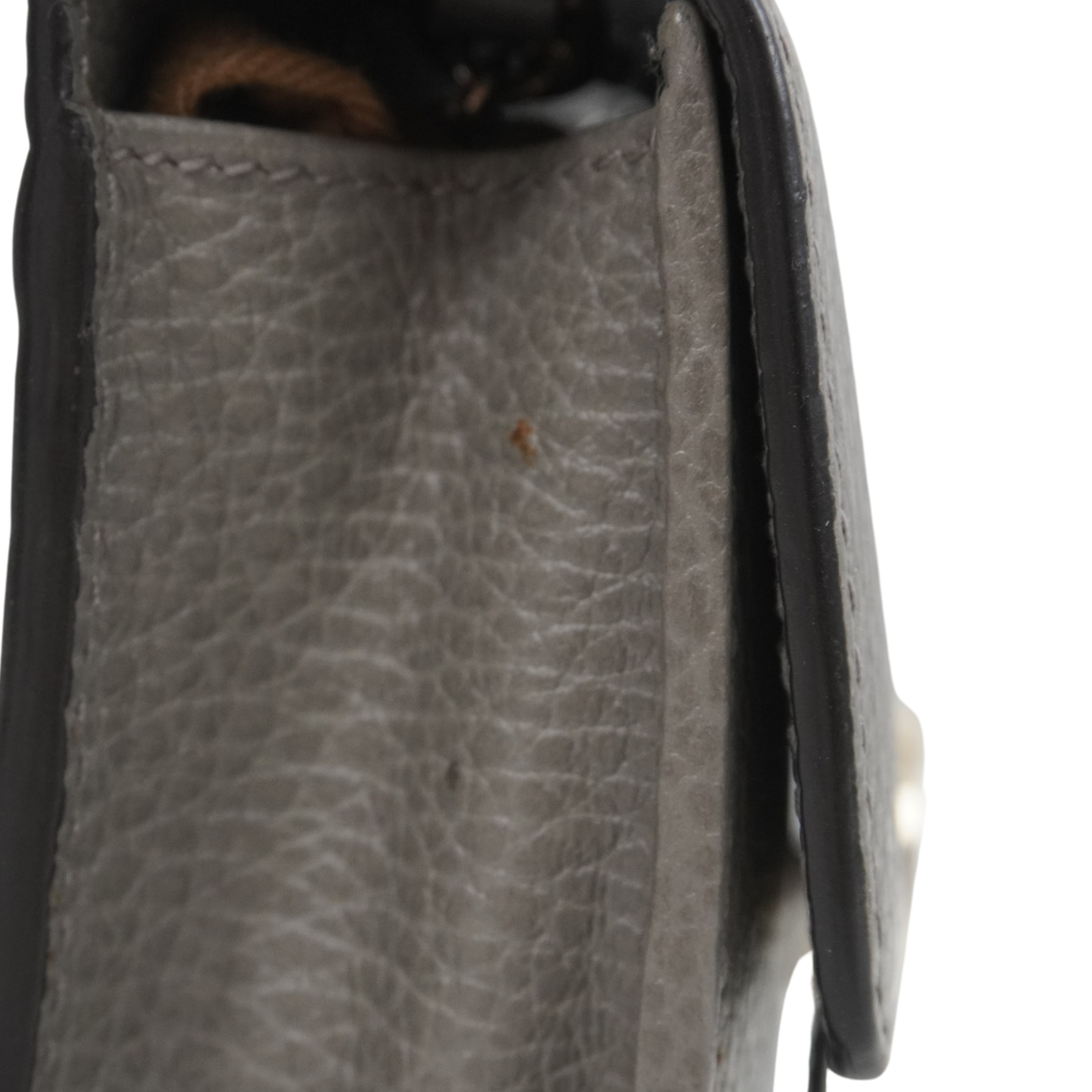 Gucci 'GG' wallet on chain in grey pebbled leather with small front flap and double interlocking G logo. Features a crossbody chain in gold hardware with leather shoulder rest. Interior features one main compartment, one zip pocket and sixteen card slots.