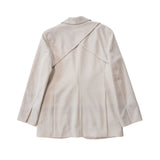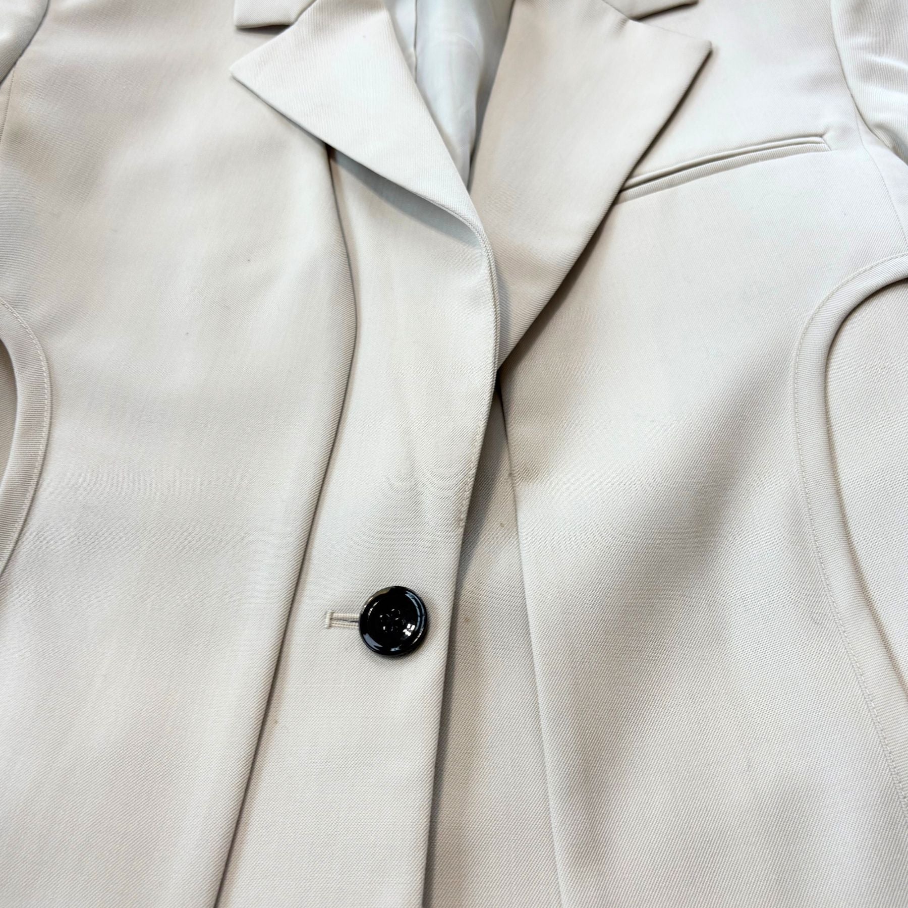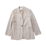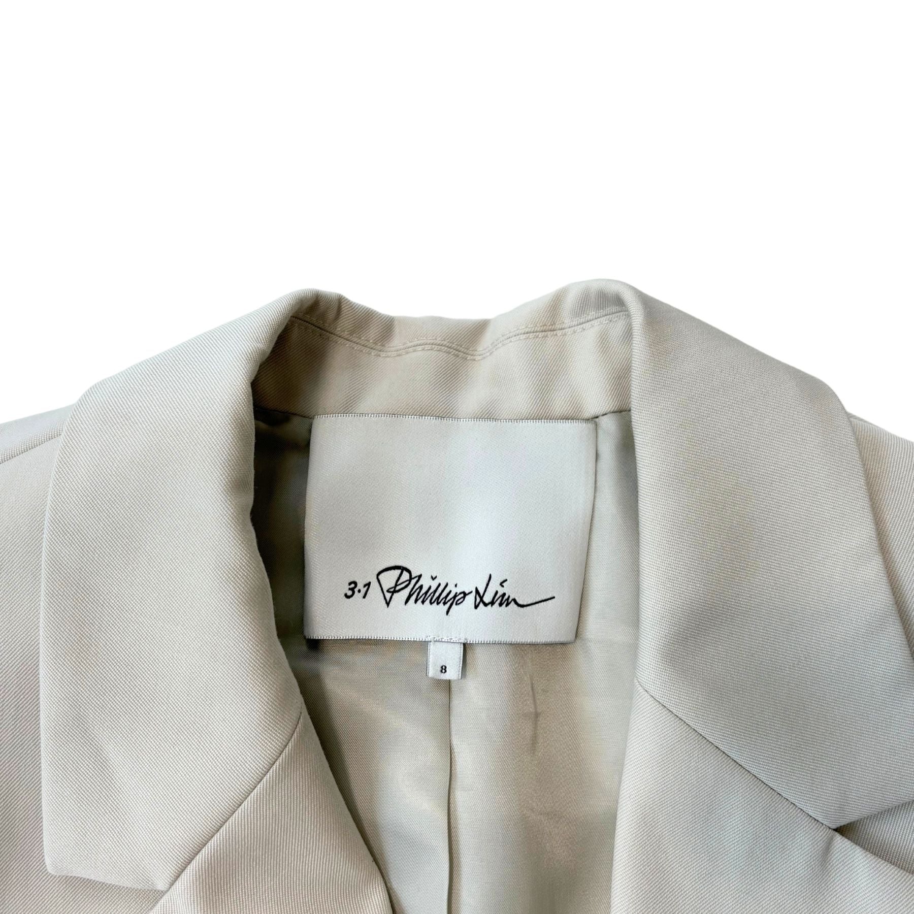 Phillip Lim blazer in cool-tone beige wool. Features a single tortoise-shell button closure, layered panel detailing on the front and back, front slip pockets, a chest pocket, notched lapel, and slits on the back hem.