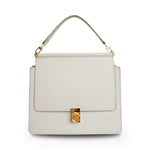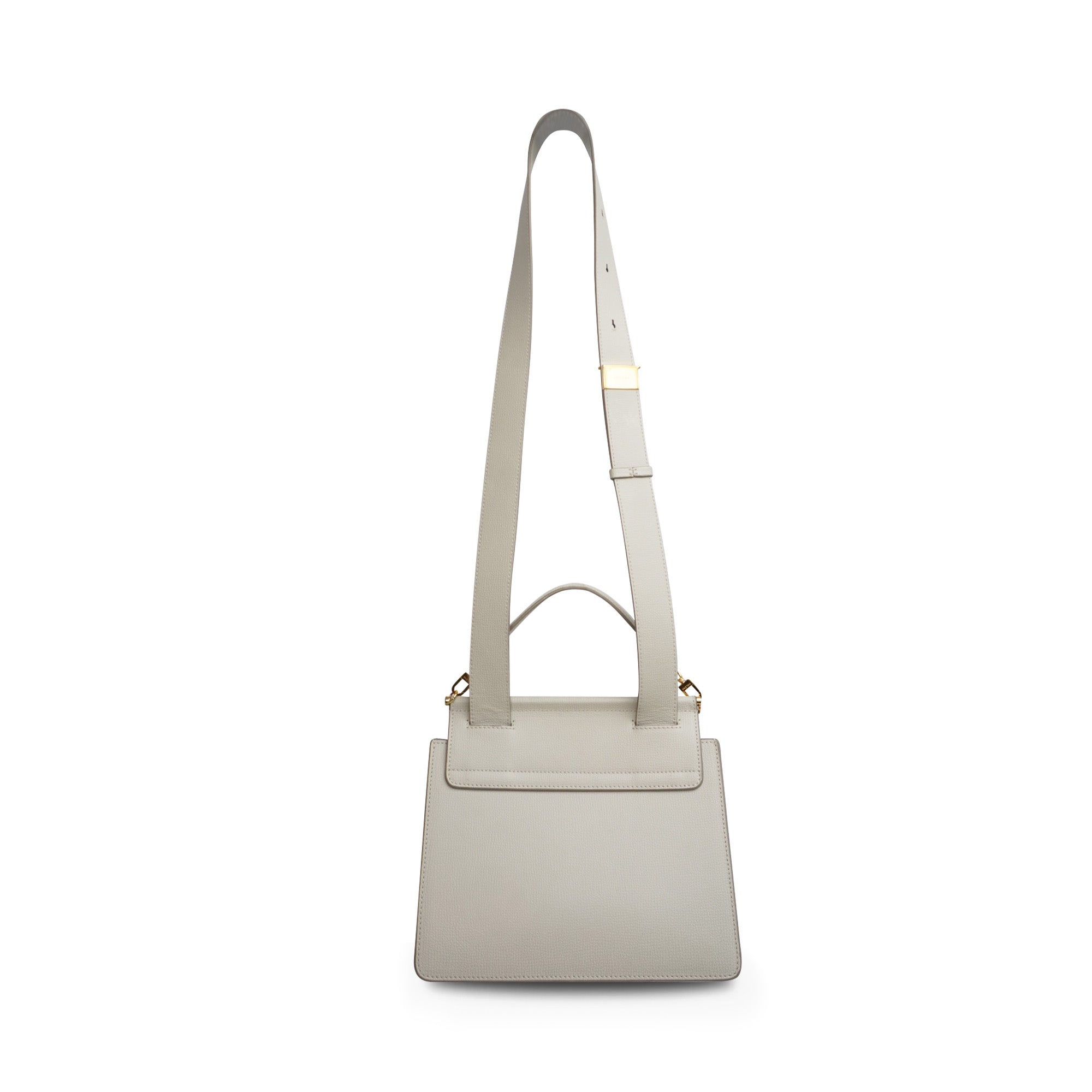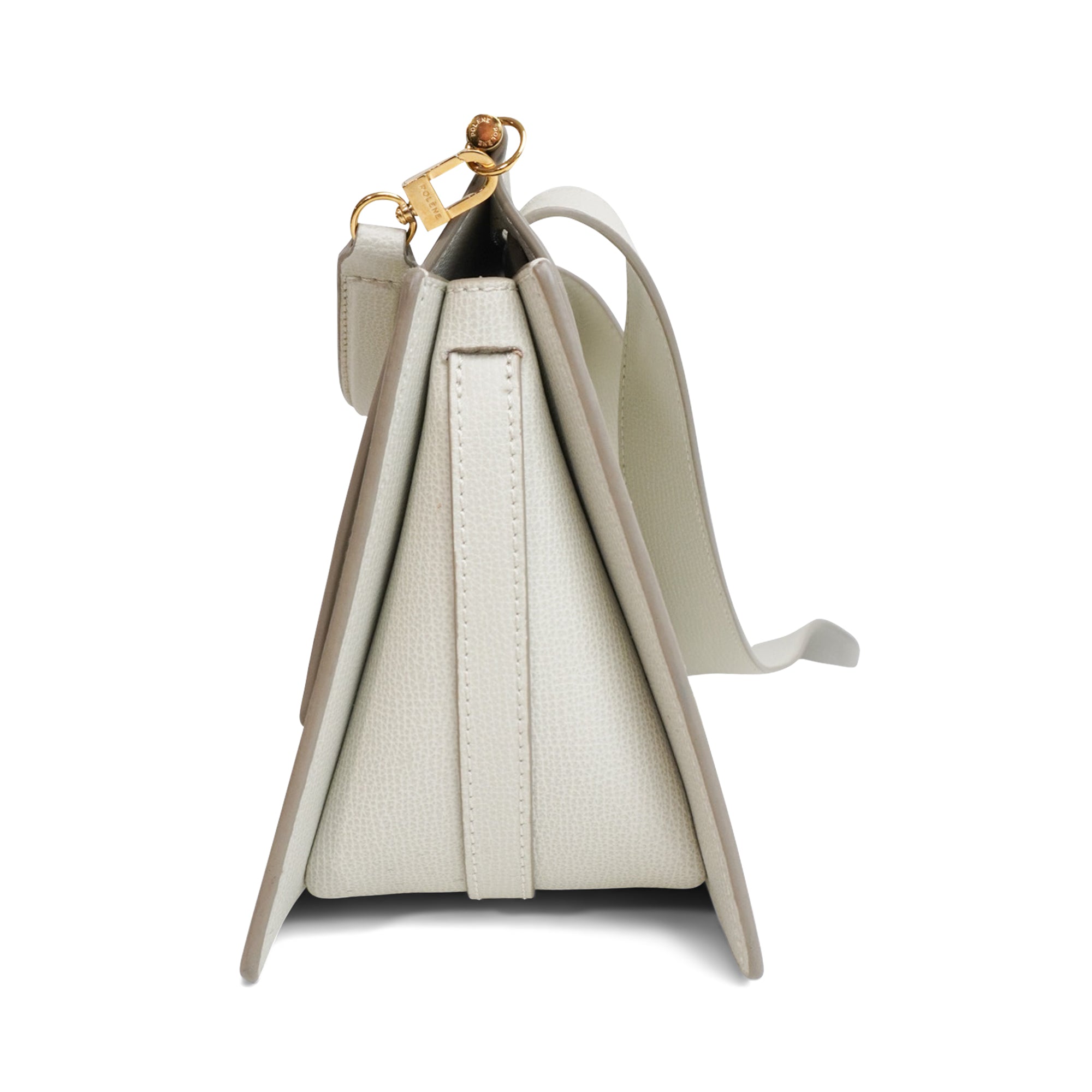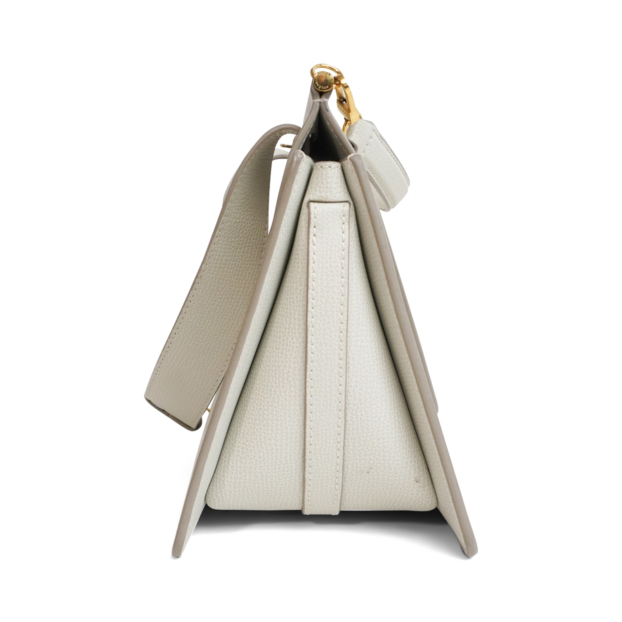 Polene 'Numero Sept' handbag in cream pebbled leather with gold hardware throughout, a removable flat top handle, and an adjustable thick crossbody strap. The bag has a top flap opening with a latch closure, revealing a suede lined interior with a slip pocket.