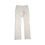 Poster Girl 'Jaime' trousers in light grey latex with an attached belt with silver buckle hardware, buckle detailing at the hems, and a front zip opening.