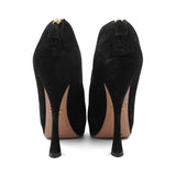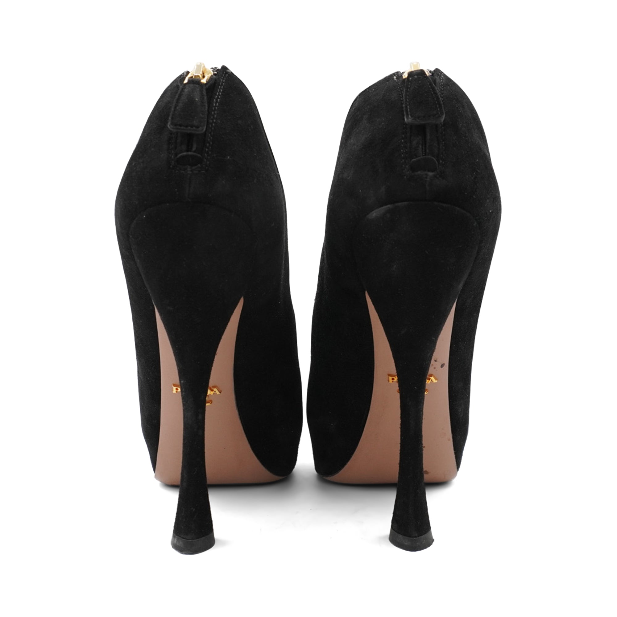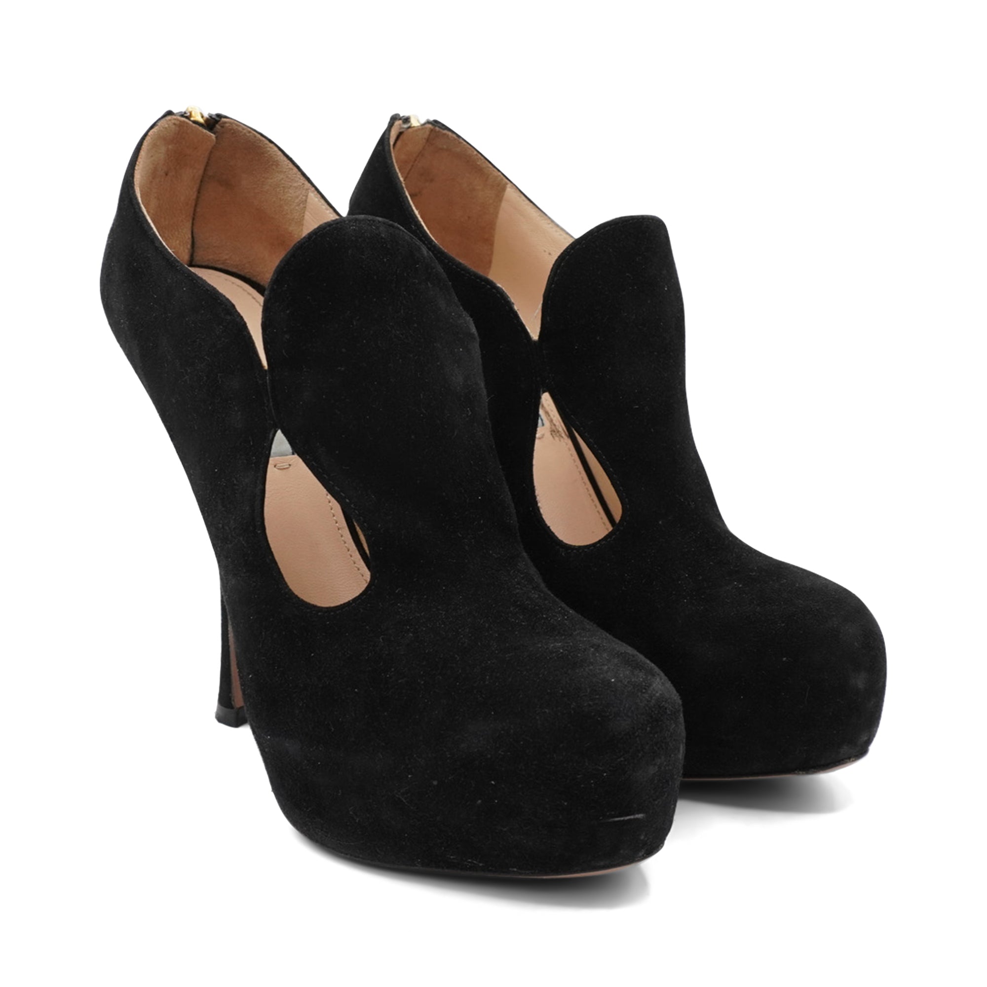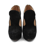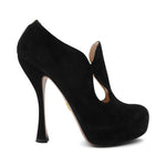 Prada platform booties in black suede with a cut-out detail on the sides, a curved high-heel, and an almond toe.