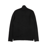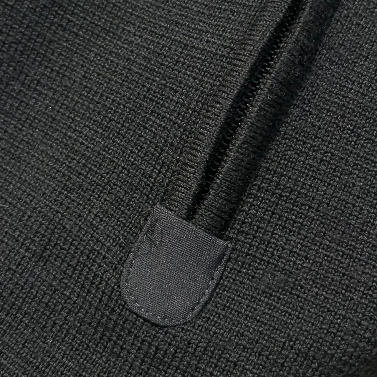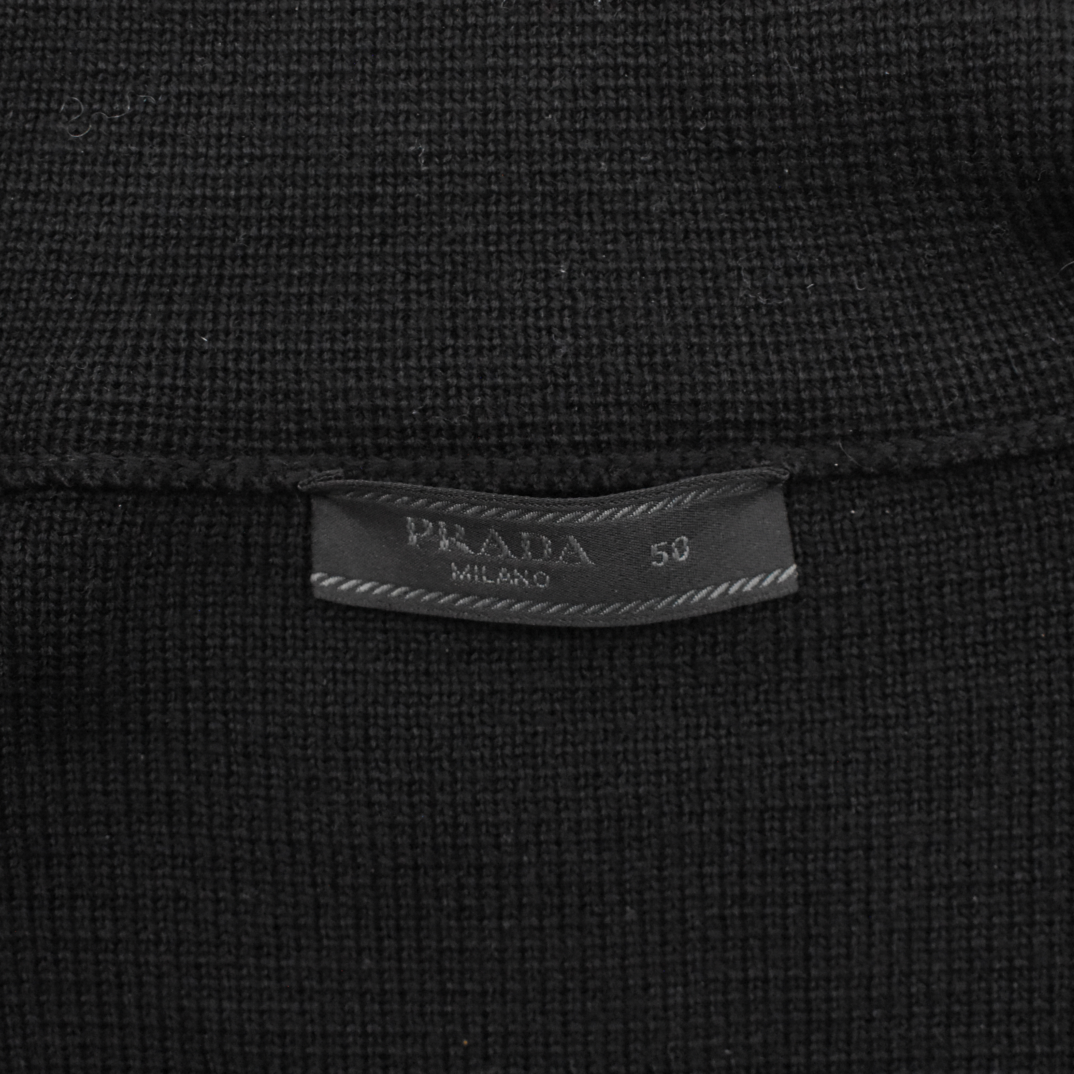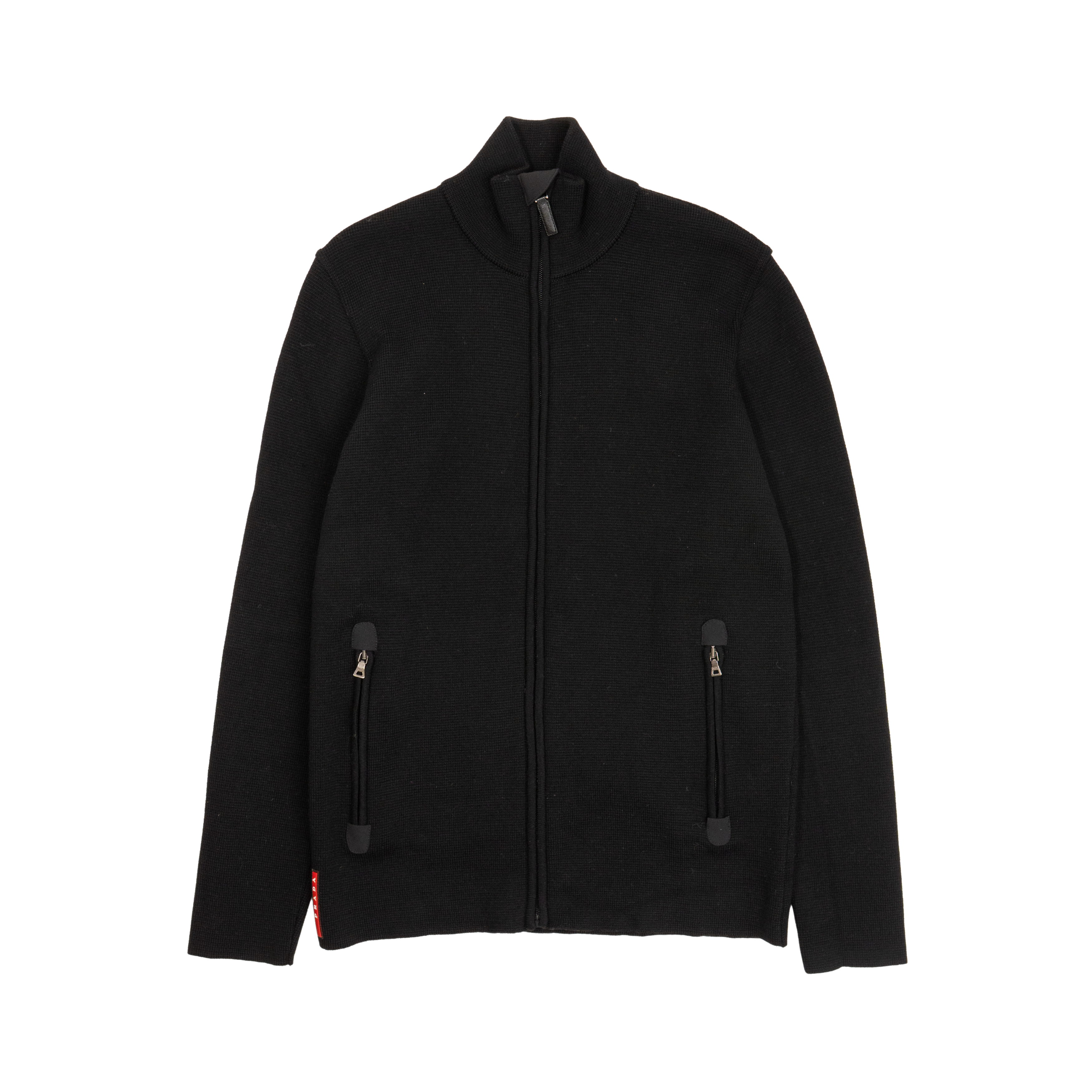 Prada zip up knit sweater in black wool with a stand collar, two front zip pockets and red signature rubber logo at hem.