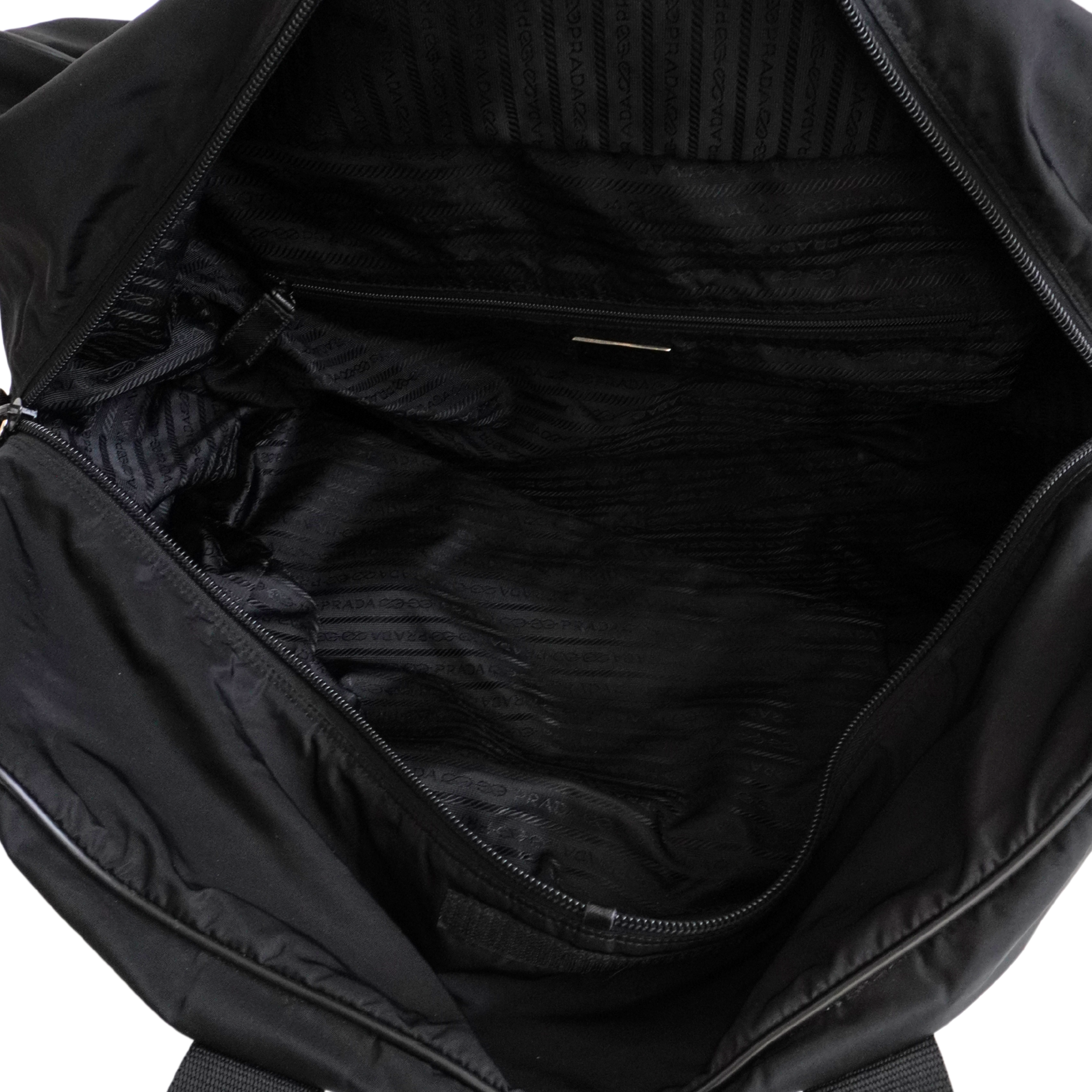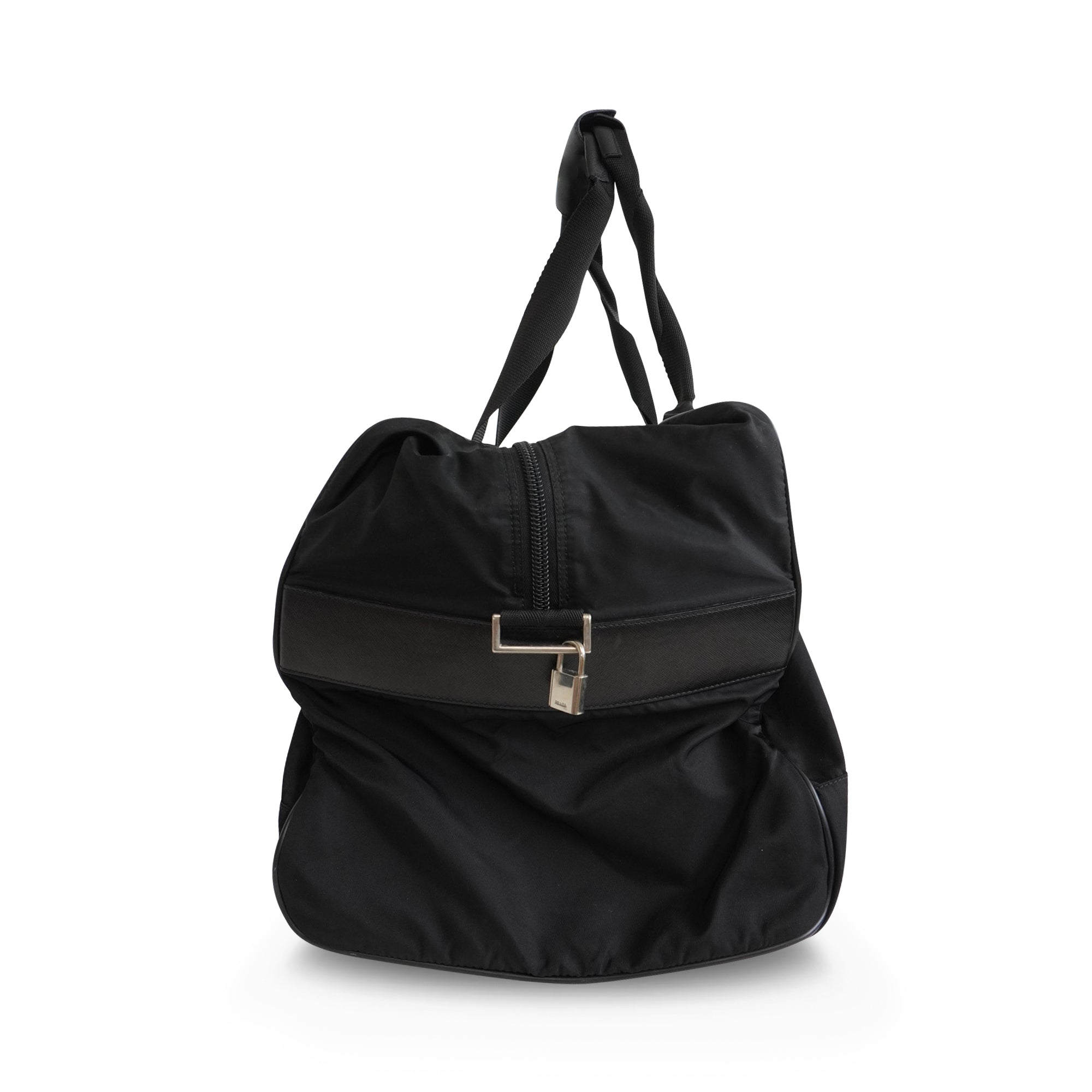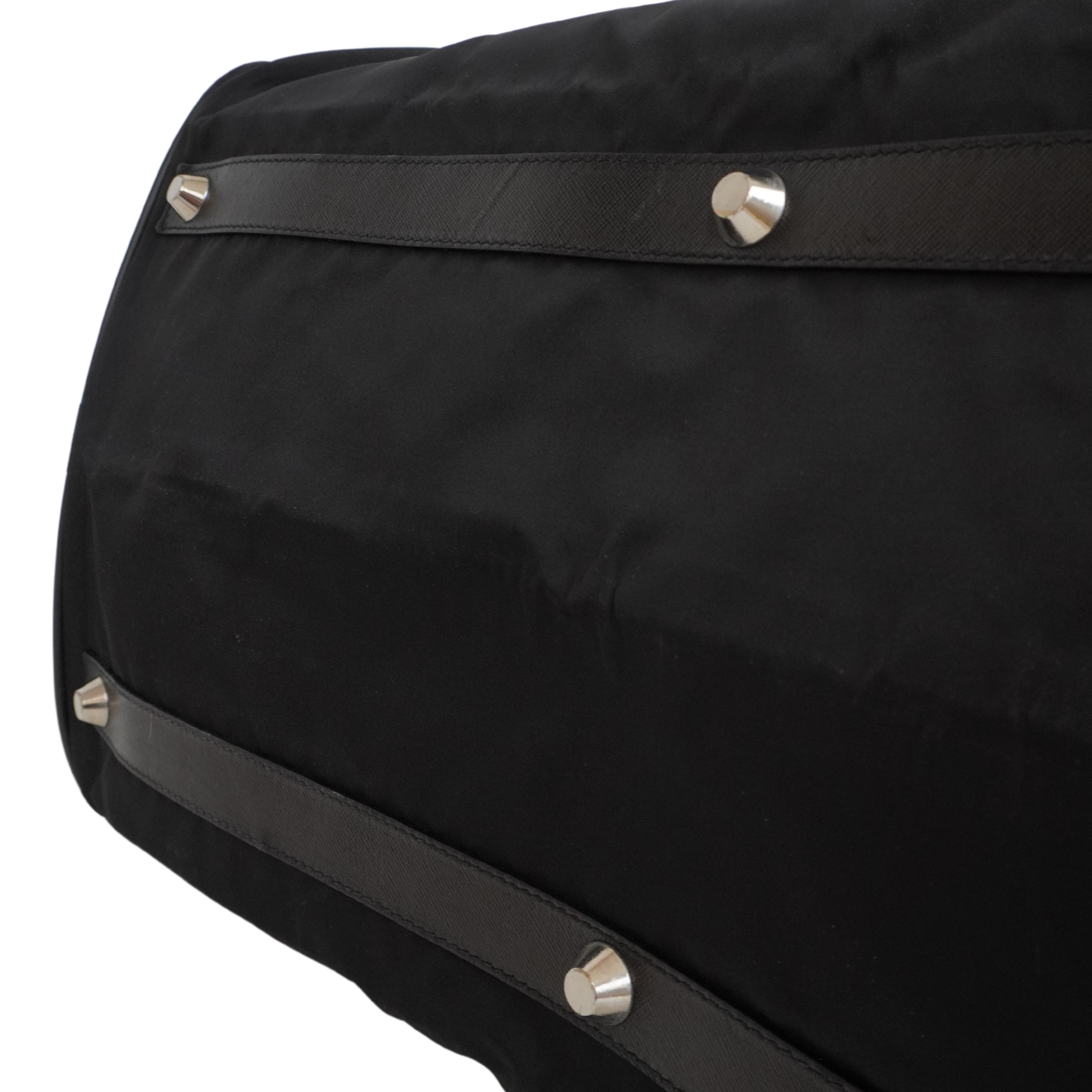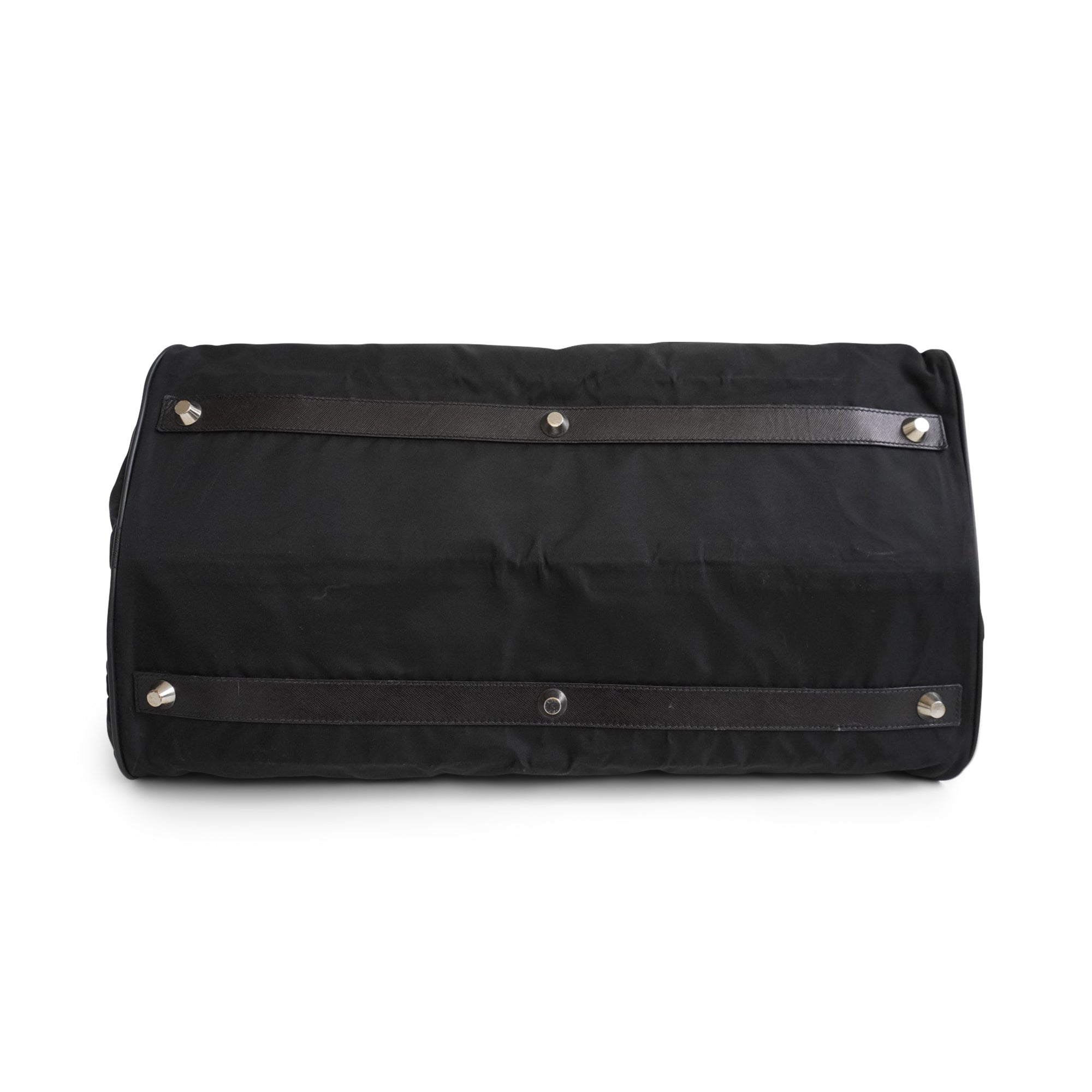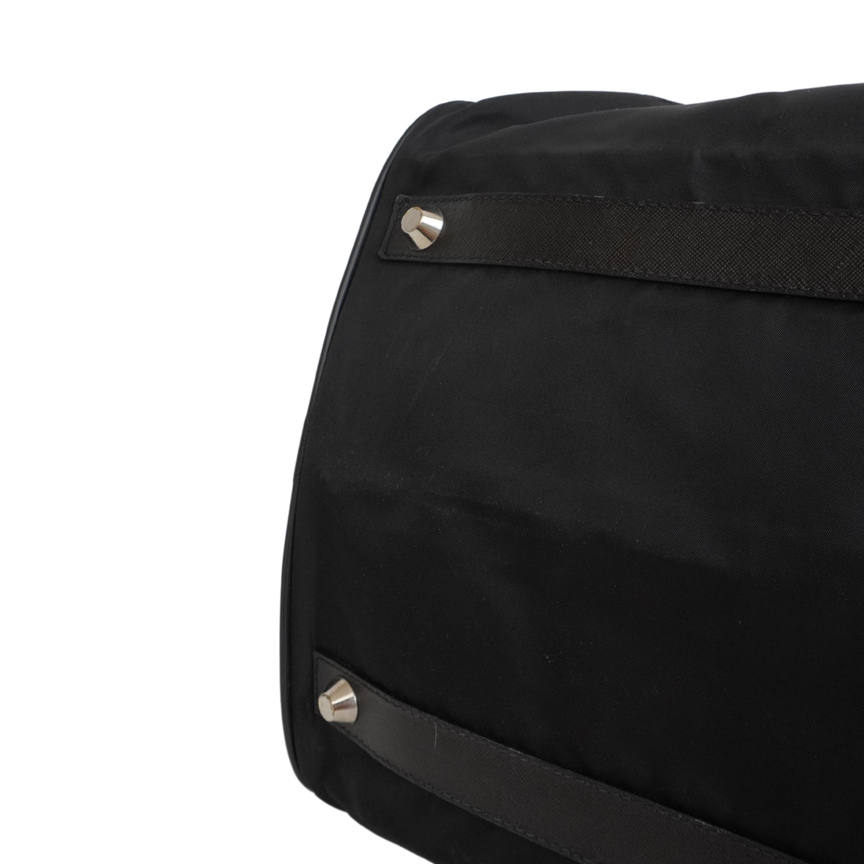 Prada duffle bag in black nylon with silver triangle logo plaque, saffiano leather accents, and nylon web handles. Features a two way zip closure with leather velcro strap reenforcement, logo jacquard lining, and interior zip pocket. The bag has hardware for attaching a longer strap but doesn't include one.