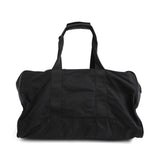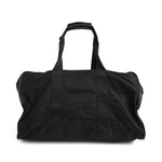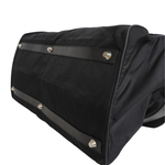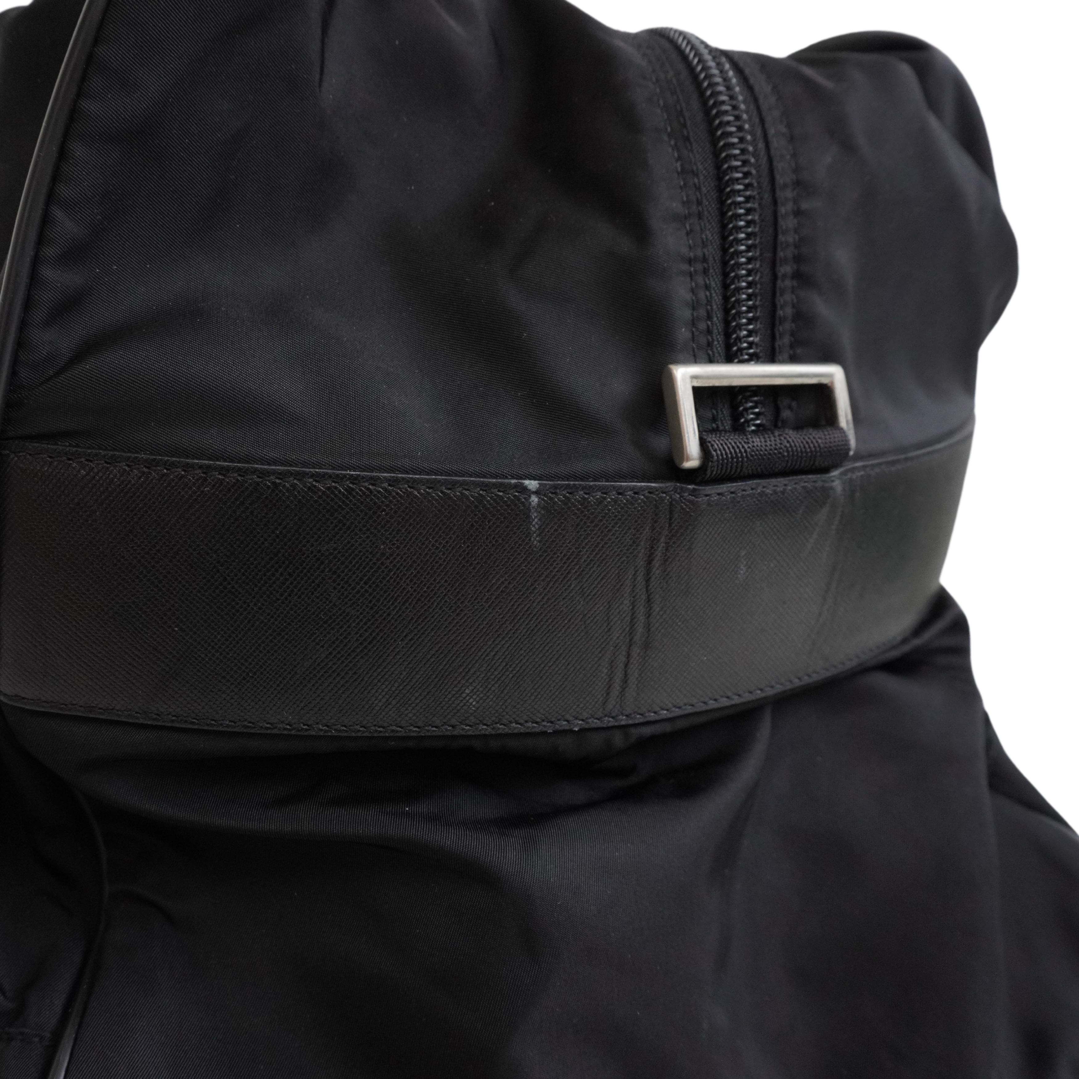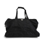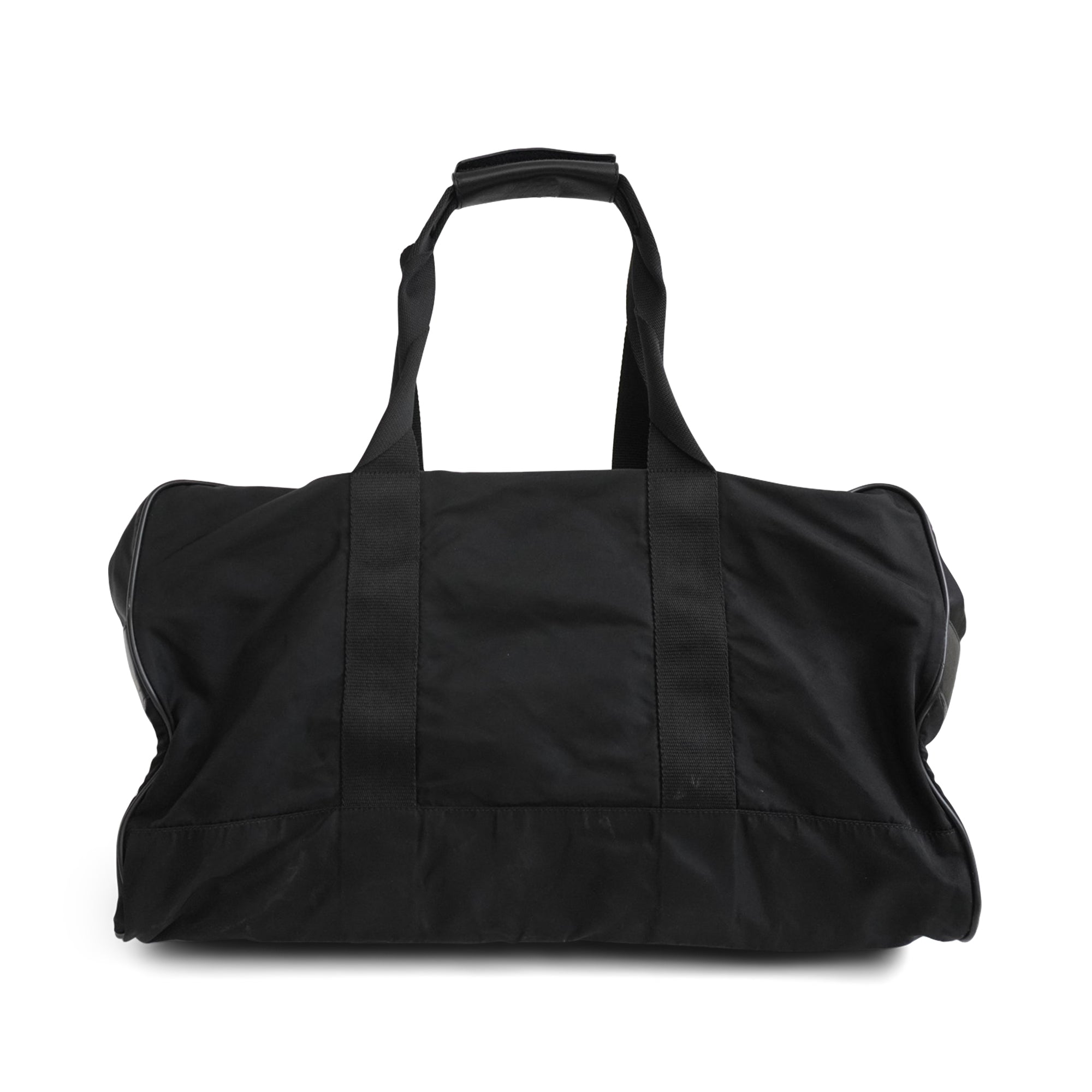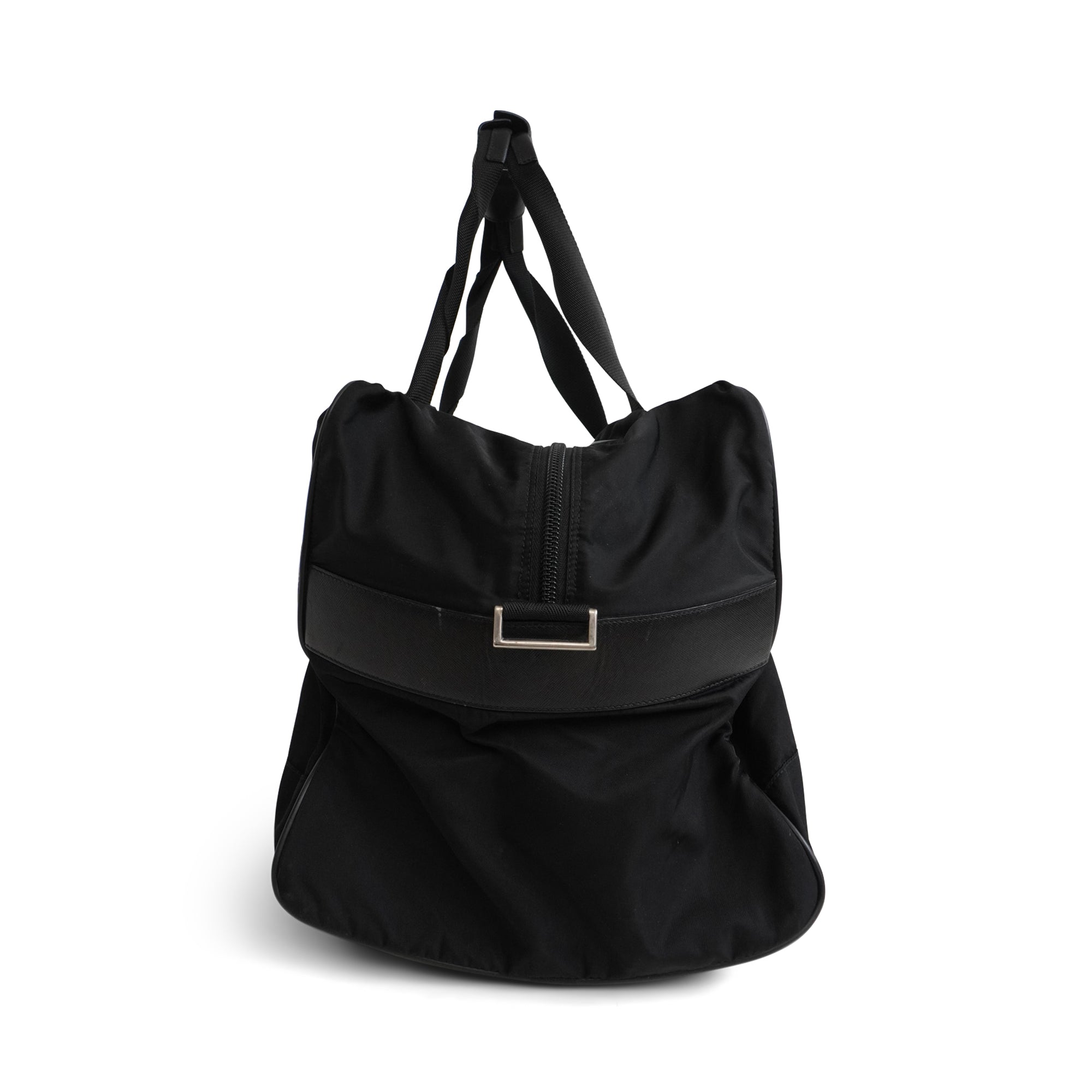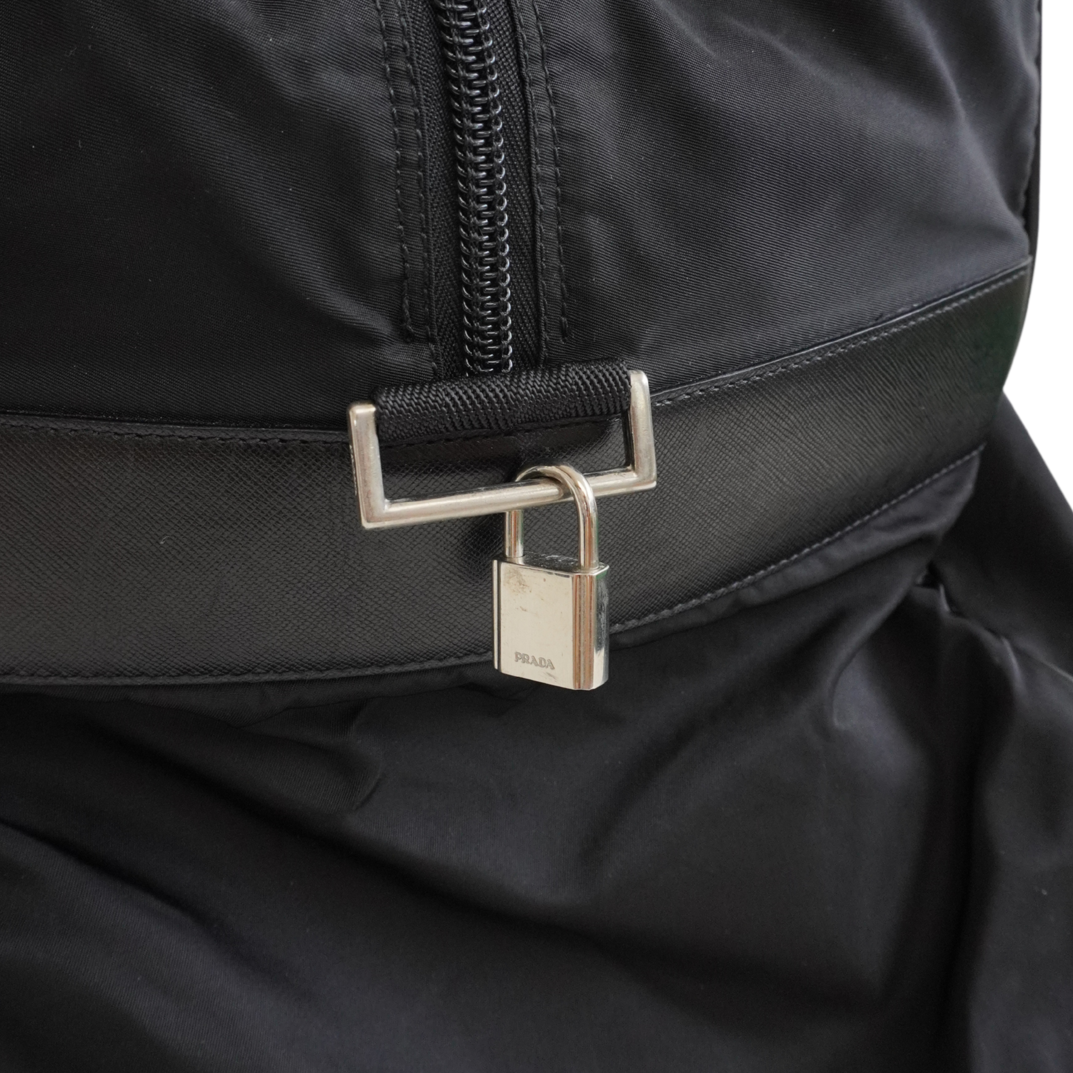 Prada duffle bag in black nylon with silver triangle logo plaque, saffiano leather accents, and nylon web handles. Features a two way zip closure with leather velcro strap reenforcement, logo jacquard lining, and interior zip pocket. The bag has hardware for attaching a longer strap but doesn't include one.