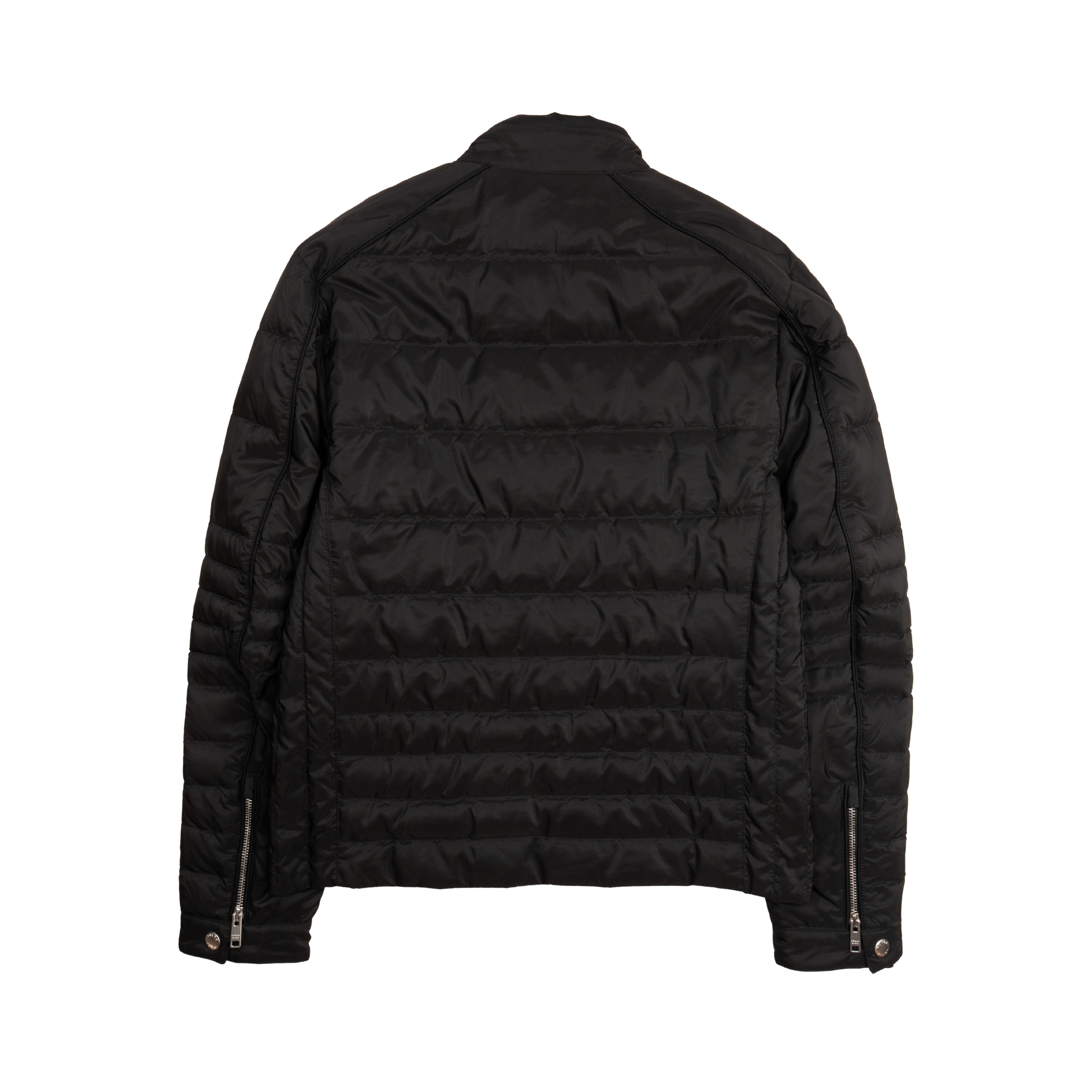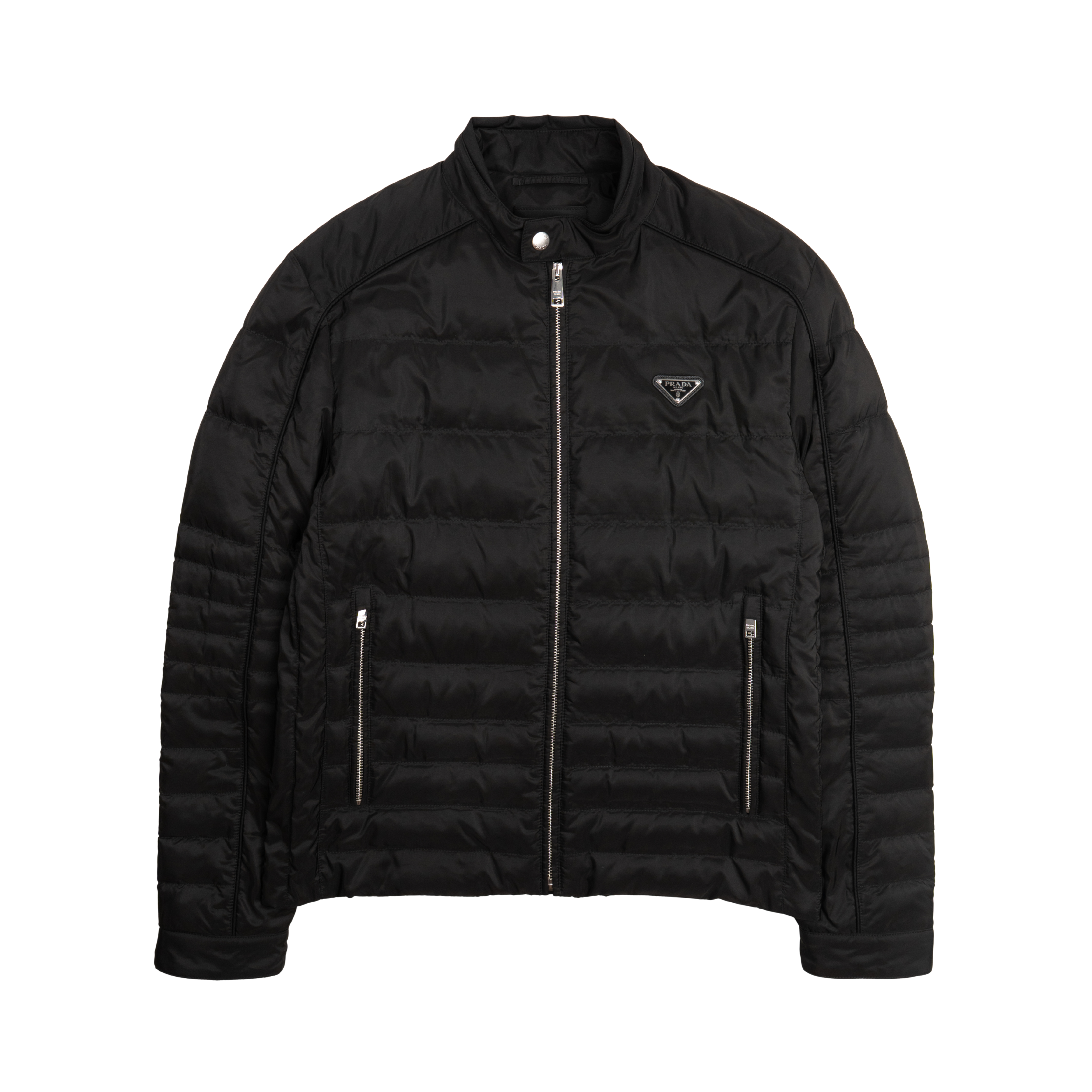 Prada lightweight puffer jacket in black nylon with two front zip pockets, front zip closure in silver hardware, neck snap panel and signature triangular logo on the chest.