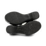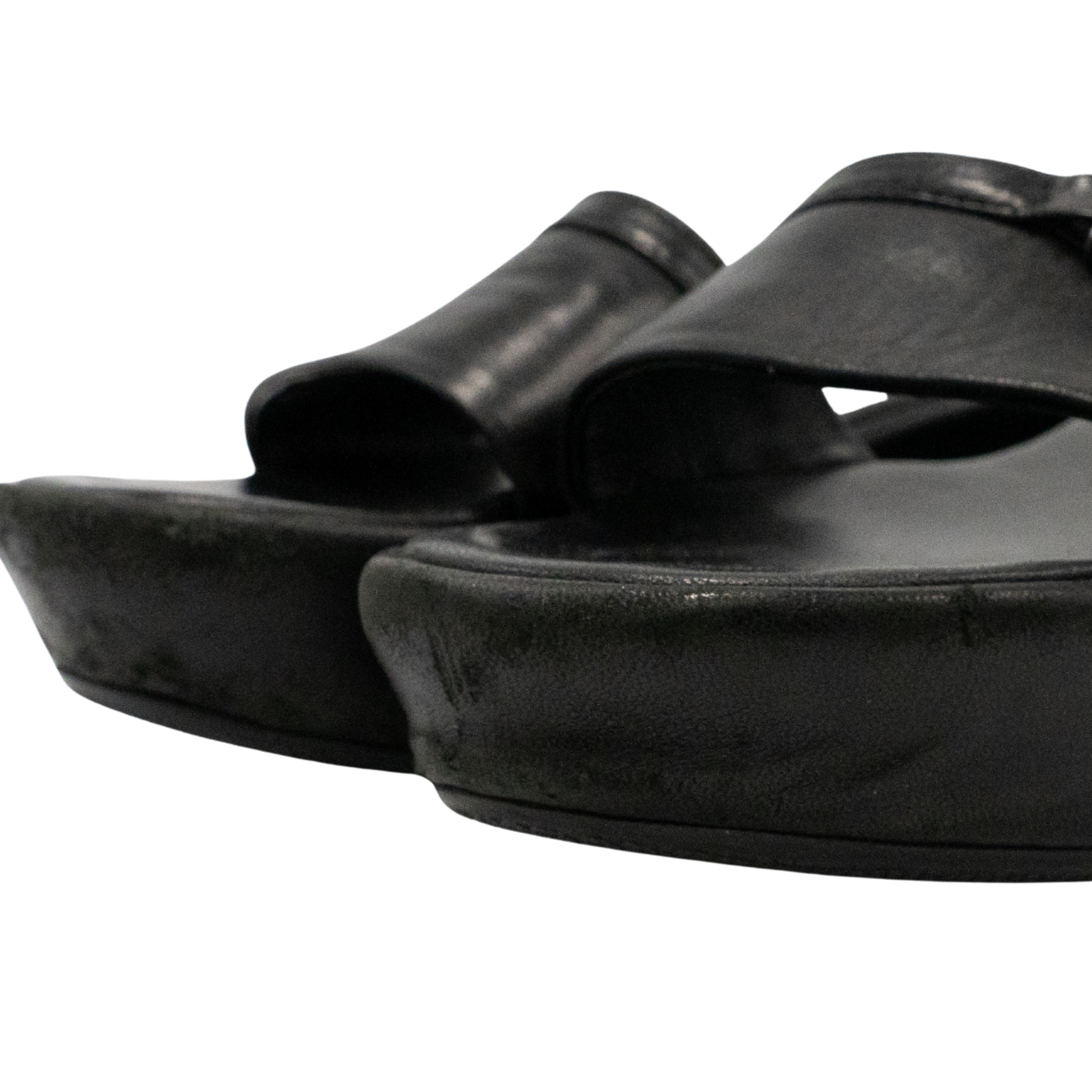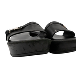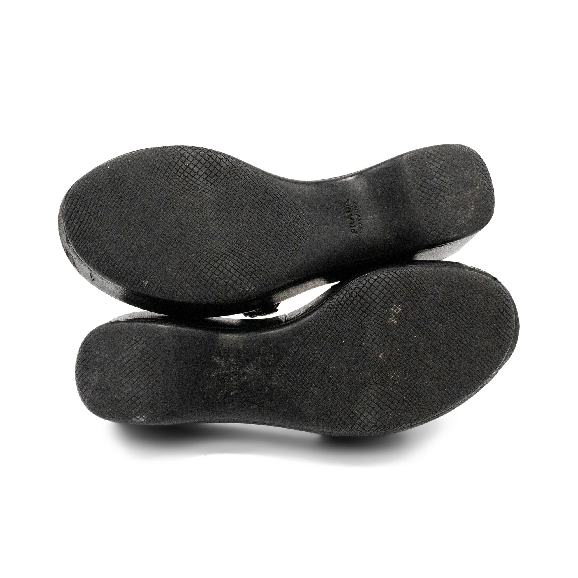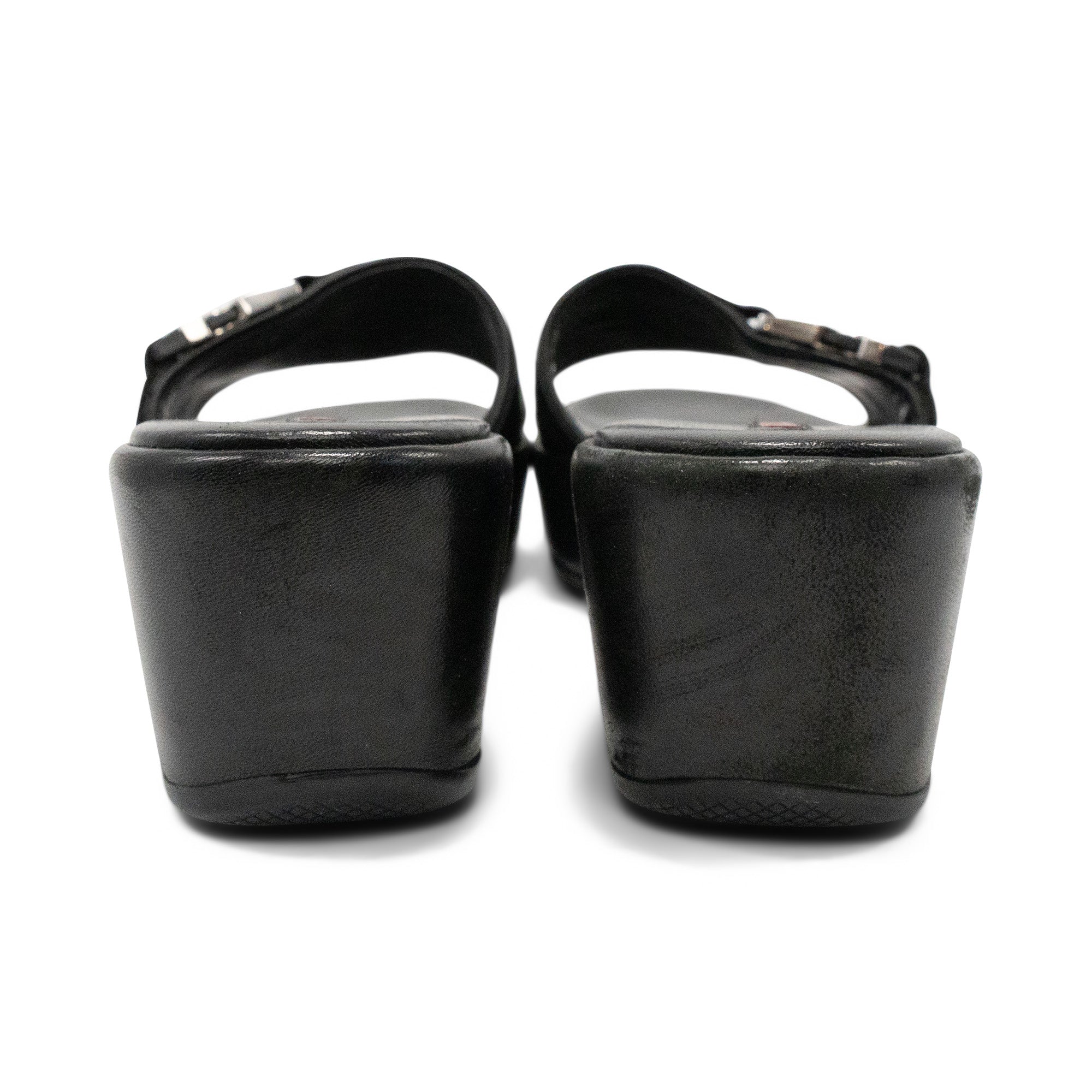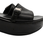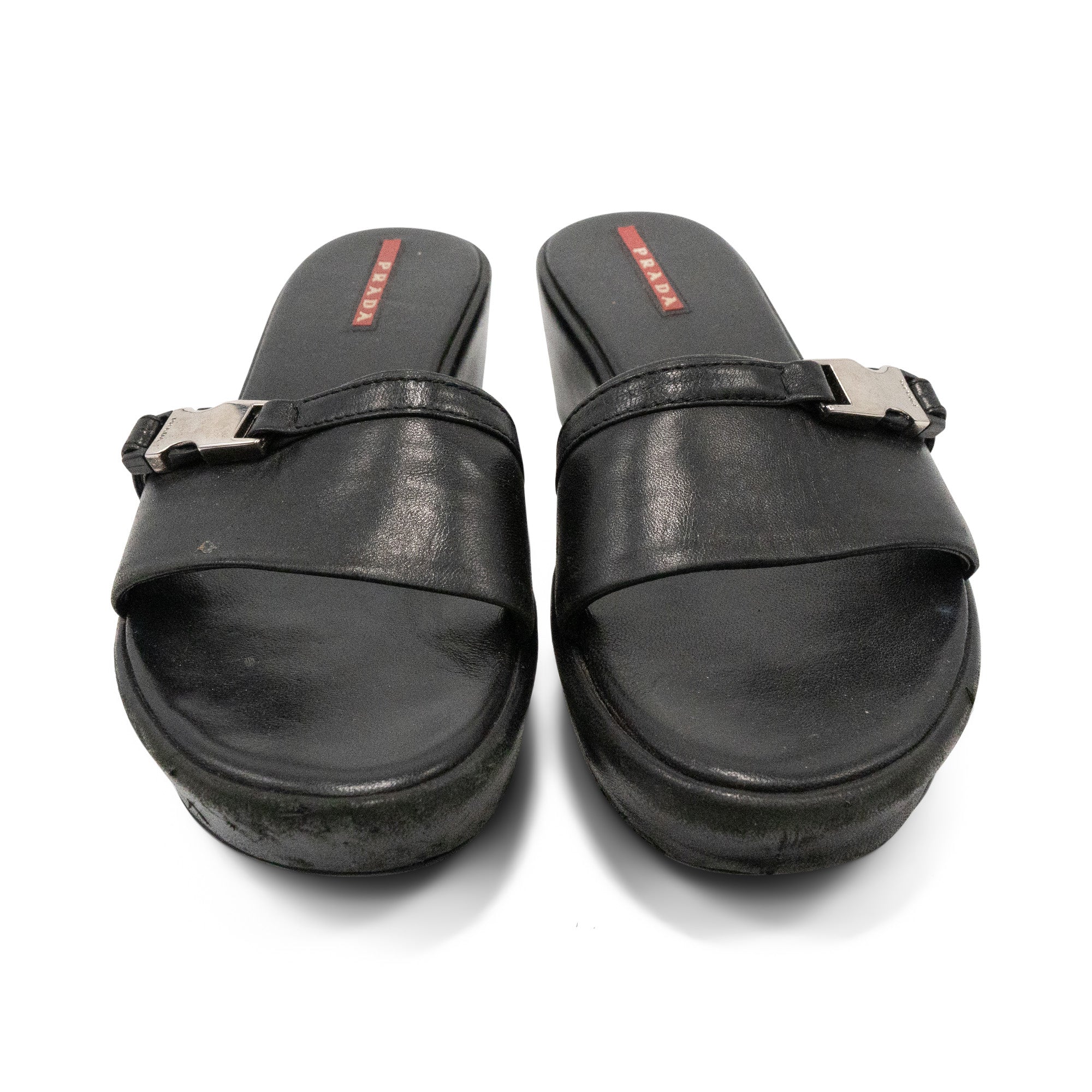 Prada platform sandals in black leather with thick front strap and silver buckle detail.