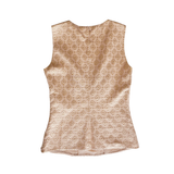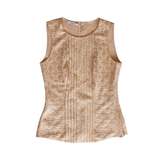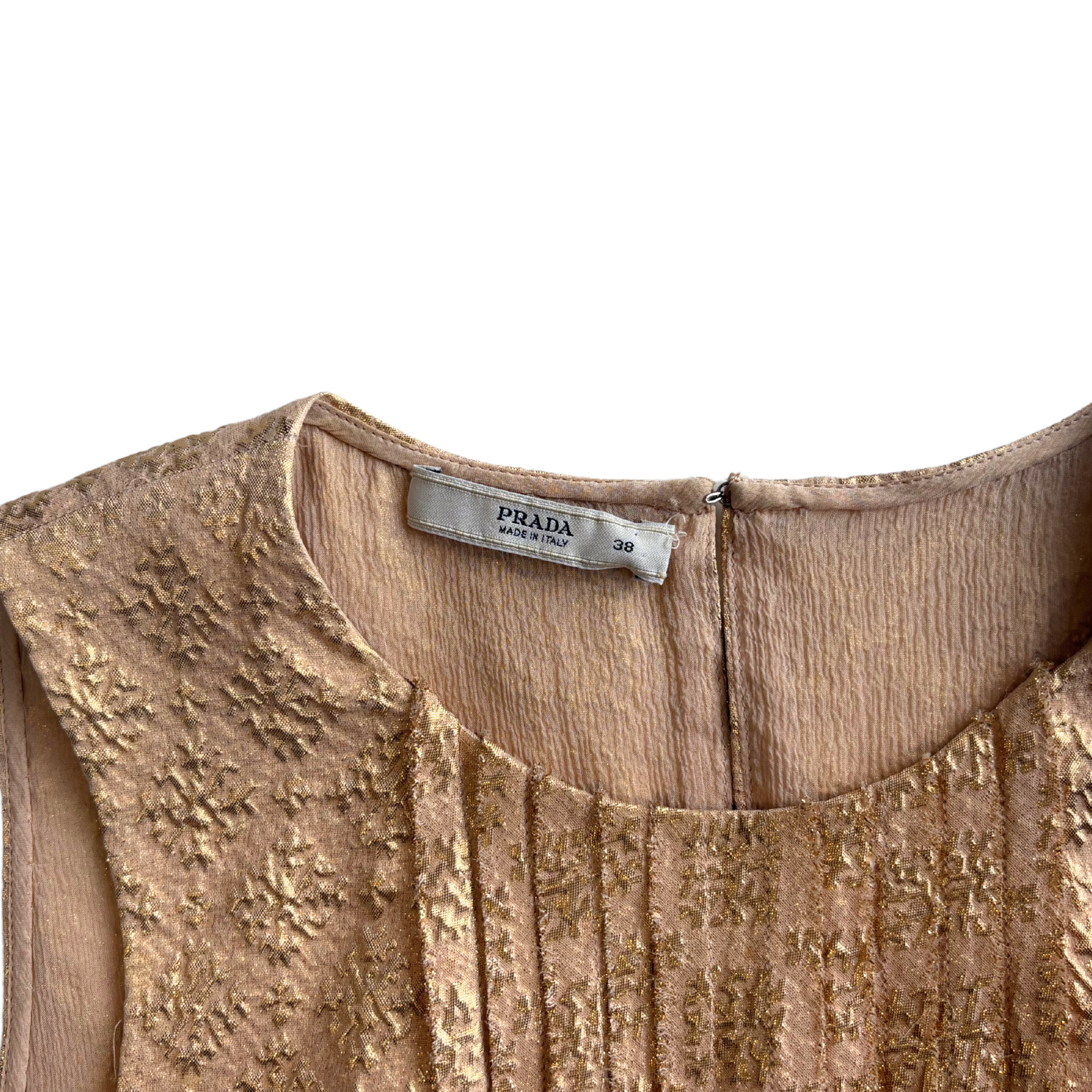 Prada tank top in peach silk with an all-over raised metallic gold diamond print, pleating down the chest, and a hook-eye closure at the back neckline.