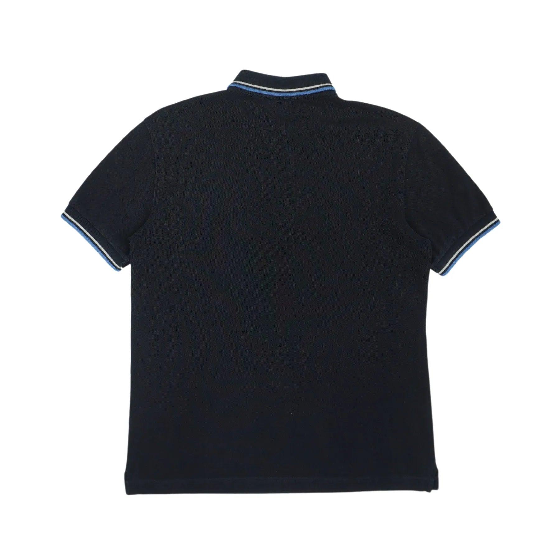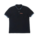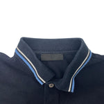 Prada polo top in navy cotton with blue and white striped trim and a red rubberized logo on the chest.