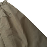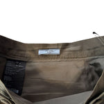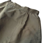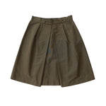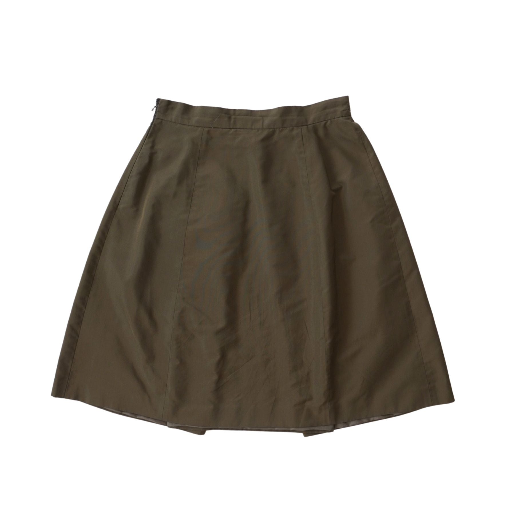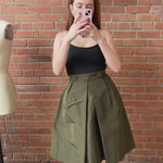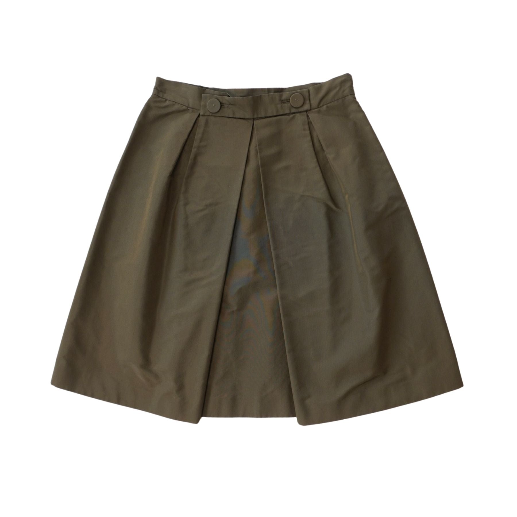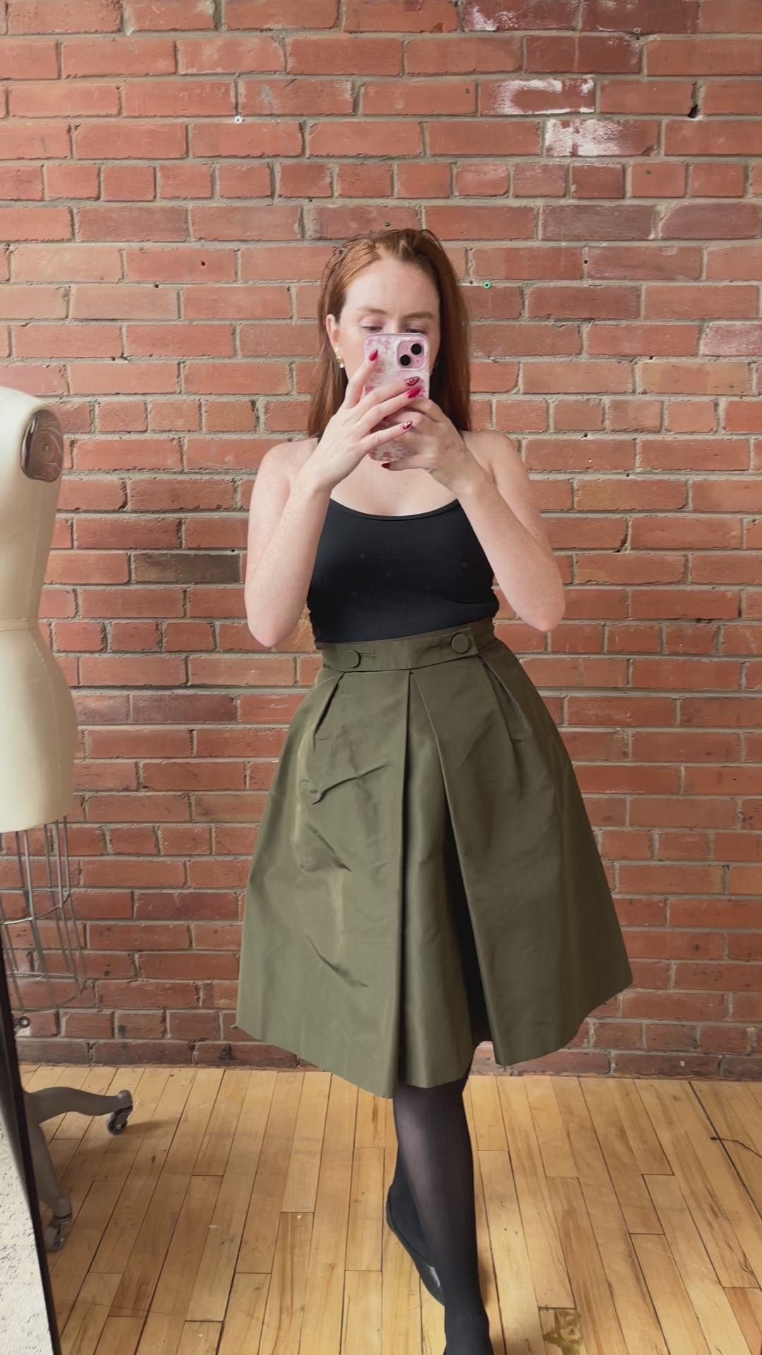 Prada high-waisted pleated skirt in olive green silk with a button detail on the waistband.