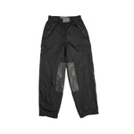 Prada tapered track pants in black nylon with black leather patches on the legs and behind, large zip pockets in silver hardware, and a belt at the waist with a large logo-embossed square buckle.