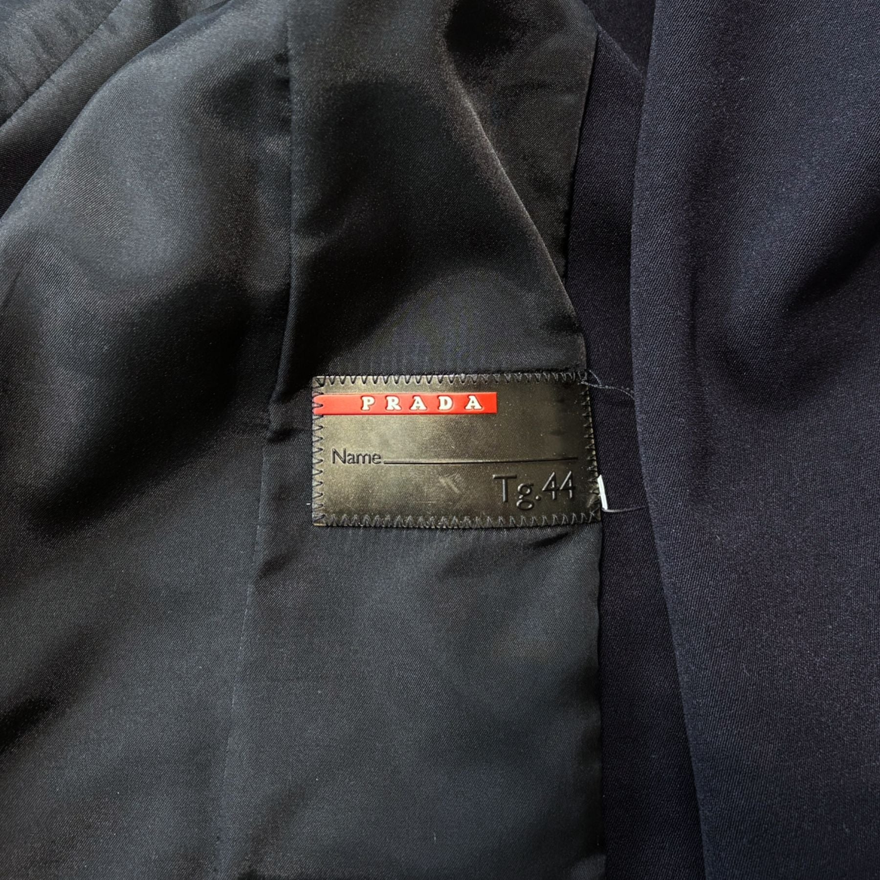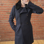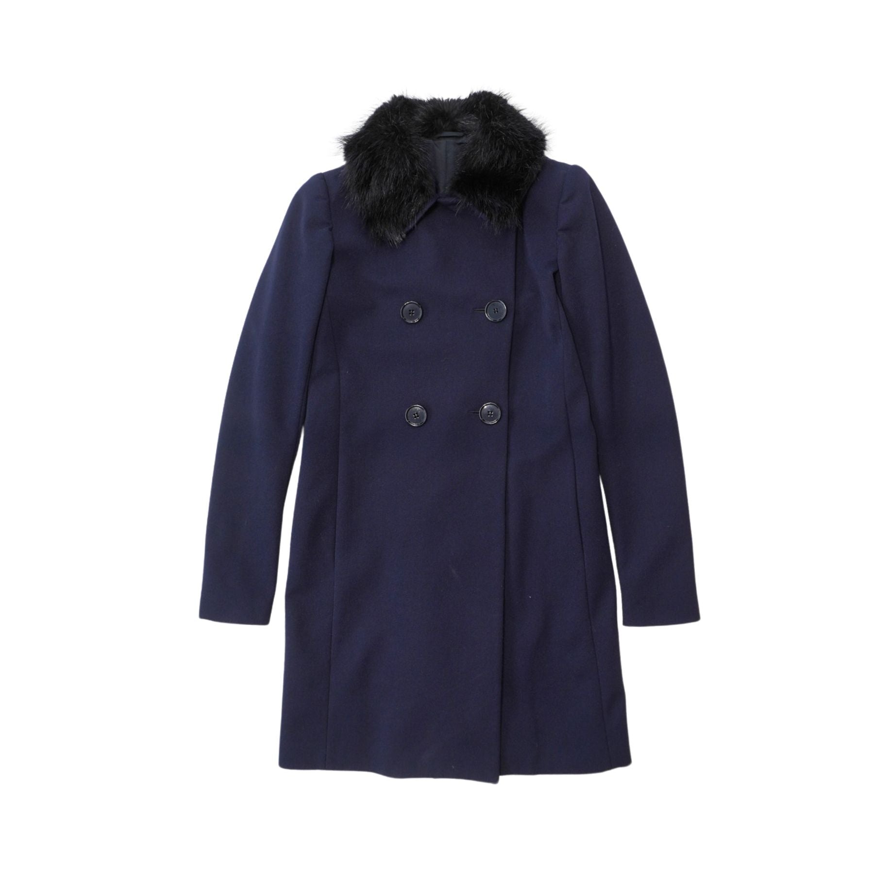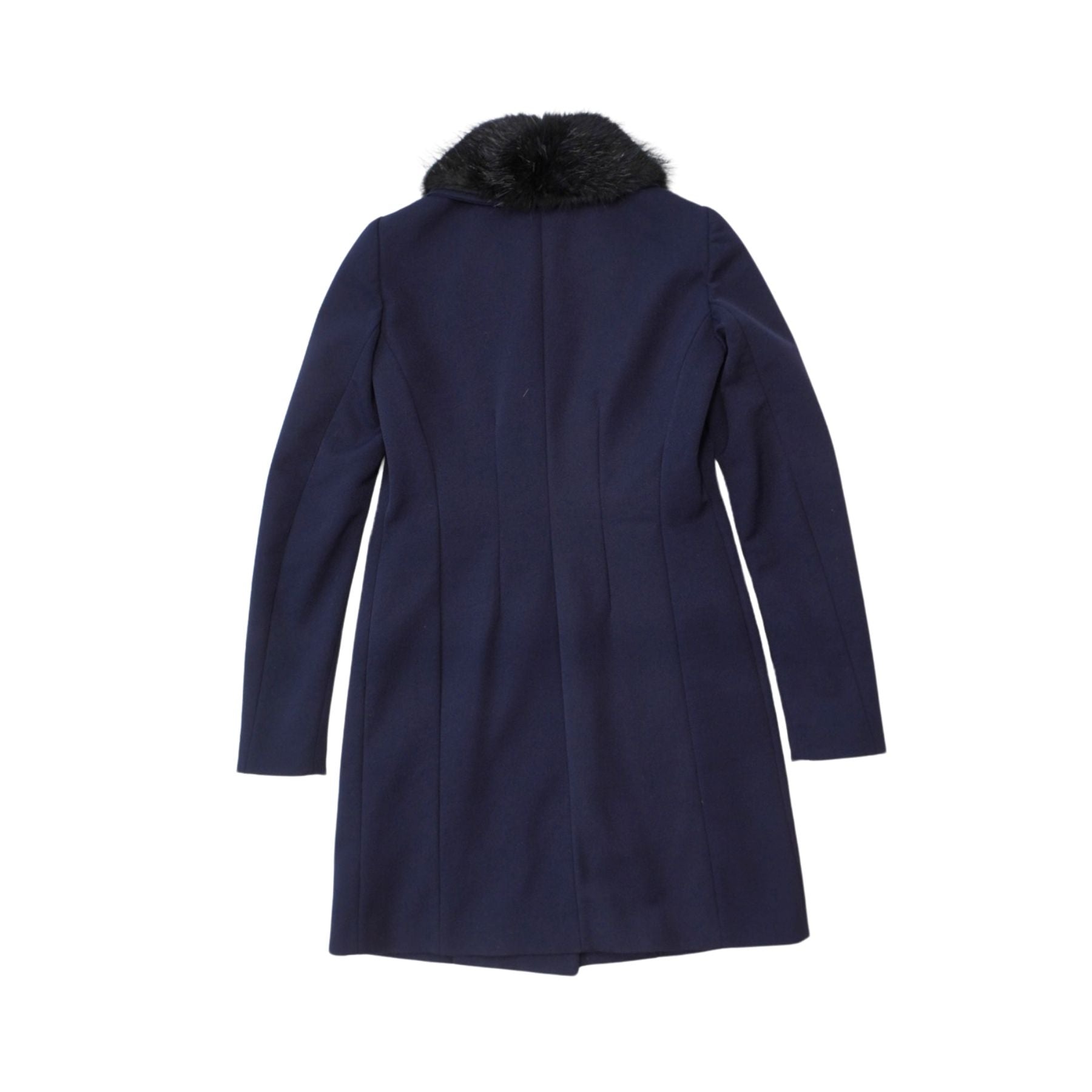 Prada peacoat in navy blue with a double-breasted front-button opening with large navy buttons, side slip pockets, back pleating, and a black beaver fur collar.
