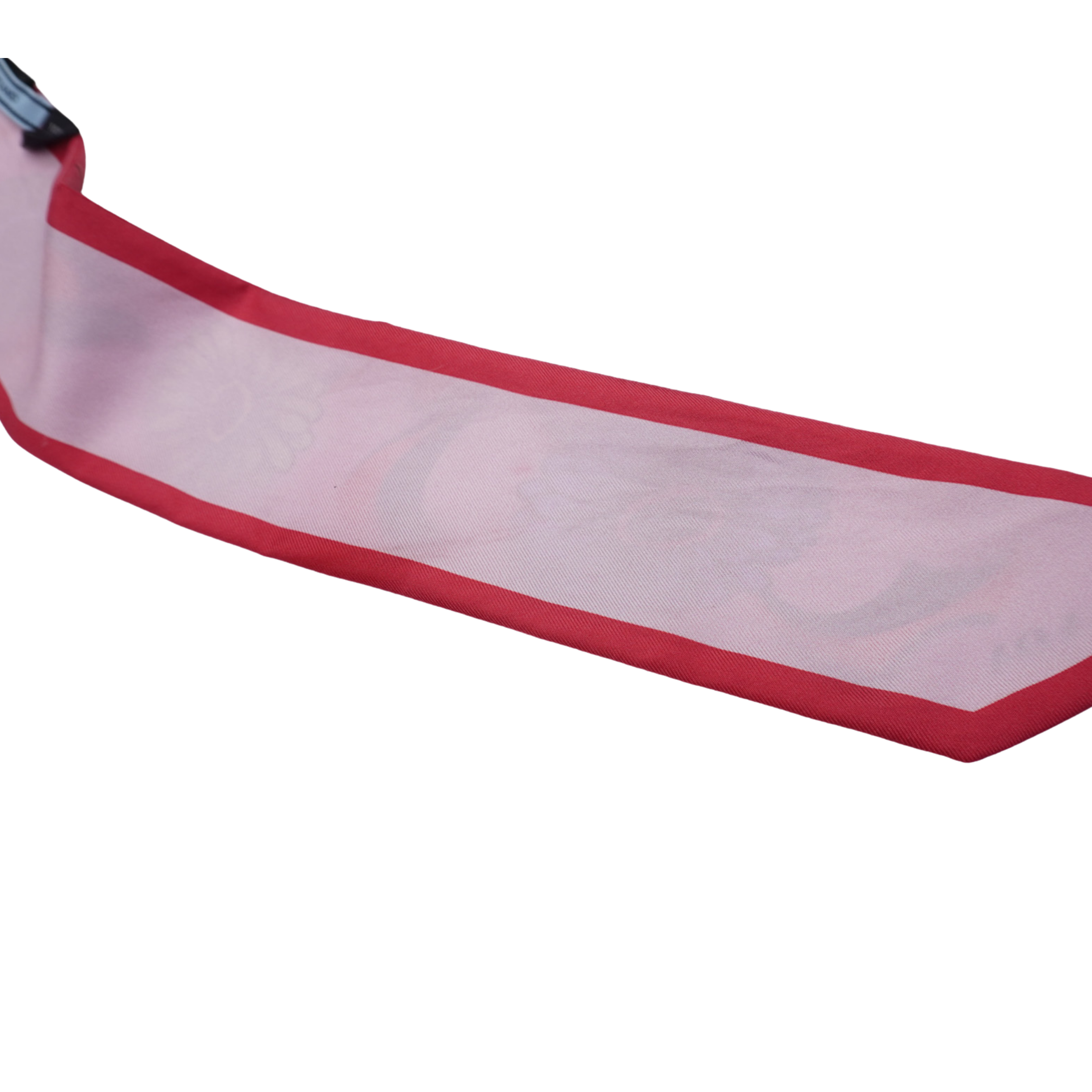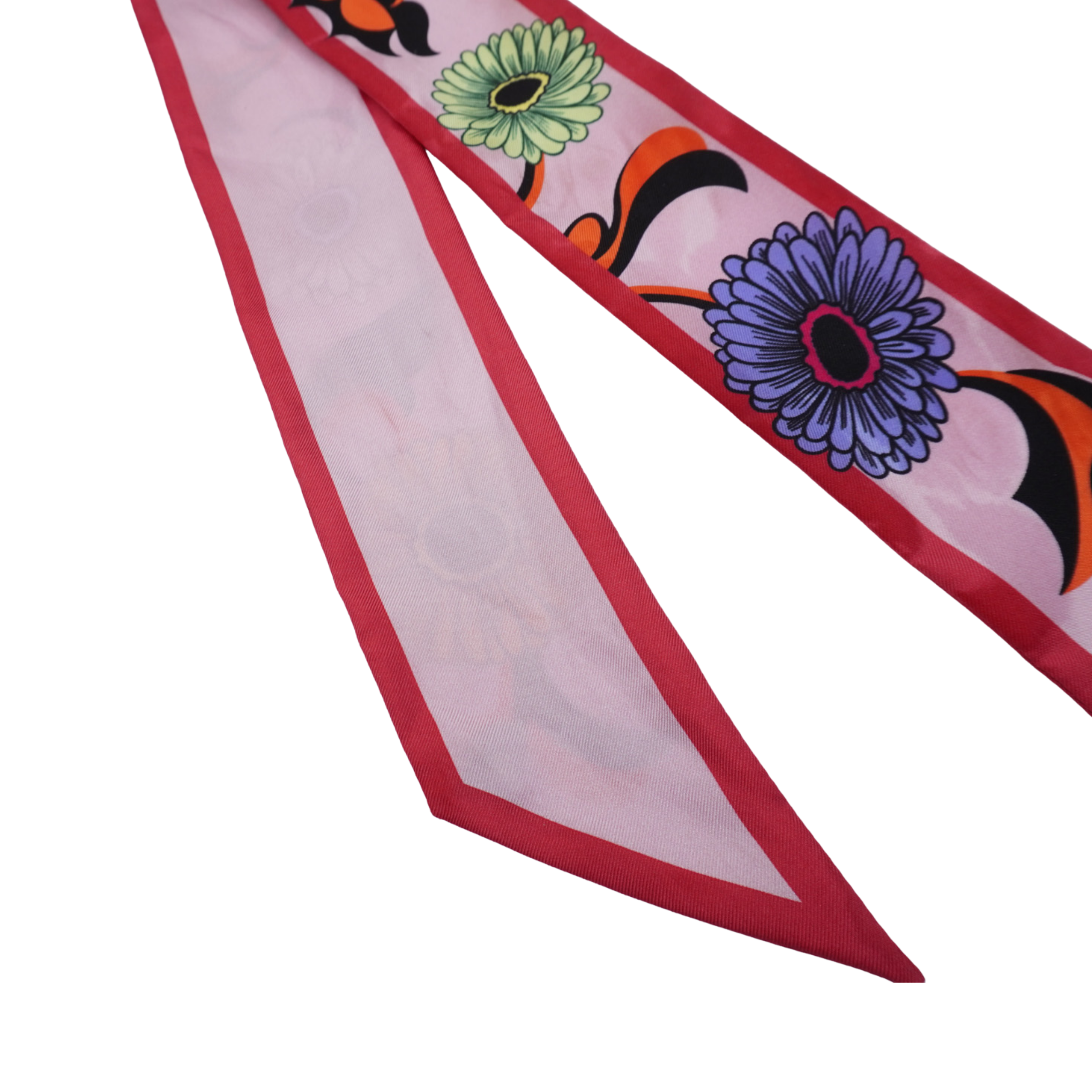 Prada silk twill skinny scarf in light pink with multicolour floral print and hot pink trim.