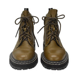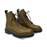 Proenza Schouler olive green leather combat boots with white contrast stitching and a black rubber sole with white stitching. Features brown lace-up and side zip closure in silver hardware.
