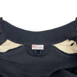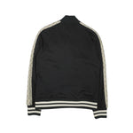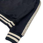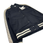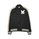 Red Valentino varsity jacket in black with cream panels down the arms with black trim overlay. Features black and white striped ribbed arm cuffs and waist hem, white layered bird embellishment with rhinestones, two side slip pockets, and a snap button front closure.