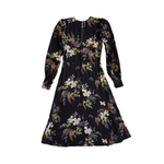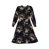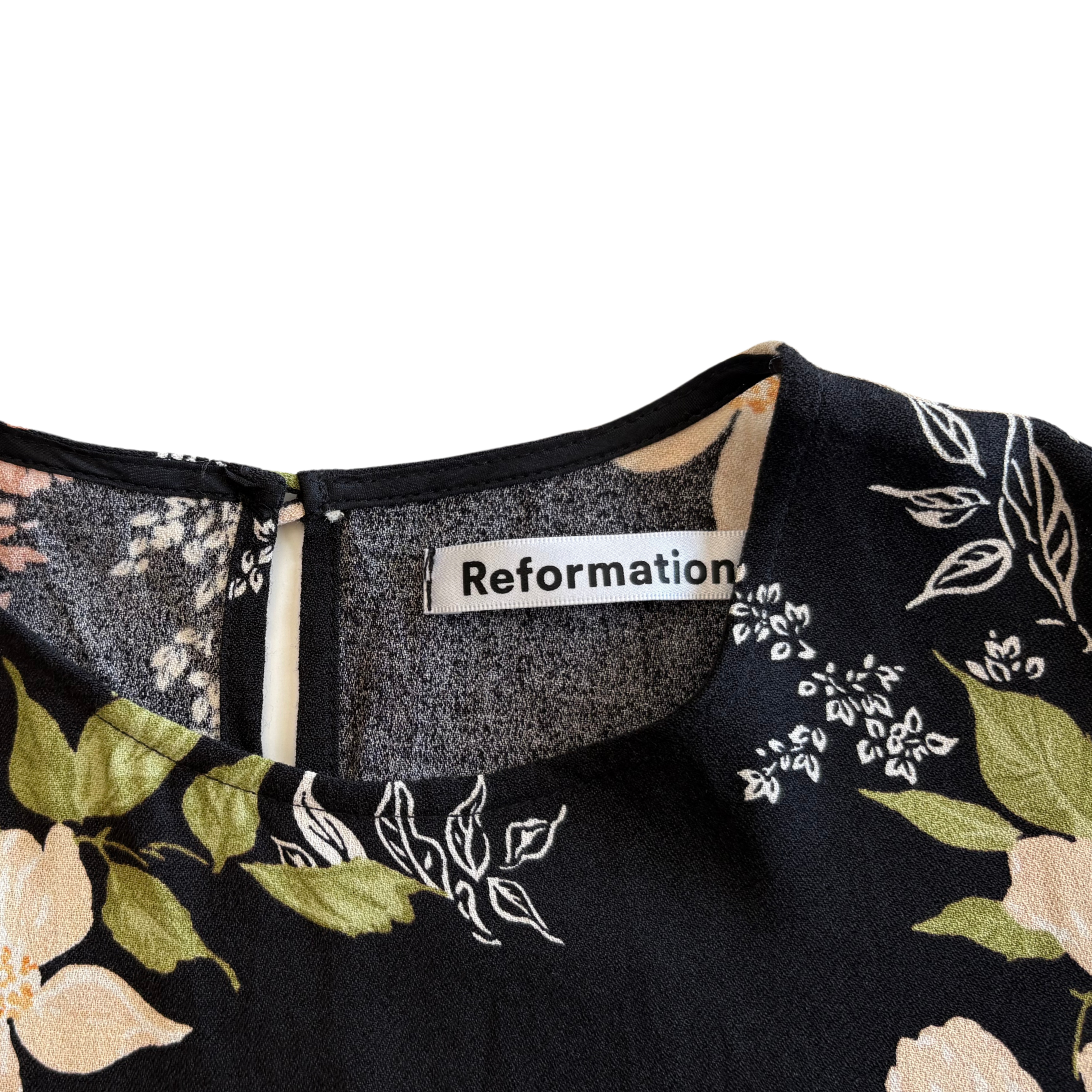 Reformation 'Kellen' midi dress in black viscose with an an all-over pink, green and white floral print, puffed sleeves, and a slit opening at the back neck.