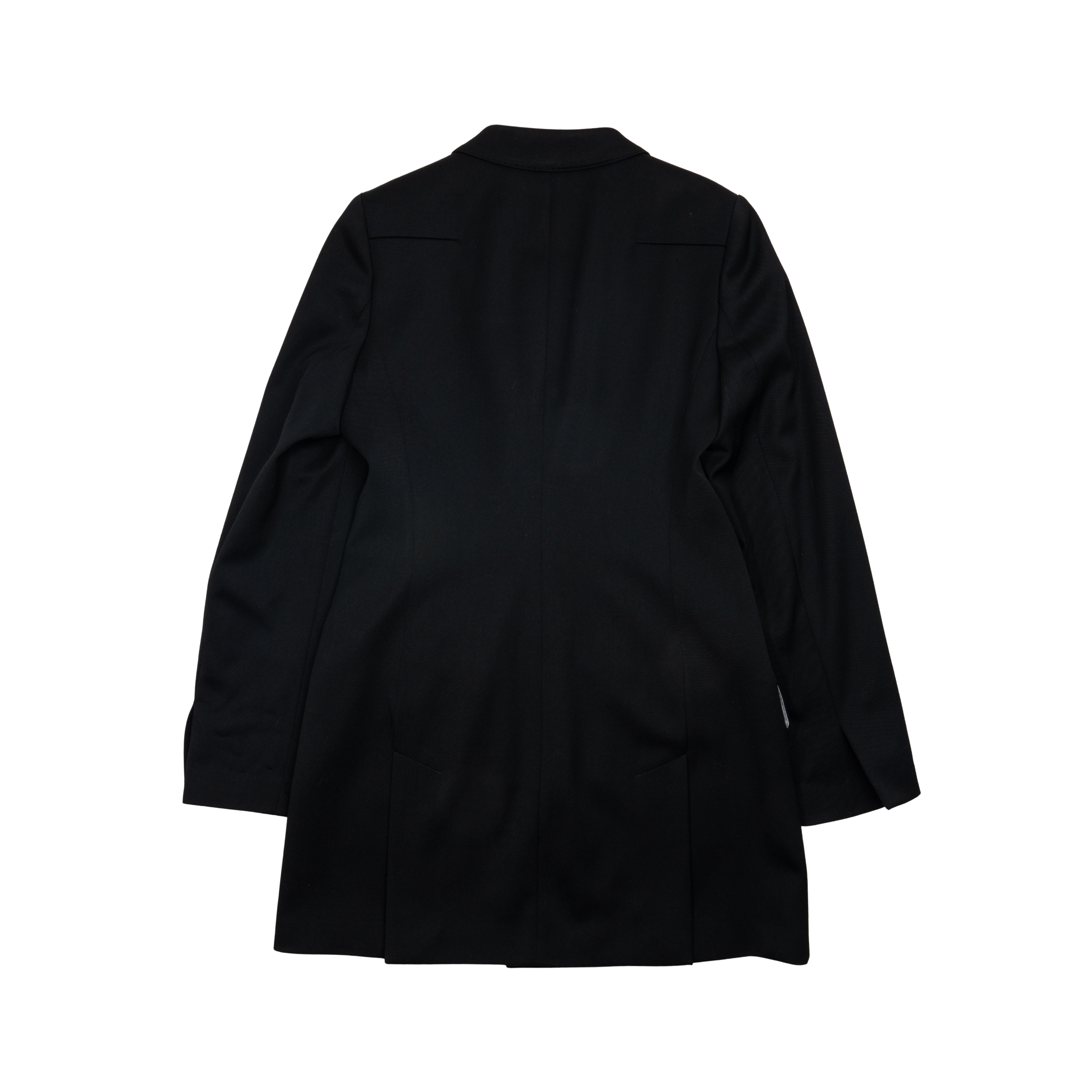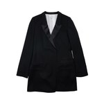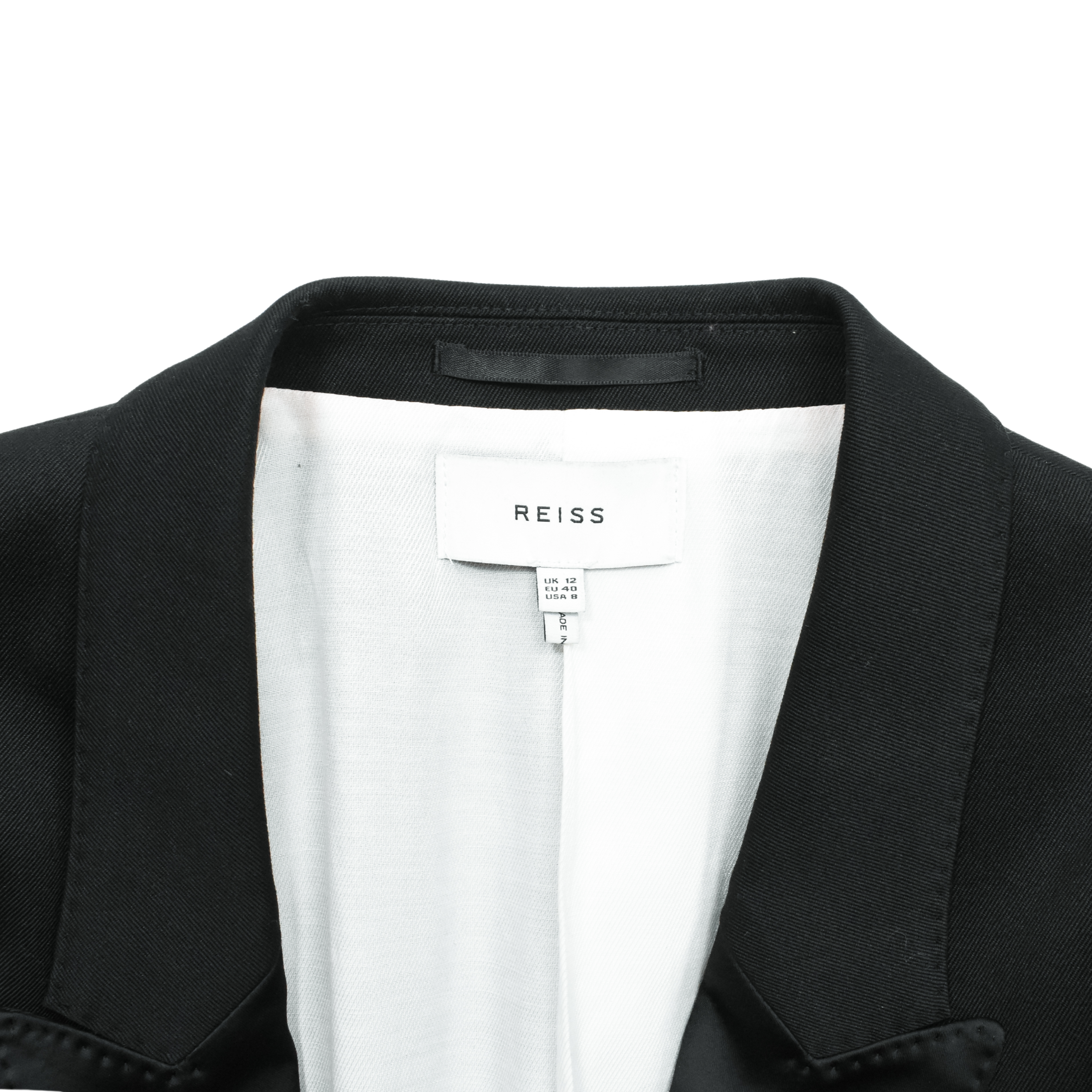 Reiss black double-breasted blazer dress with a satin lapel collar, four faux pockets, faux back vent and hidden buttons.