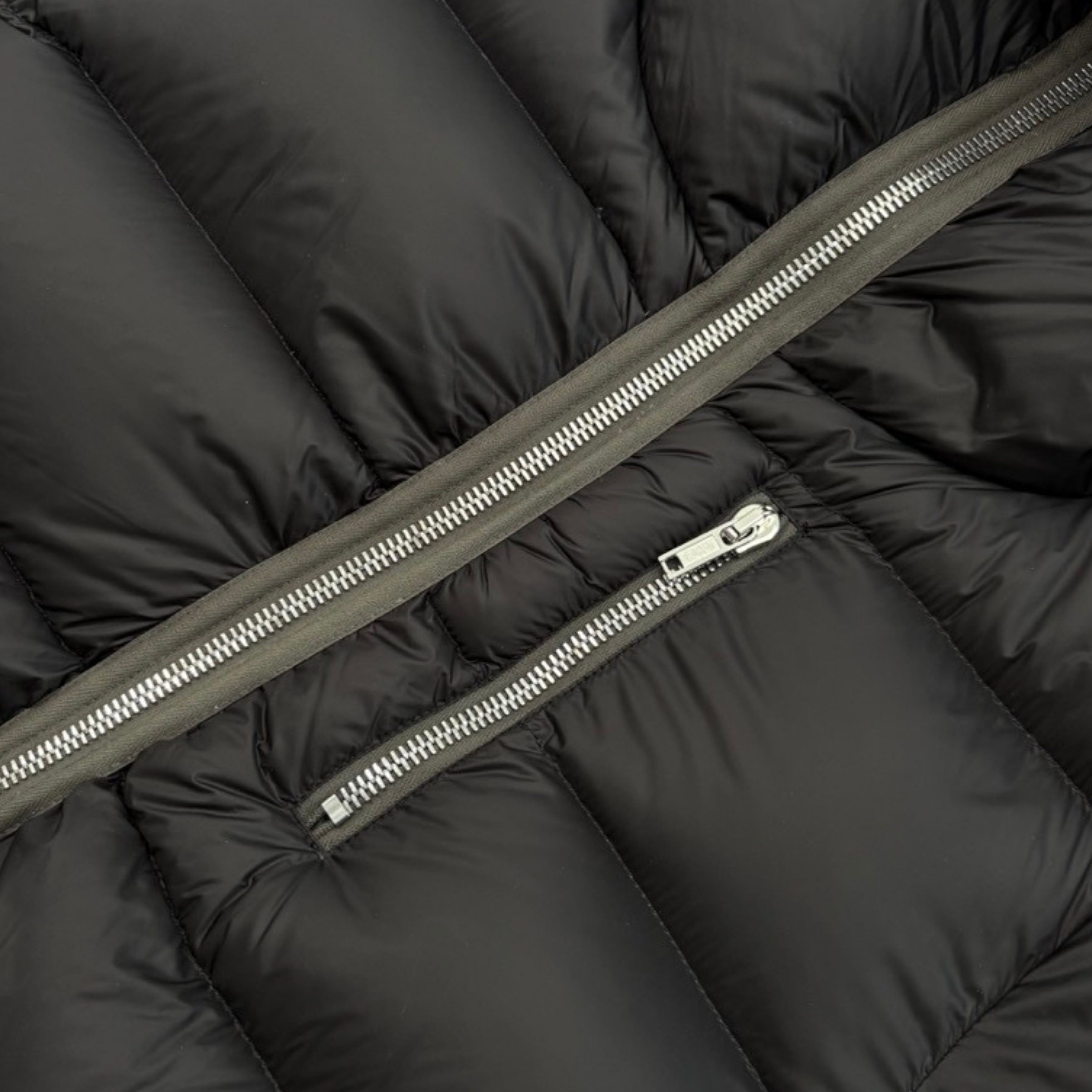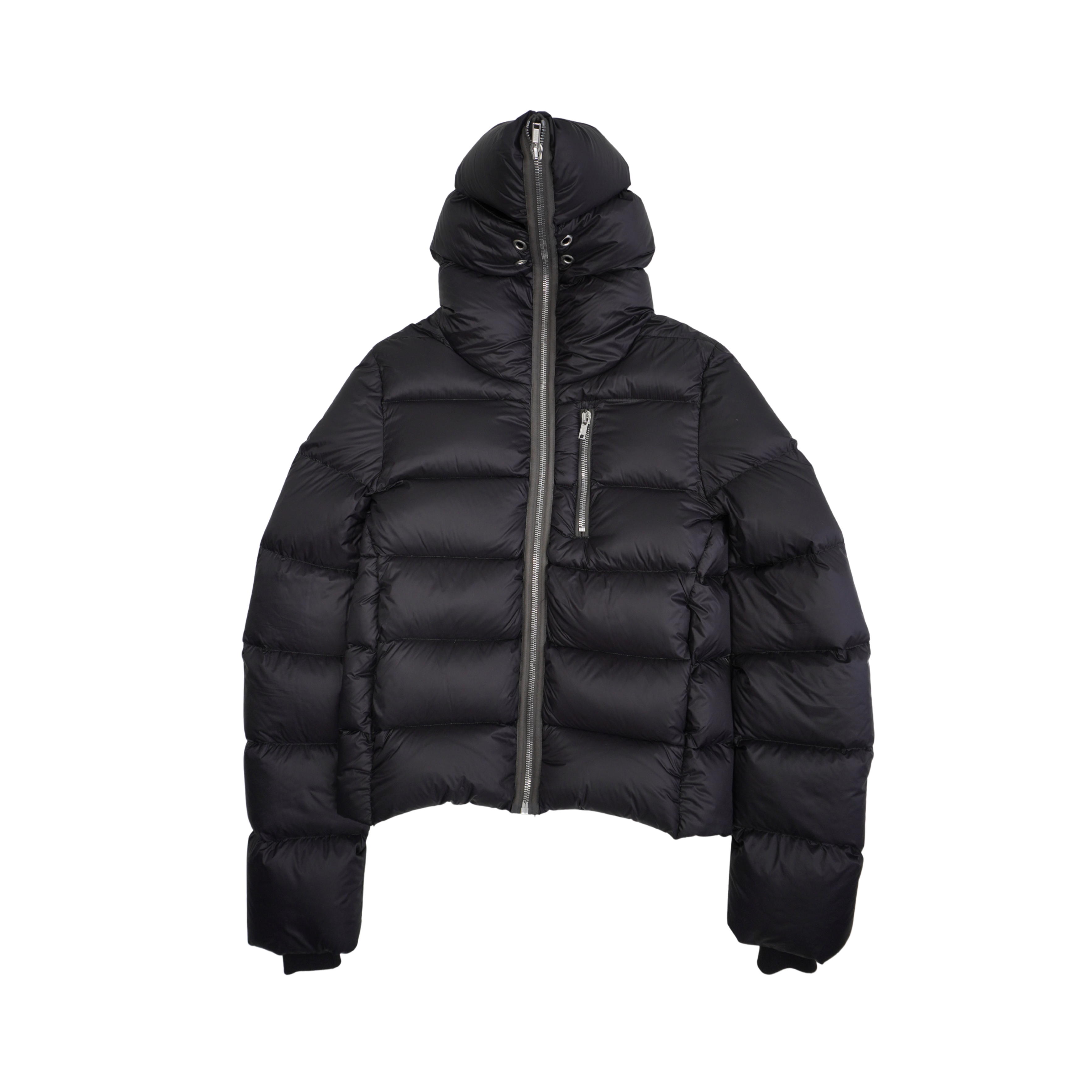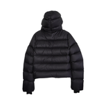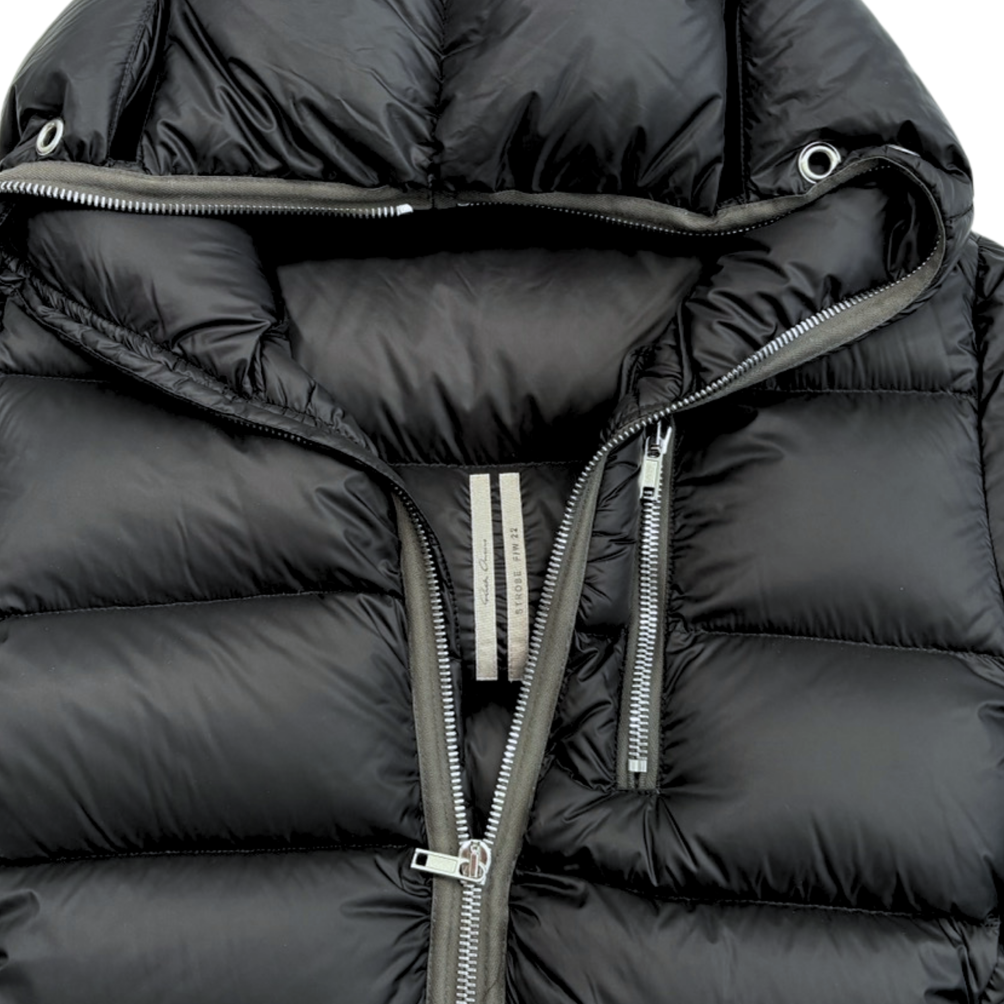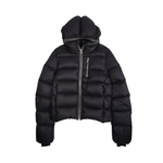 Rick Owens 'Gimp' Strobe F/W22 short, quilted black puffer jacket with a zipper that goes all the way up the hood. Features aglet cut outs on the face, zipper chest pockets, snap hand pockets, and ribbed wrist cuffs.