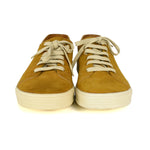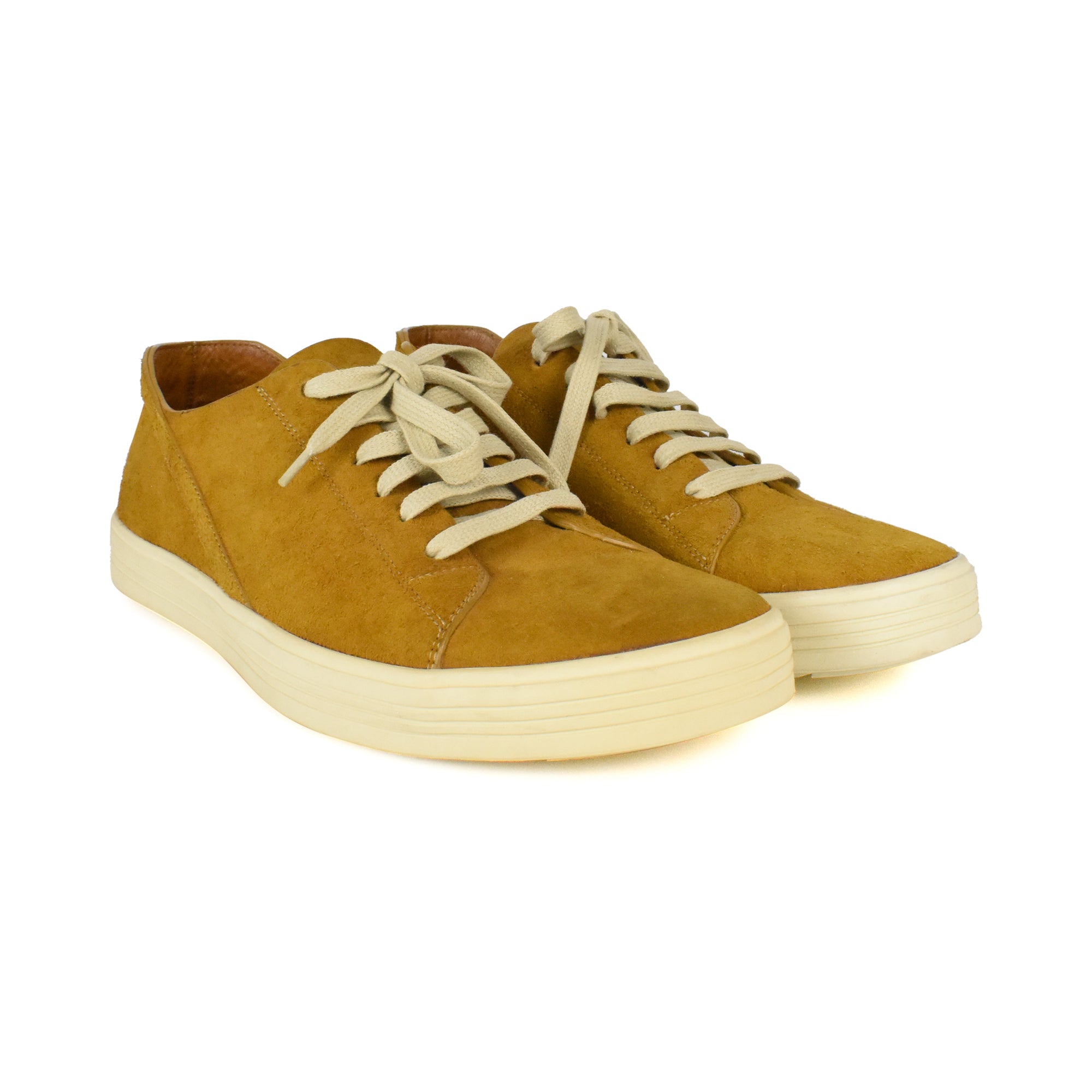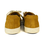 Rick Owens low-top sneakers in mustard yellow suede with a cream rubber sole. Features cream flat laces, mustard yellow glue trim, and embossed logo on the upper sole heel.