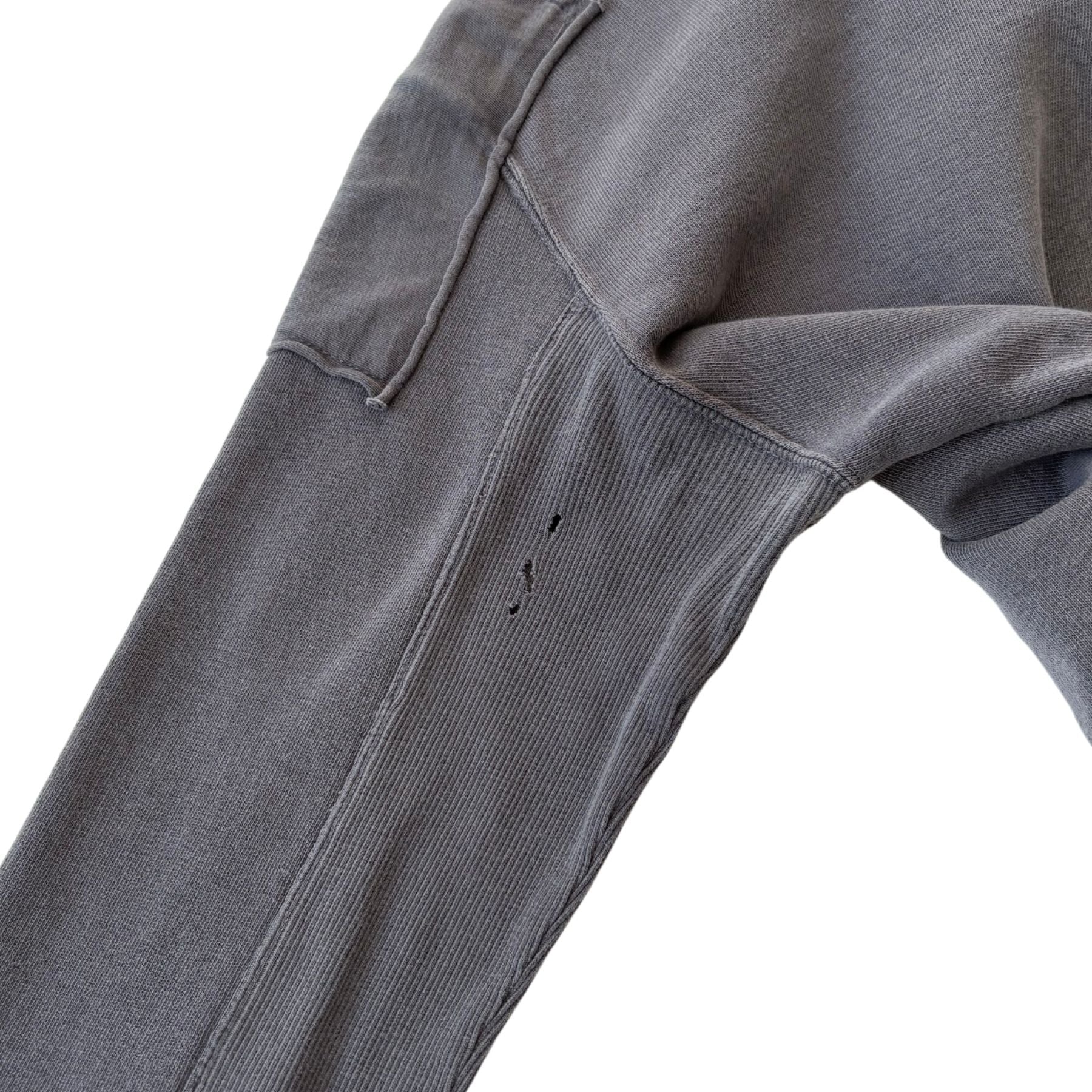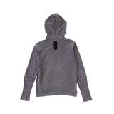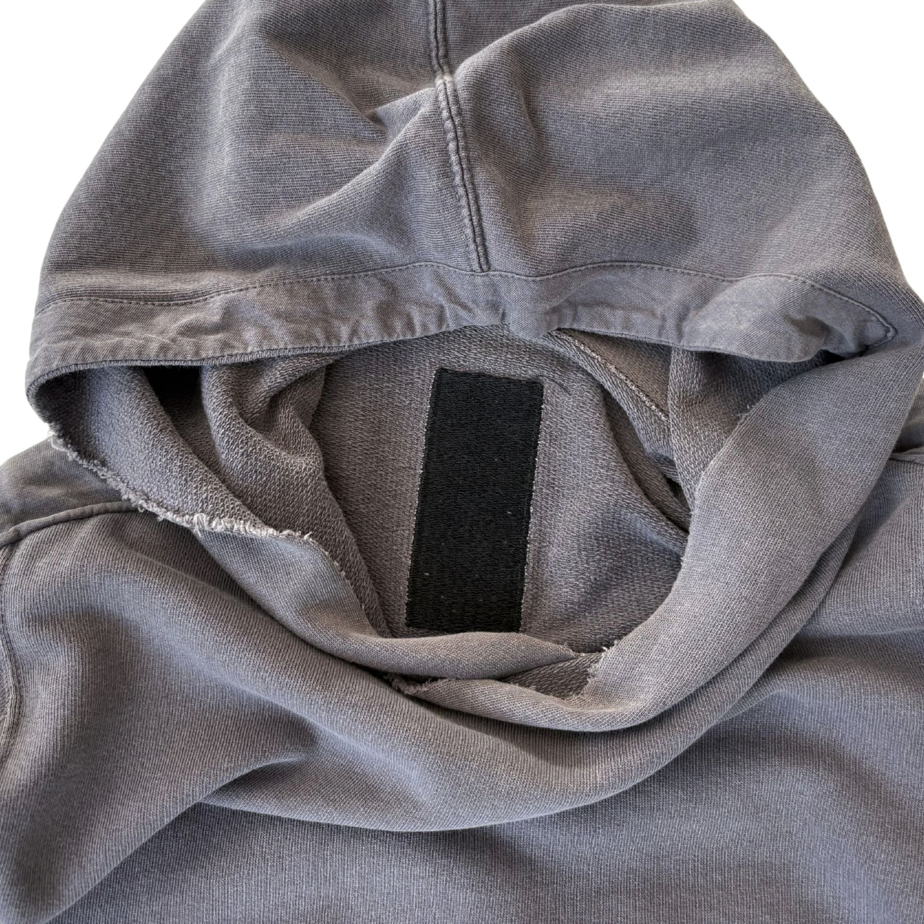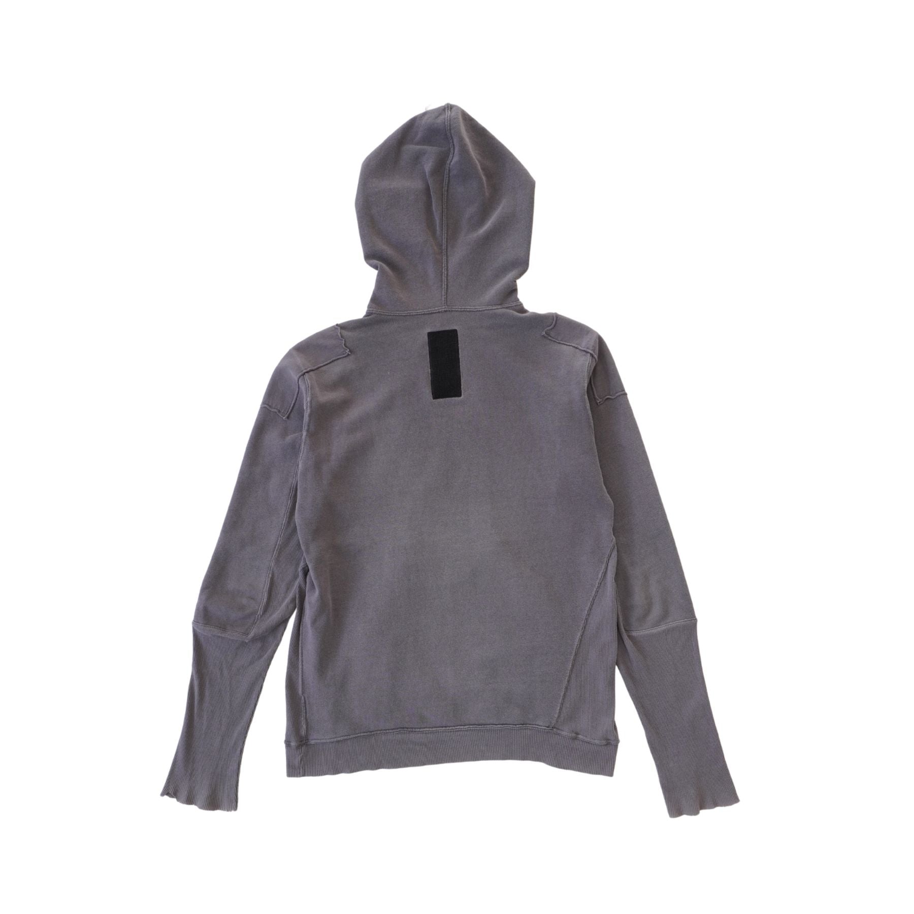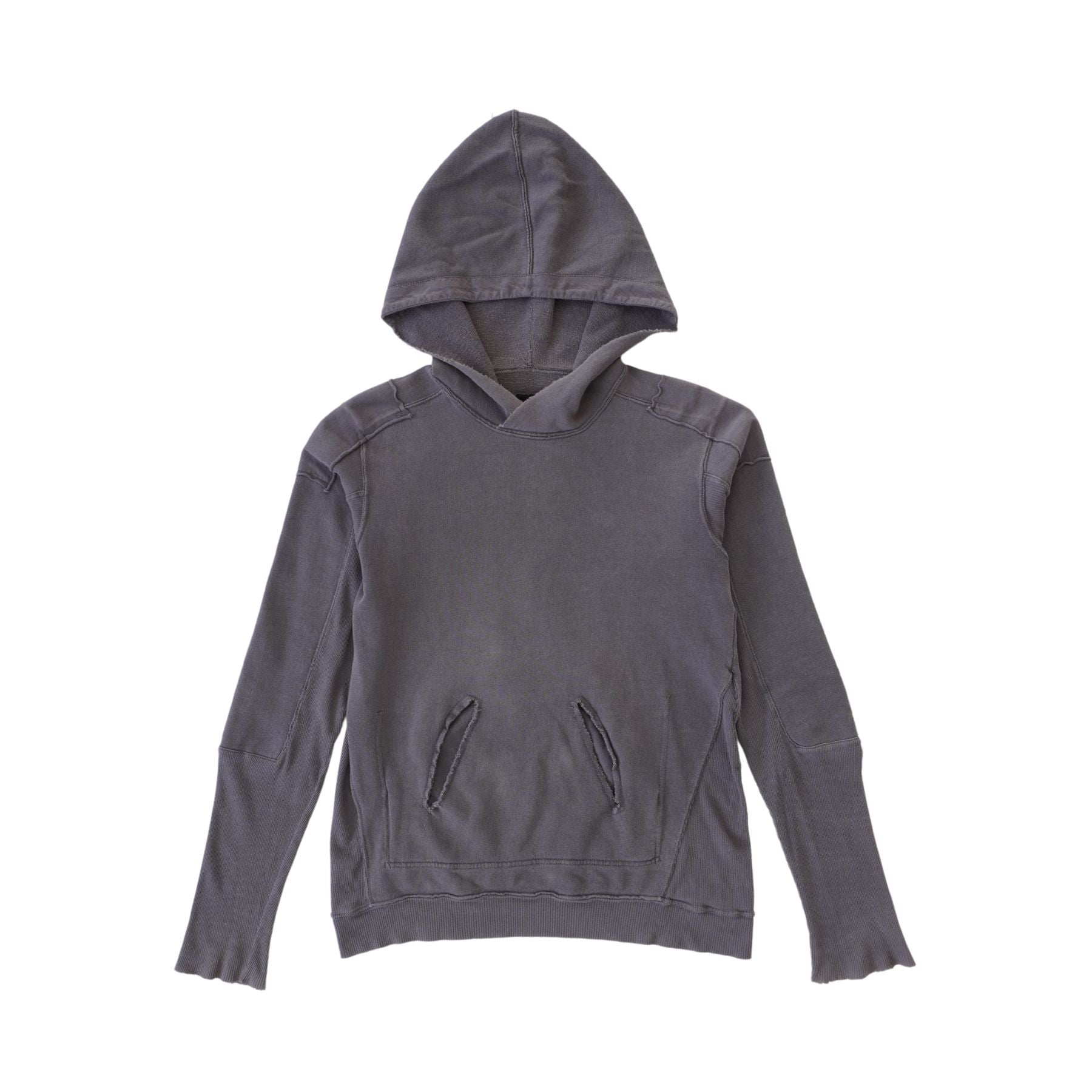 Rick Owens 'Owenslab' long-sleeve thin hoodie in washed grey cotton. Features ribbed sleeve and side panels, a kangaroo front pocket with distressed cutout holes, raw hems, and shoulder patch detailing.