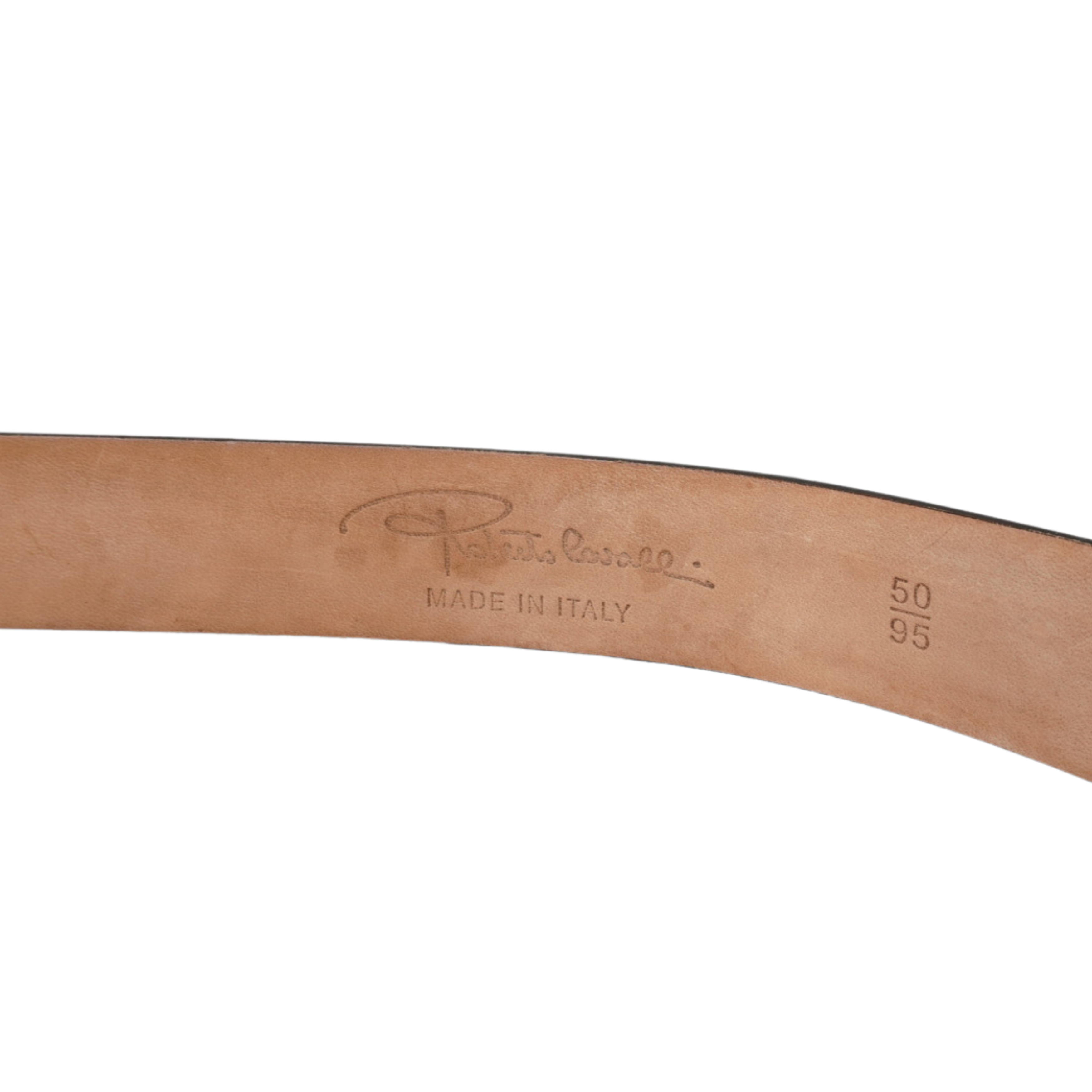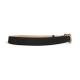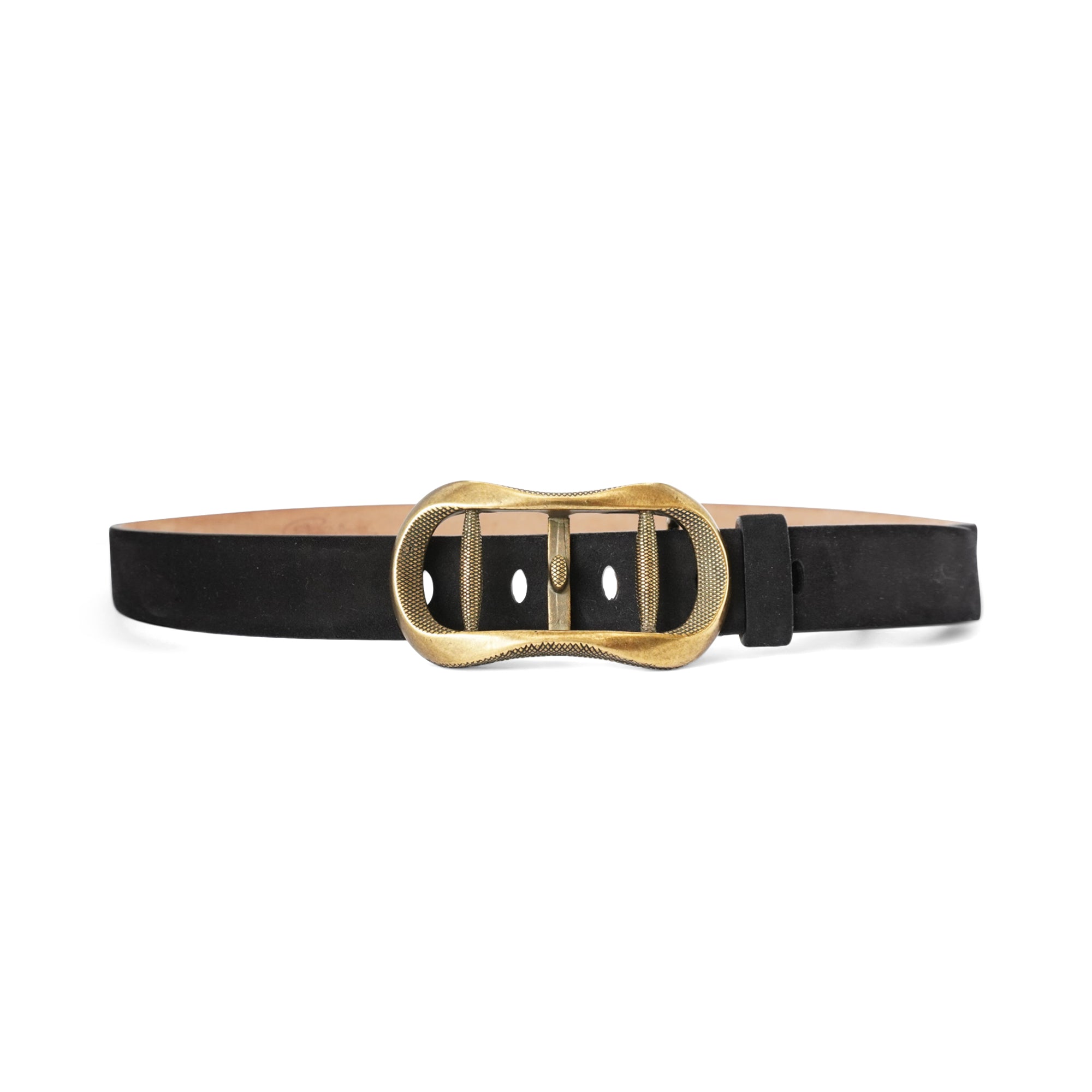 Roberto Cavalli belt in black suede with a large aged gold buckle with diamond texture embossing.