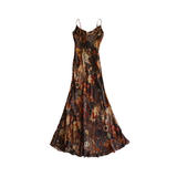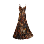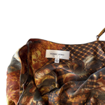 Ronny Kobo 'Damian' maxi dress in brown, black and orange multi-pattern collage printed silk with a draped neckline and adjustable straps.