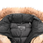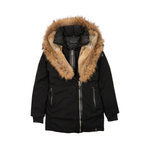 Rudsak 'Mantic' Parka in a mid-length, hooded cut in black nylon with a brown fur lined hood, and black leather trim details. Features a high neck inner bib, fur trim coming down in an asymmetrical V neckline in the front, zip pockets on the front and storm sleeves.