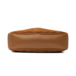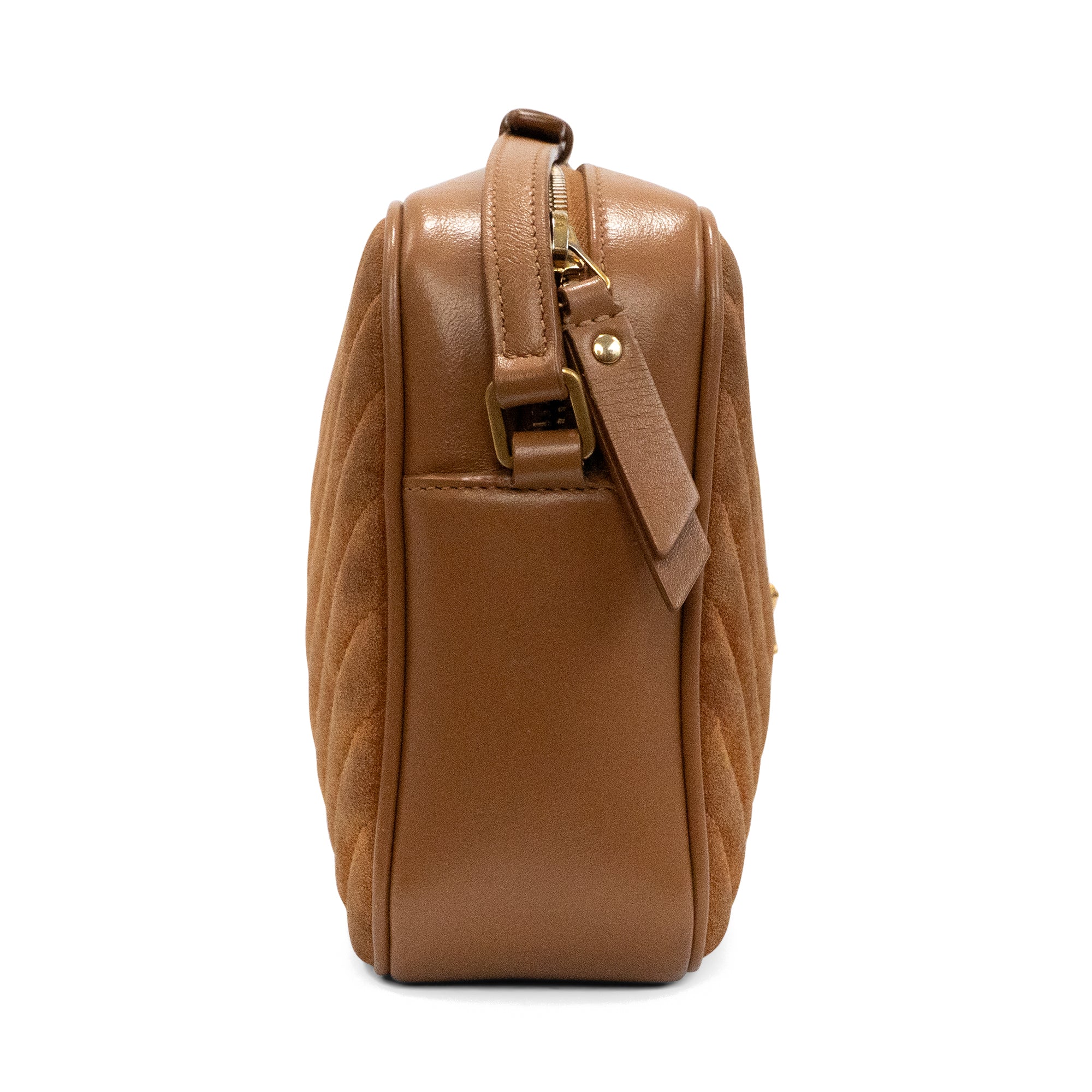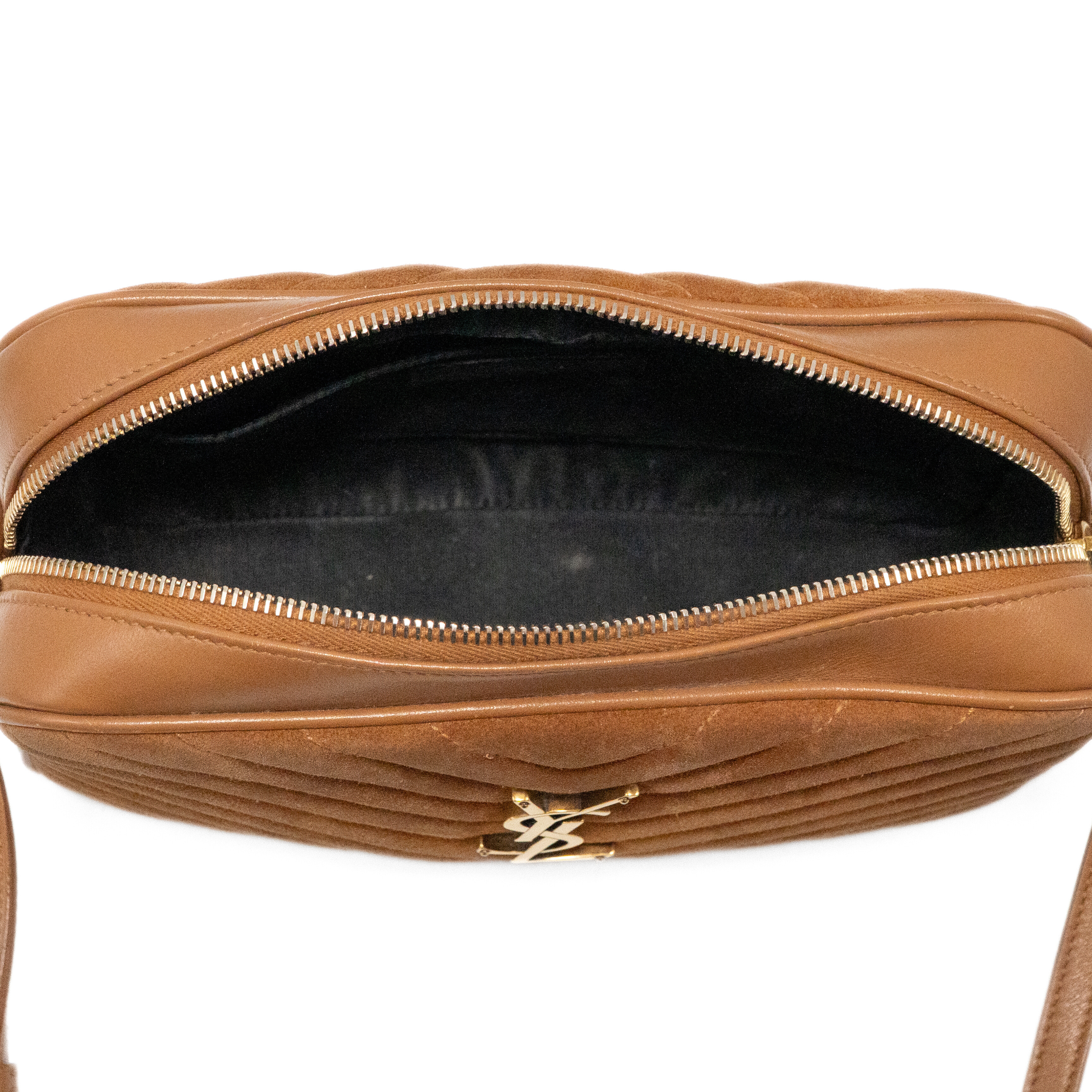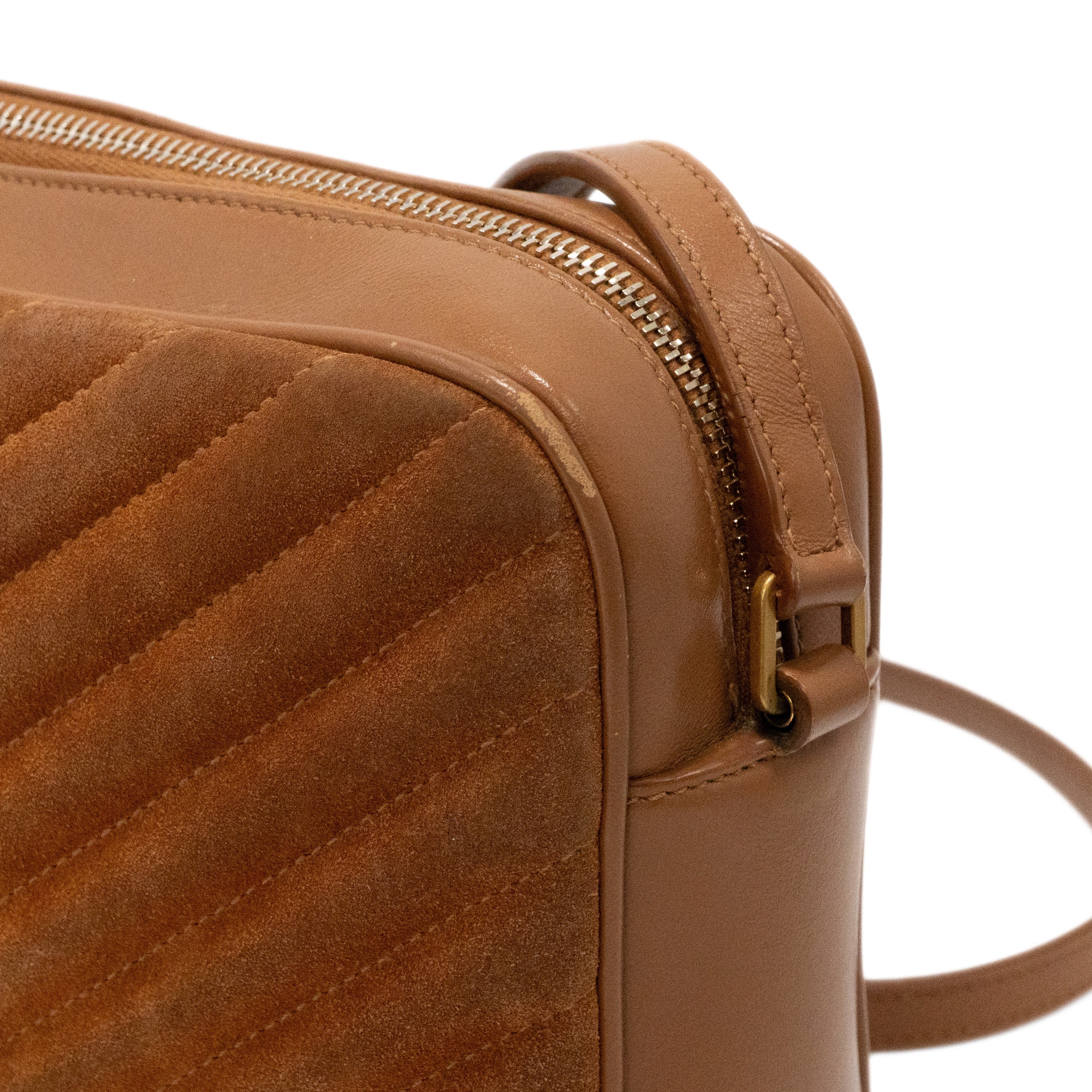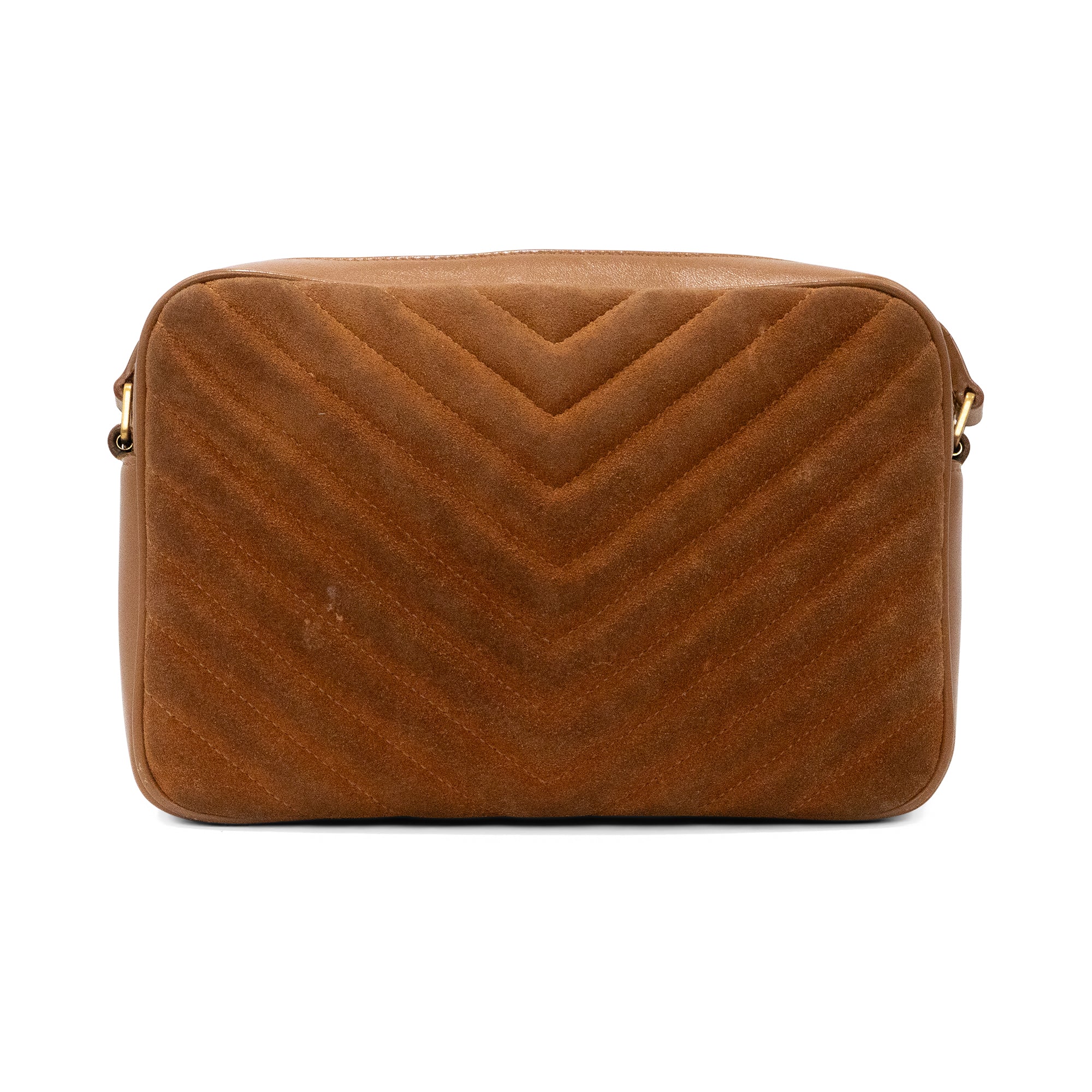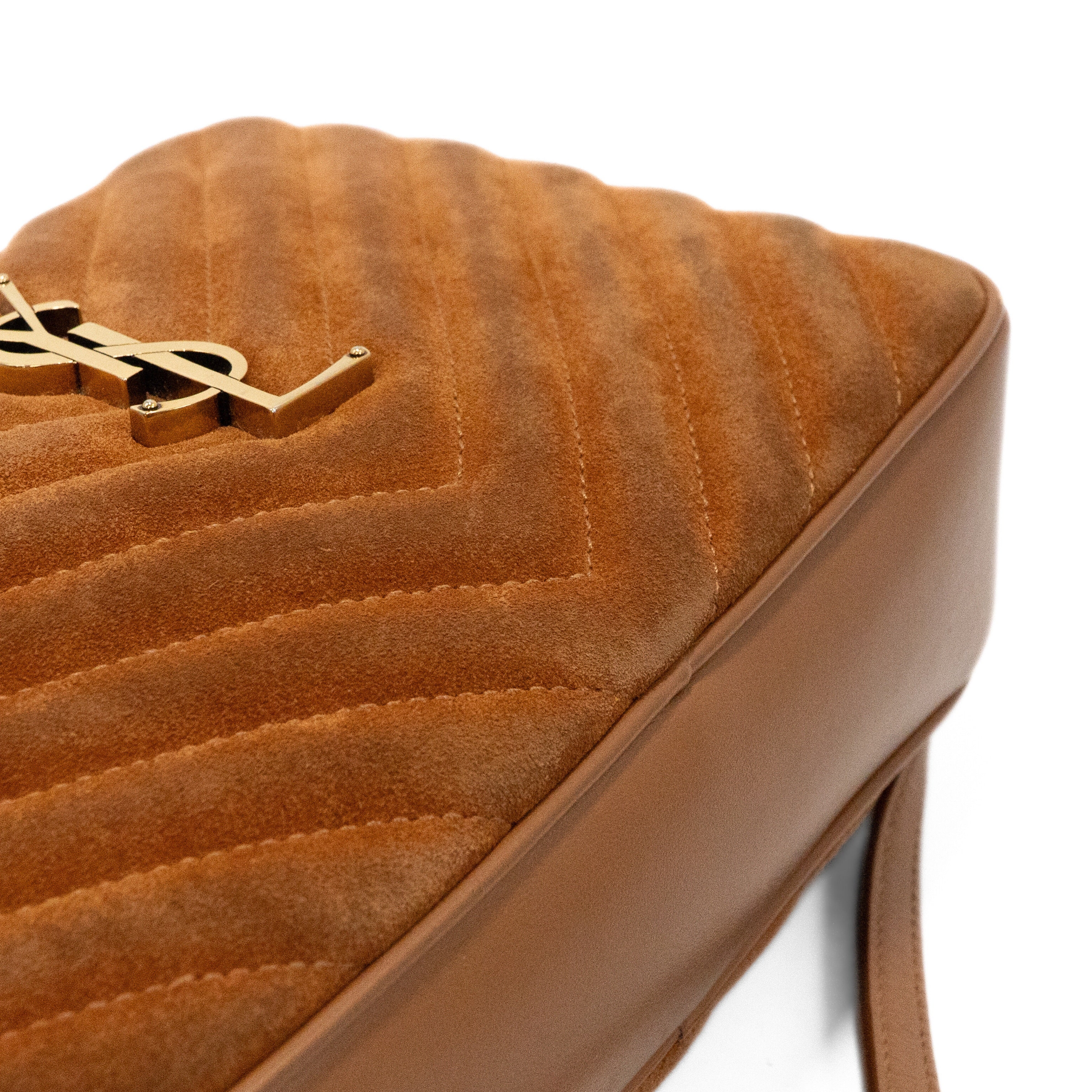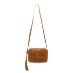 Saint Laurent 'Lou' camera bag in brown chevron quilted suede with tonal leather trims throughout, an adjustable crossbody strap, a fringe tassel on the side, and a gold 'YSL' logo plaque on the front. The bag has a top zip opening revealing a black canvas lining with a slip pocket.