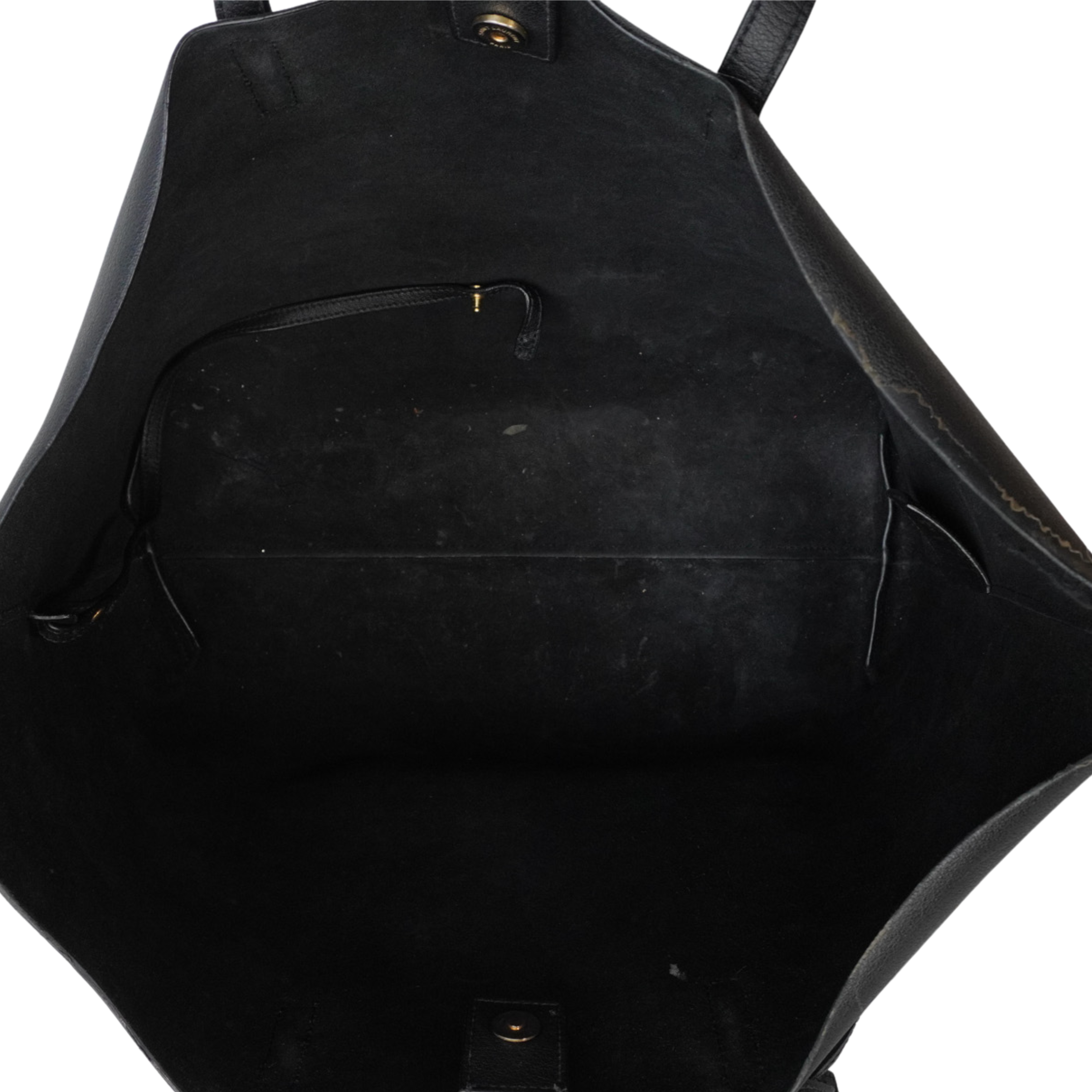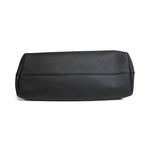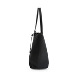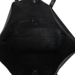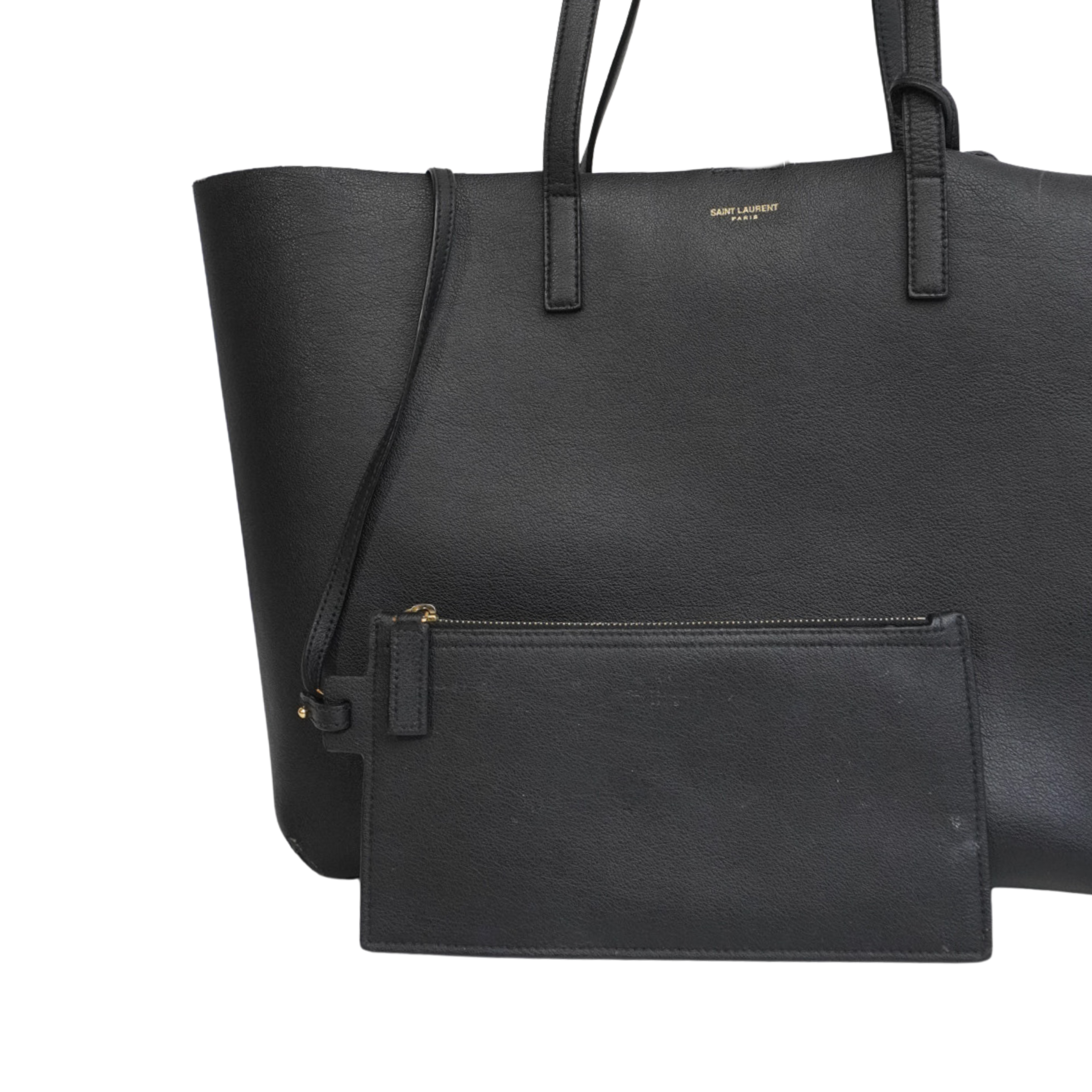 Saint Laurent 'Shopping' tote bag in black leather with dual shoulder straps, a top snap closure, and a 'YSL' clochette charm. The interior is suede lined and features a detachable zip pouch.