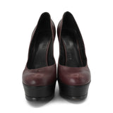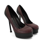 Saint Laurent 'Tribtoo' platform heels in oxblood leather with a black leather trim and sole, a stiletto heel, and a rounded toe.