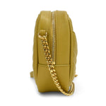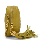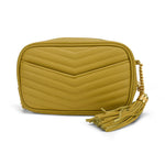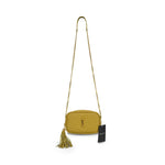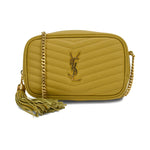 Saint Laurent 'Lou Mini' Bag in mustard yellow chevron-quilted leather with a YSL logo plaque in gold hardware and top zip closure with a leather tassel charm. Features a leather chain shoulder strap, back open pocket and inner black leather lining with card slots.