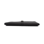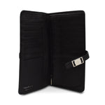 Salvatore Ferragamo bi-fold long wallet in black-grained leather with a front buckle strap closure and logo plaque in silver hardware. Features multiple cards and cash slots with a zip pocket.