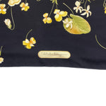 Salvatore Ferragamo square scarf in black silk with an all-over yellow, pink and green floral pattern.