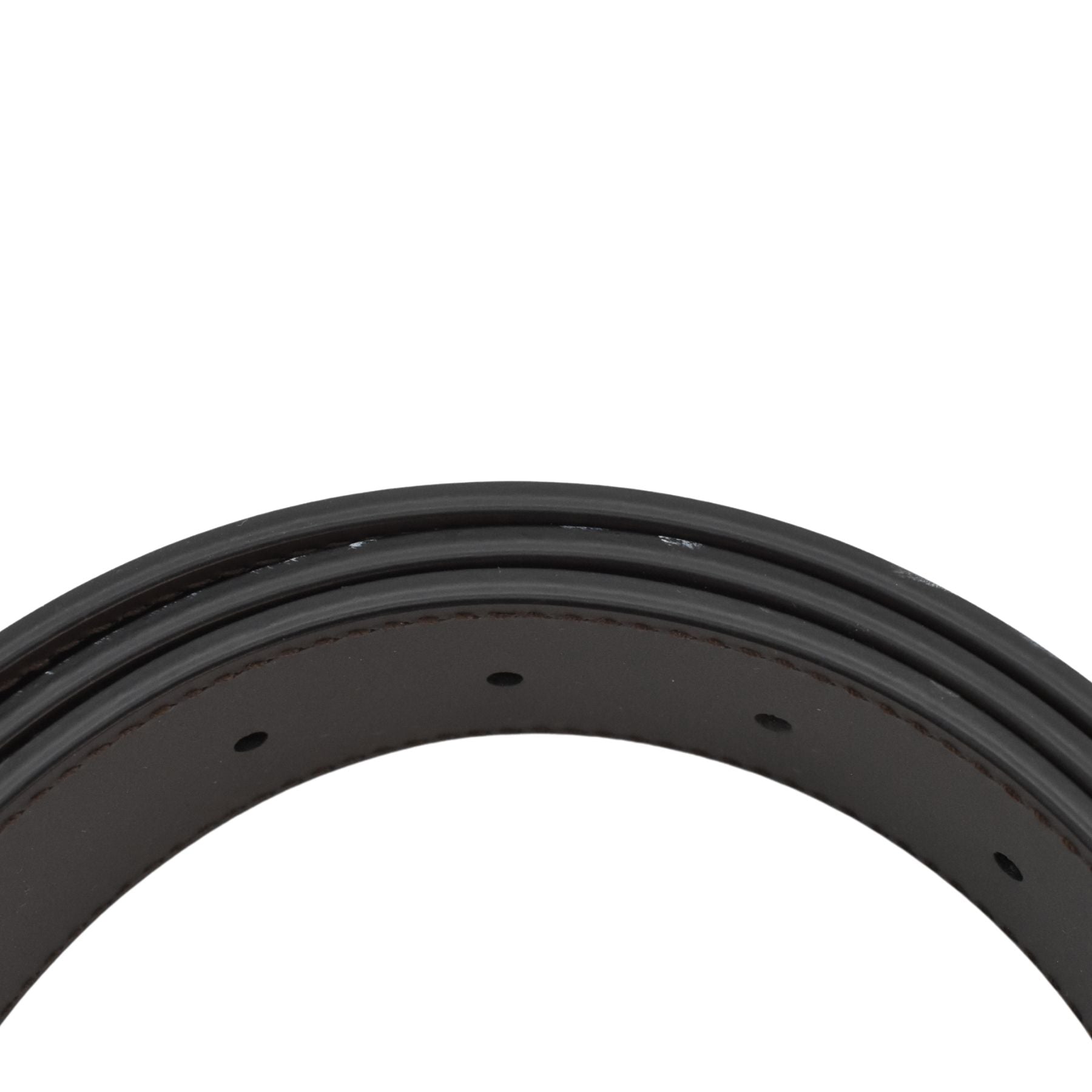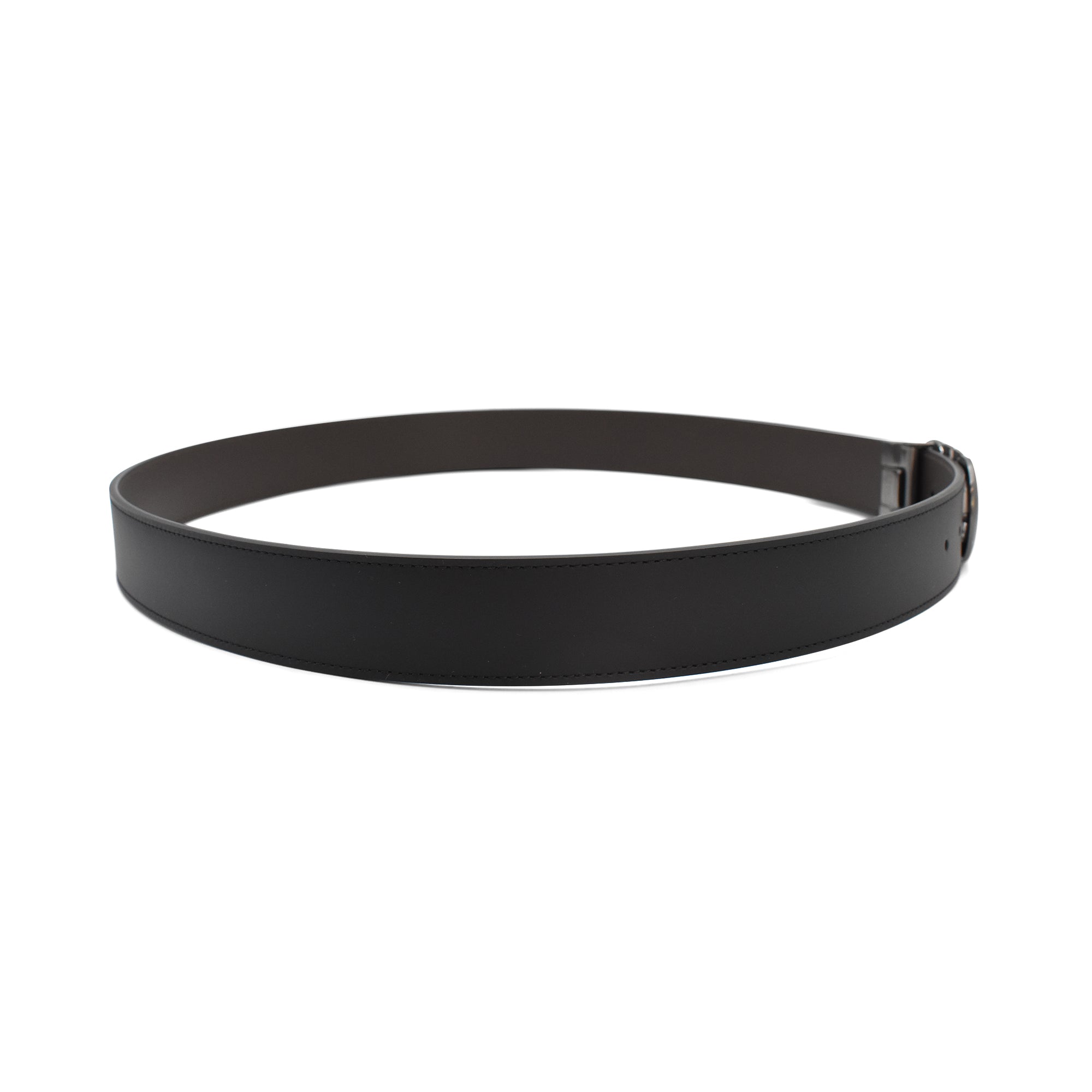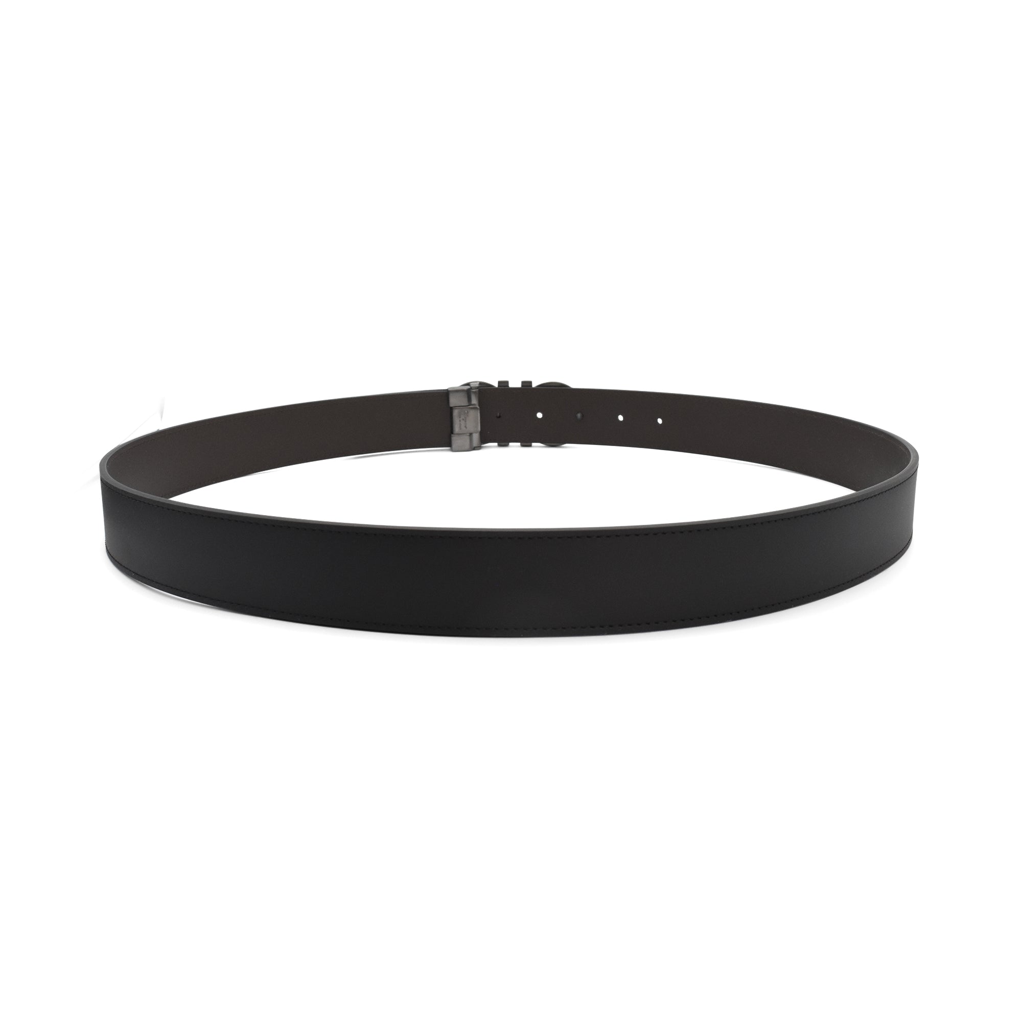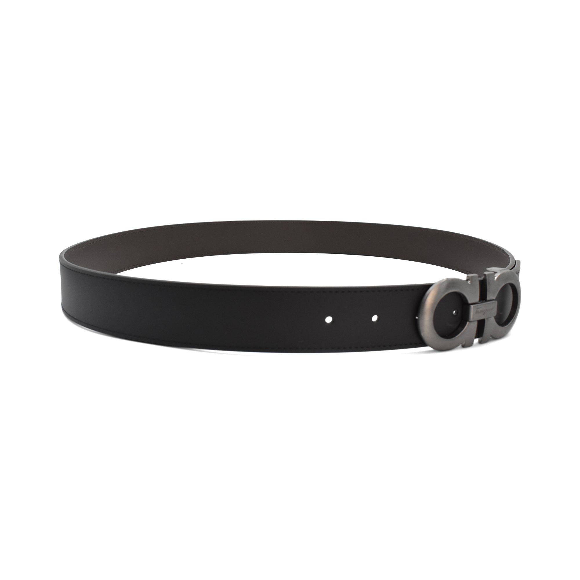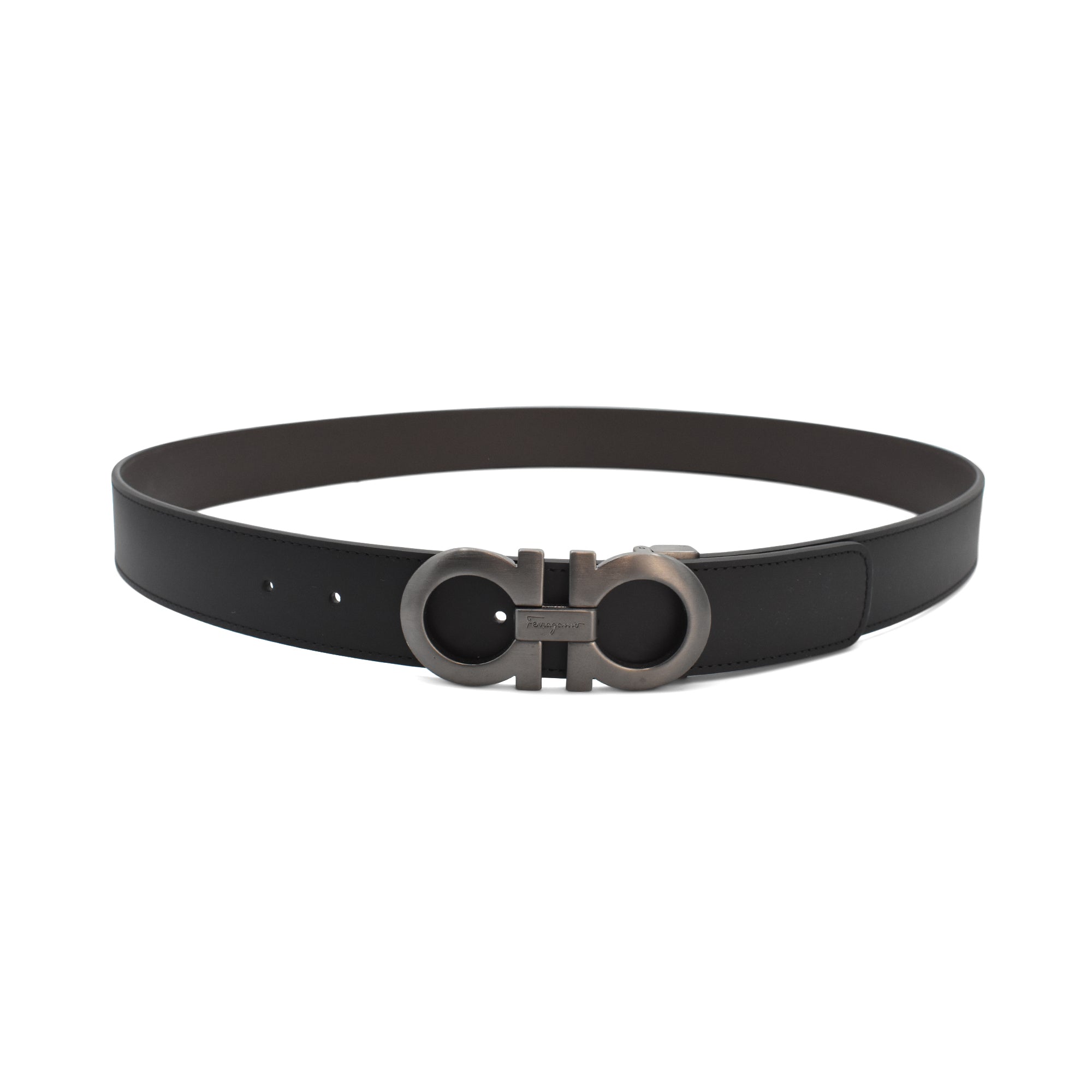 Salvatore Ferragamo reversible belt with smooth black leather on one side and smooth brown leather on the other. Features brushed gunmetal Gancini pin-buckle.