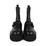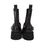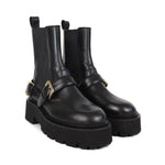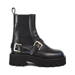 Sandro 'Helen Buckle' chelsea ankle boots in black leather with black elastic ankle panels and leather straps with gold buckle hardware around the ankle. Featyres a rounded toe and black foam sole.
