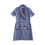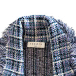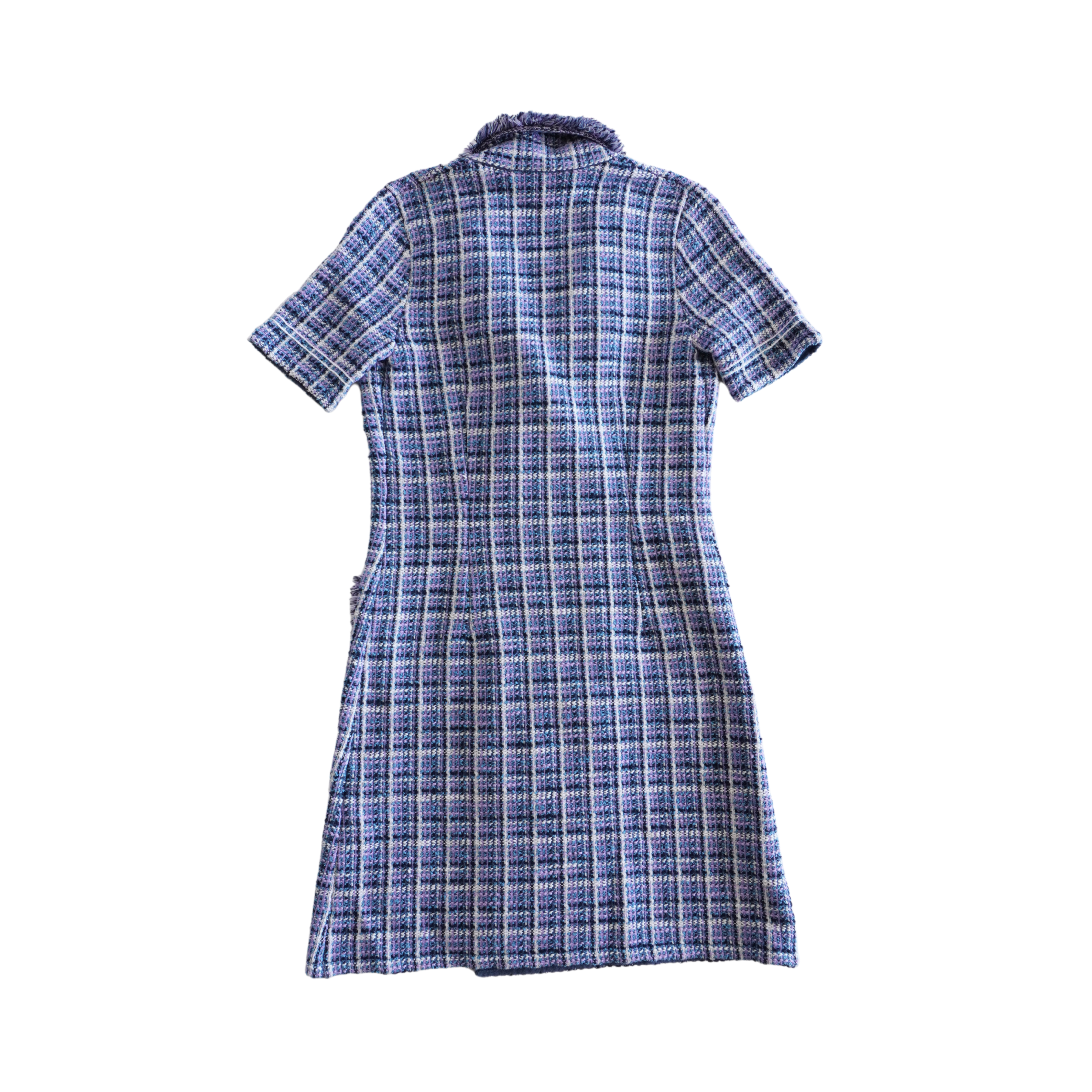 Sandro 'Ludivine' short-sleeve blazer style dress in navy, blue, purple, and white knit tweed with fringe trim and white buttons.