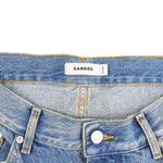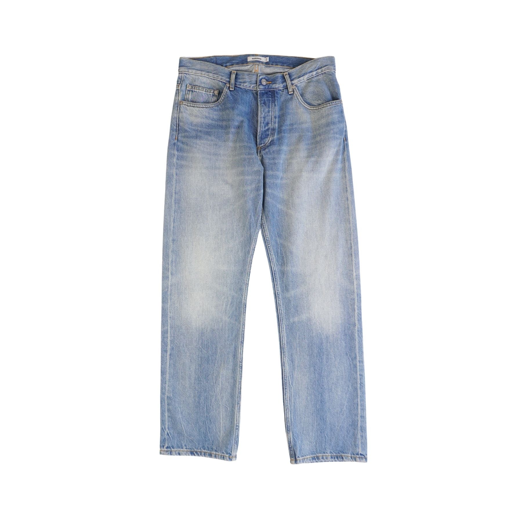 Sandro 'Whiskers Faded' straight leg jeans in medium blue washed denim with silver button-fly hardware.