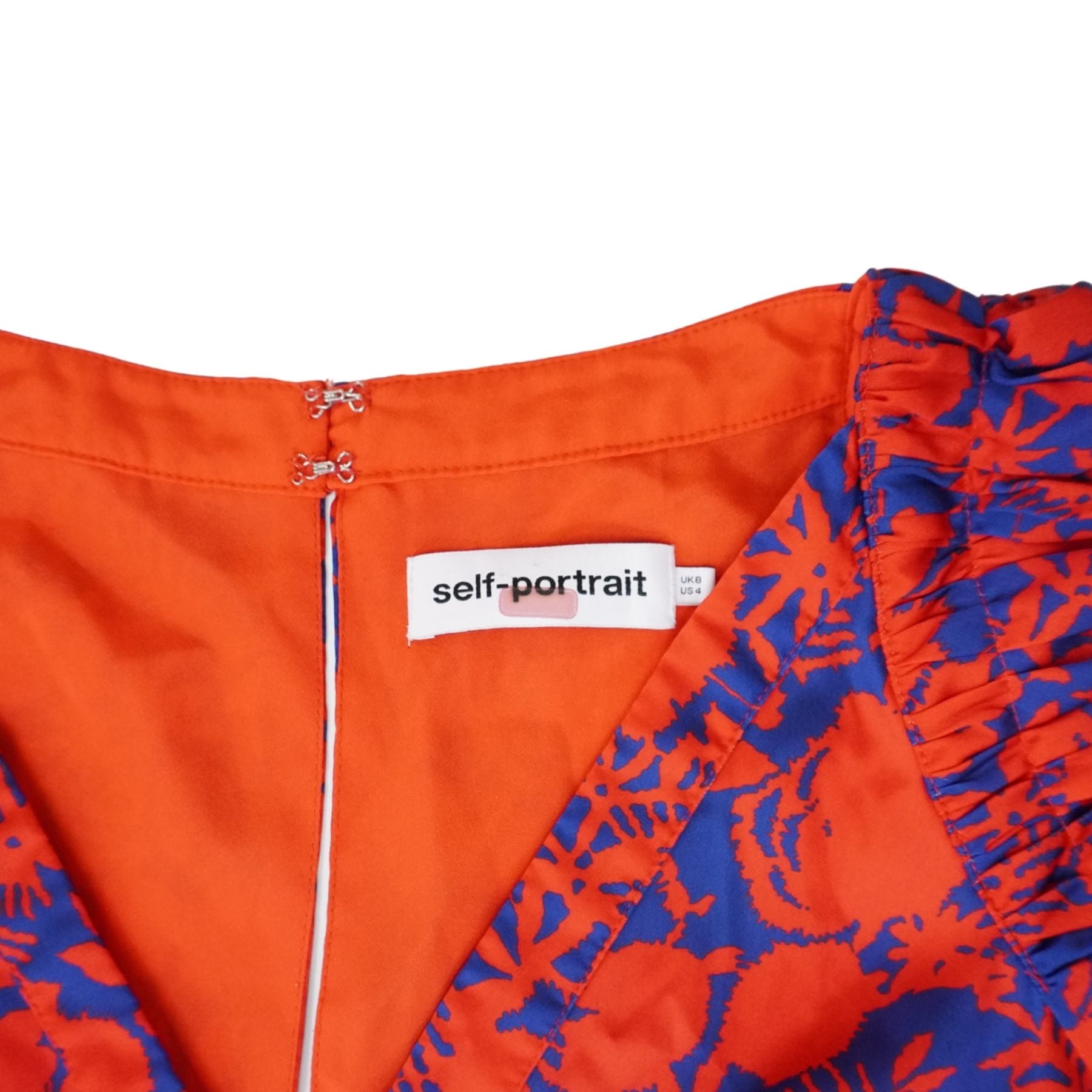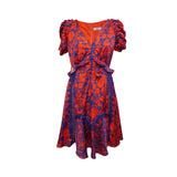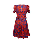 Self Portrait knee-length dress in a red and blue floral print, blue lace trim along the skirt, puff sleeves, a cutout back, and covered buttons down the chest.
