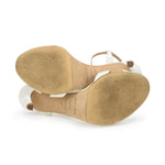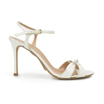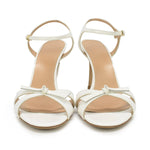 Sergio Rossi strappy heels in white patent leather with a knot on the toe and godl buckle hardware.