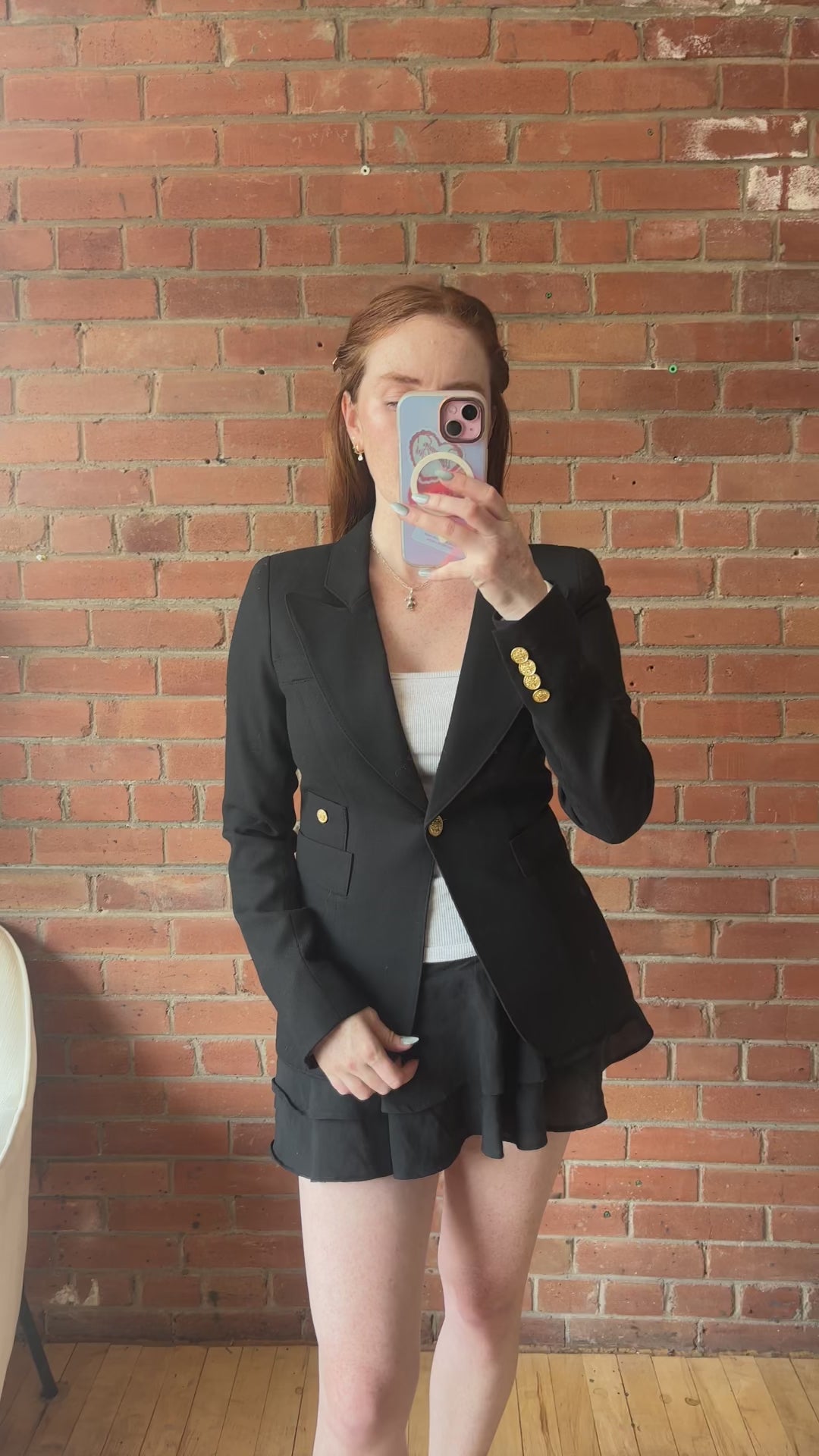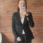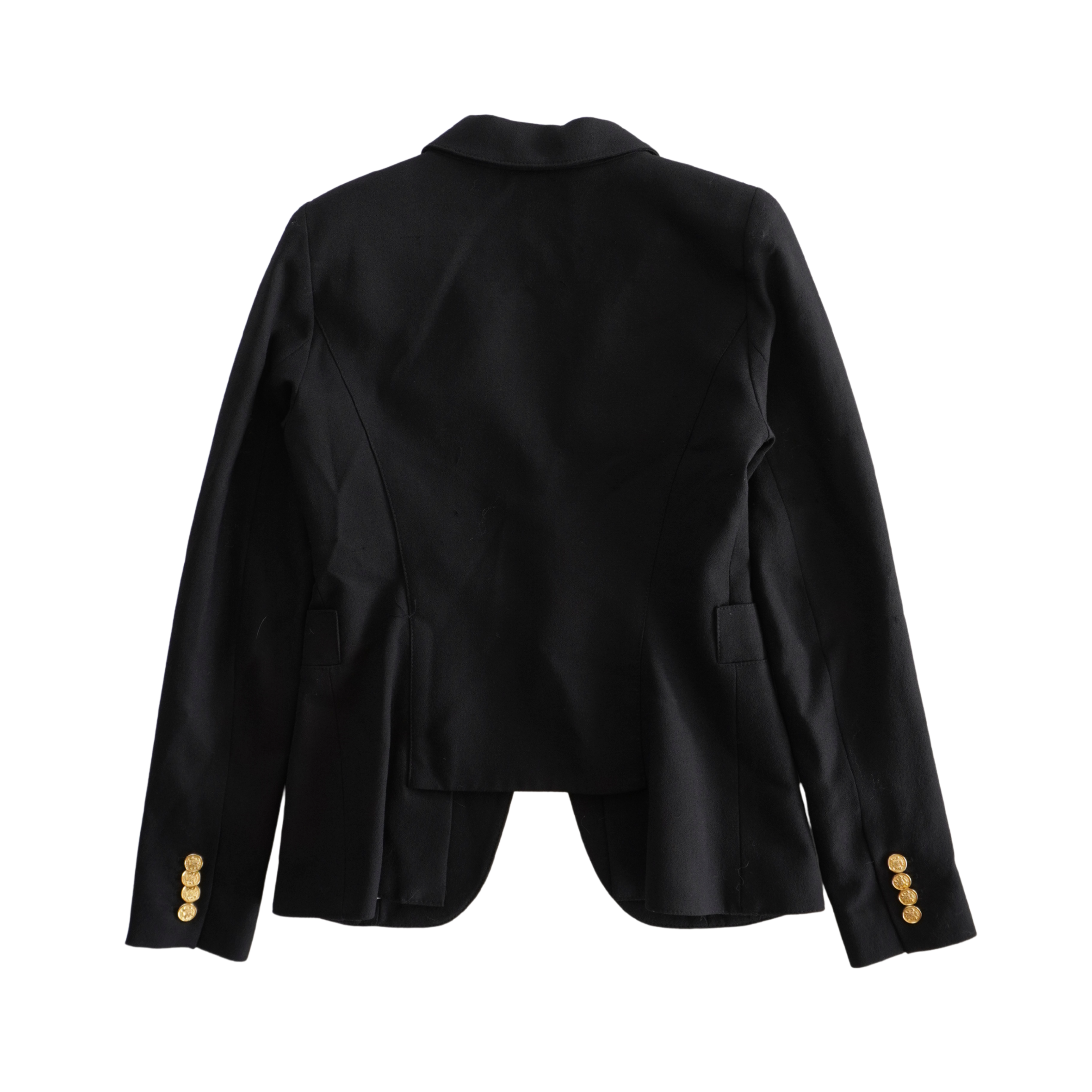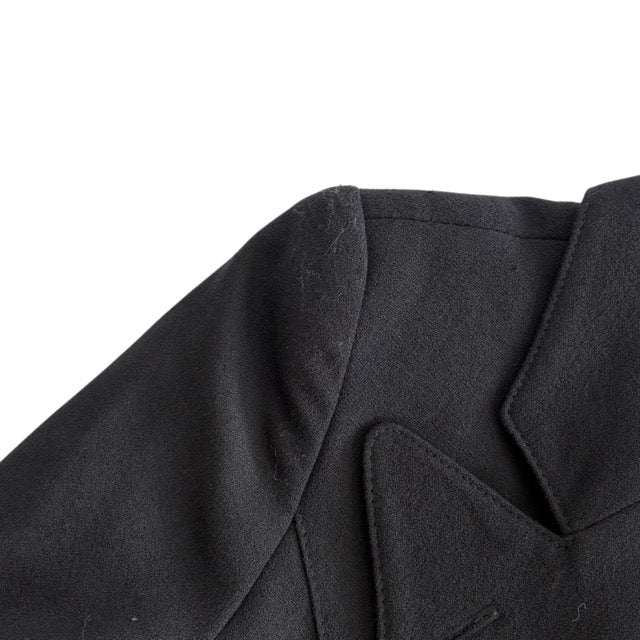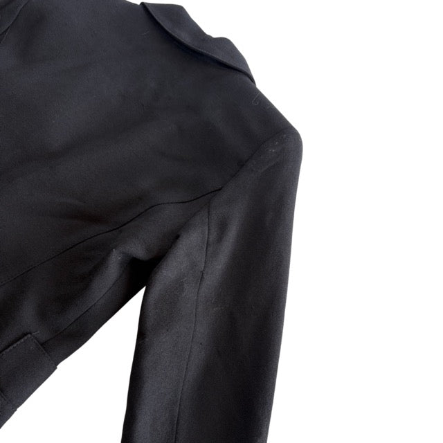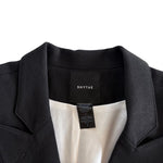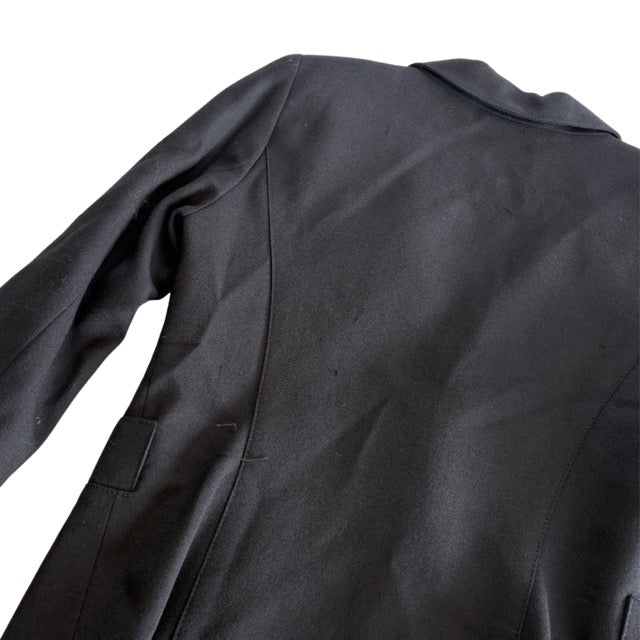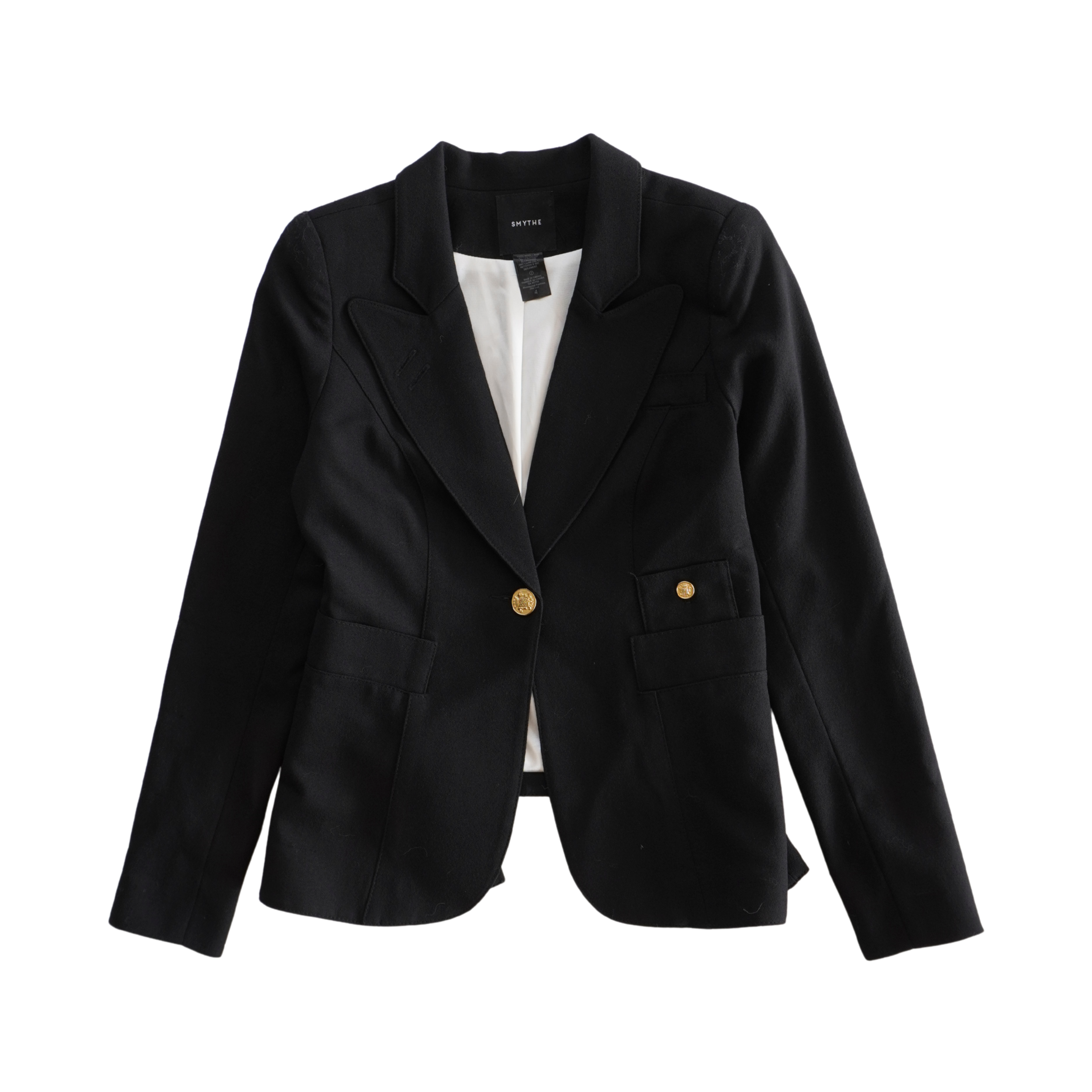 Smythe 'Duchess' blazer jacket in black wool with a single front button closure in gold metal hardware, front slip pockets, and a peak lapel collar.