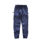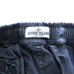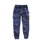 Stone Island Joggers in navy blue washed cotton with cargo and zip pockets, drawstring elastic waistband, and signature black logo patch on the side.