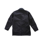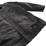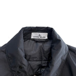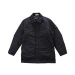Stone Island twill coat in black nylon with a front concealed zip opening in silver hardware, side zip pockets, a collar with black snap button details, and a signature logo patch on the arms.