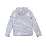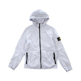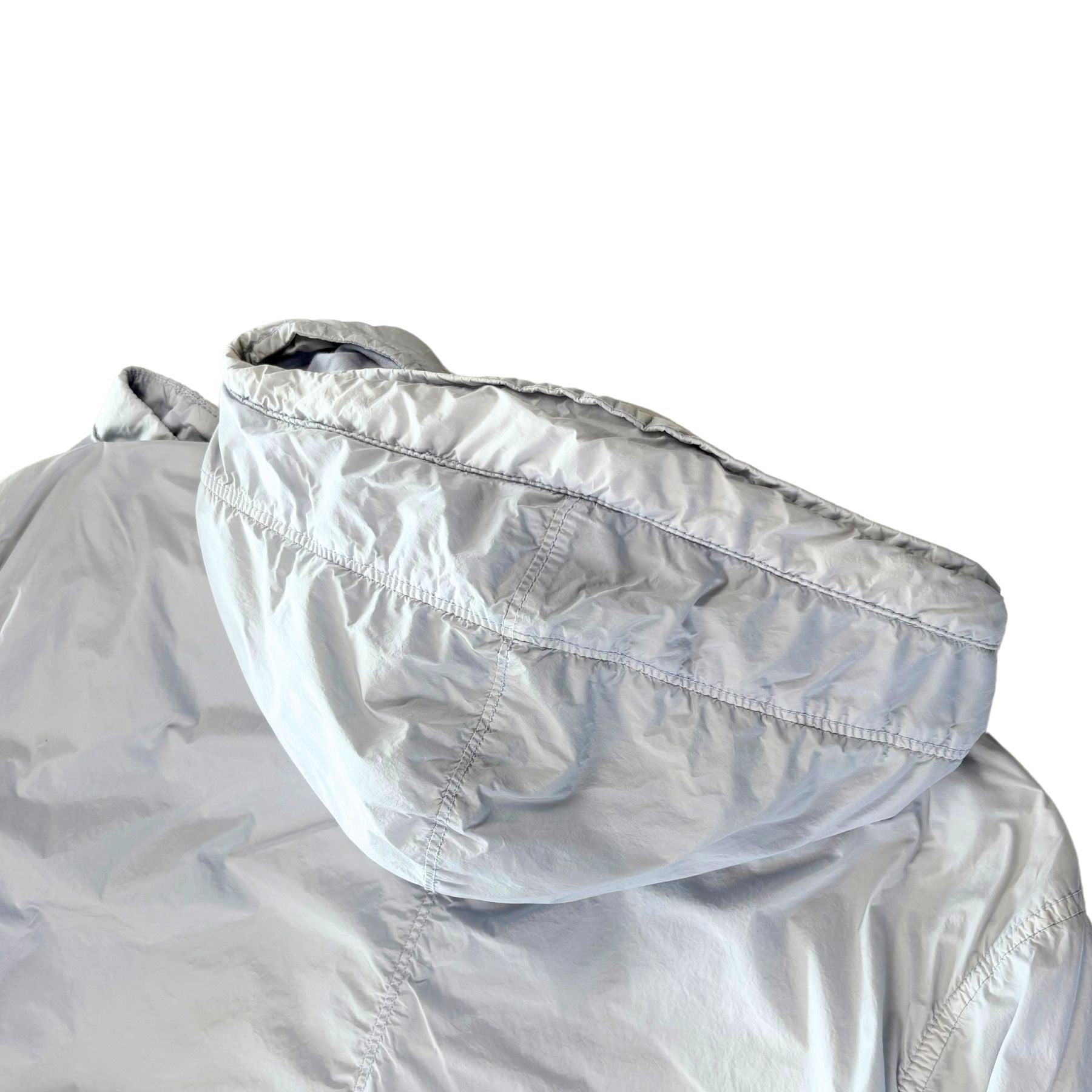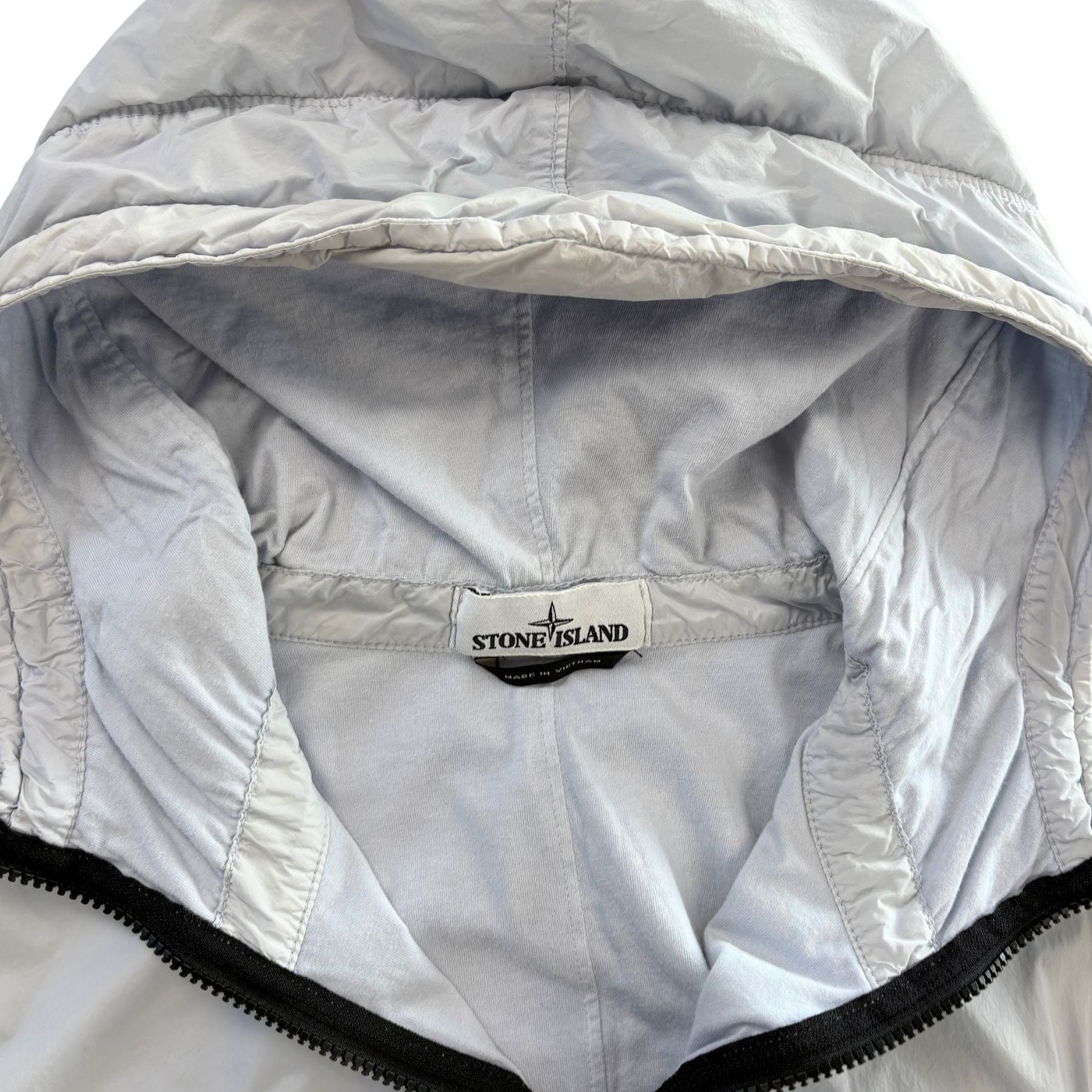 Stone Island windbreaker jacket in ice blue nylon with a front-zip opening in black hardware, side zip and slip pockets, a hood, and a black signature logo patch on the sleeve.