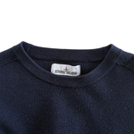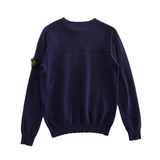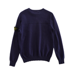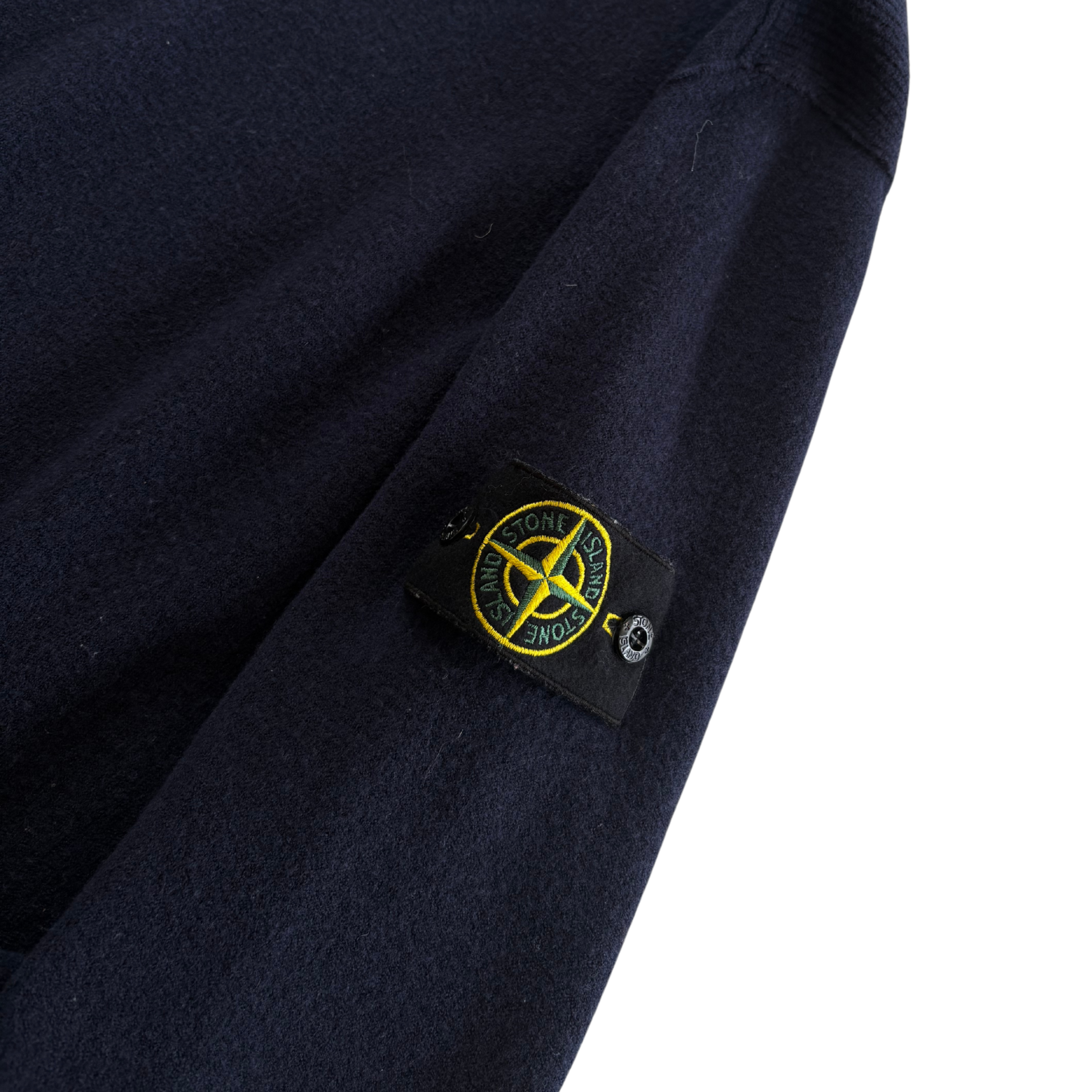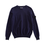 Stone Island pullover sweater in a navy knit wool blend with a signature logo patch on the sleeve.