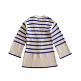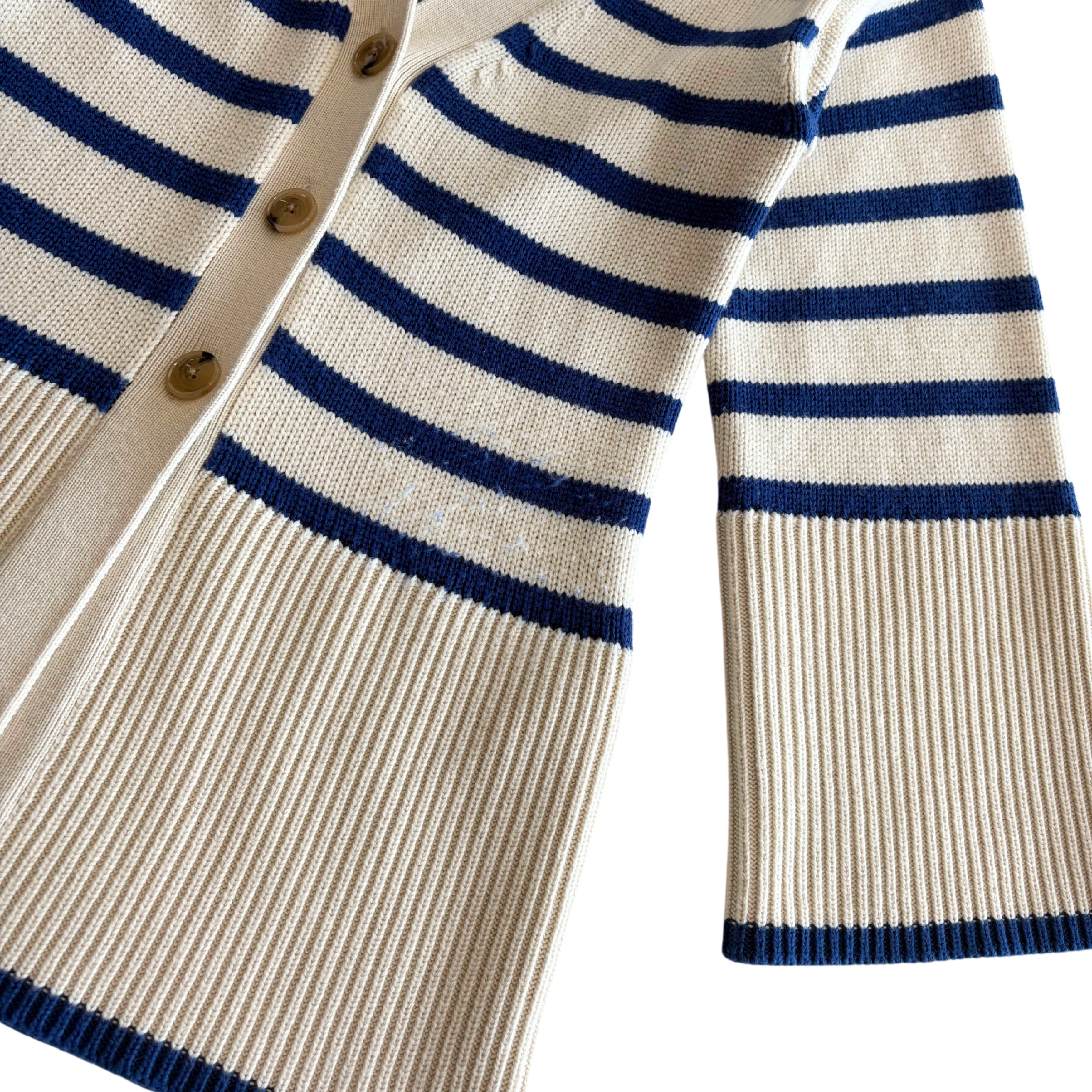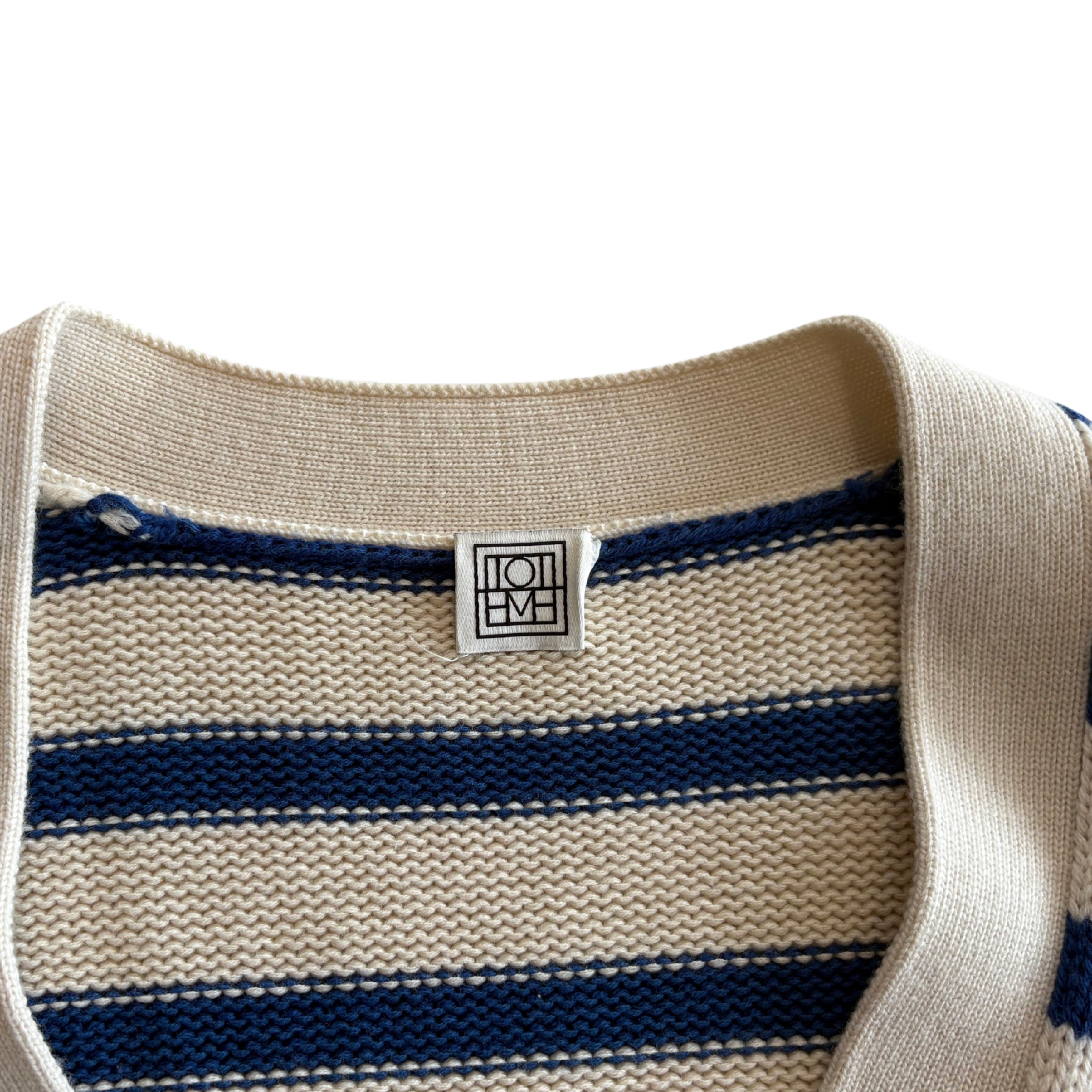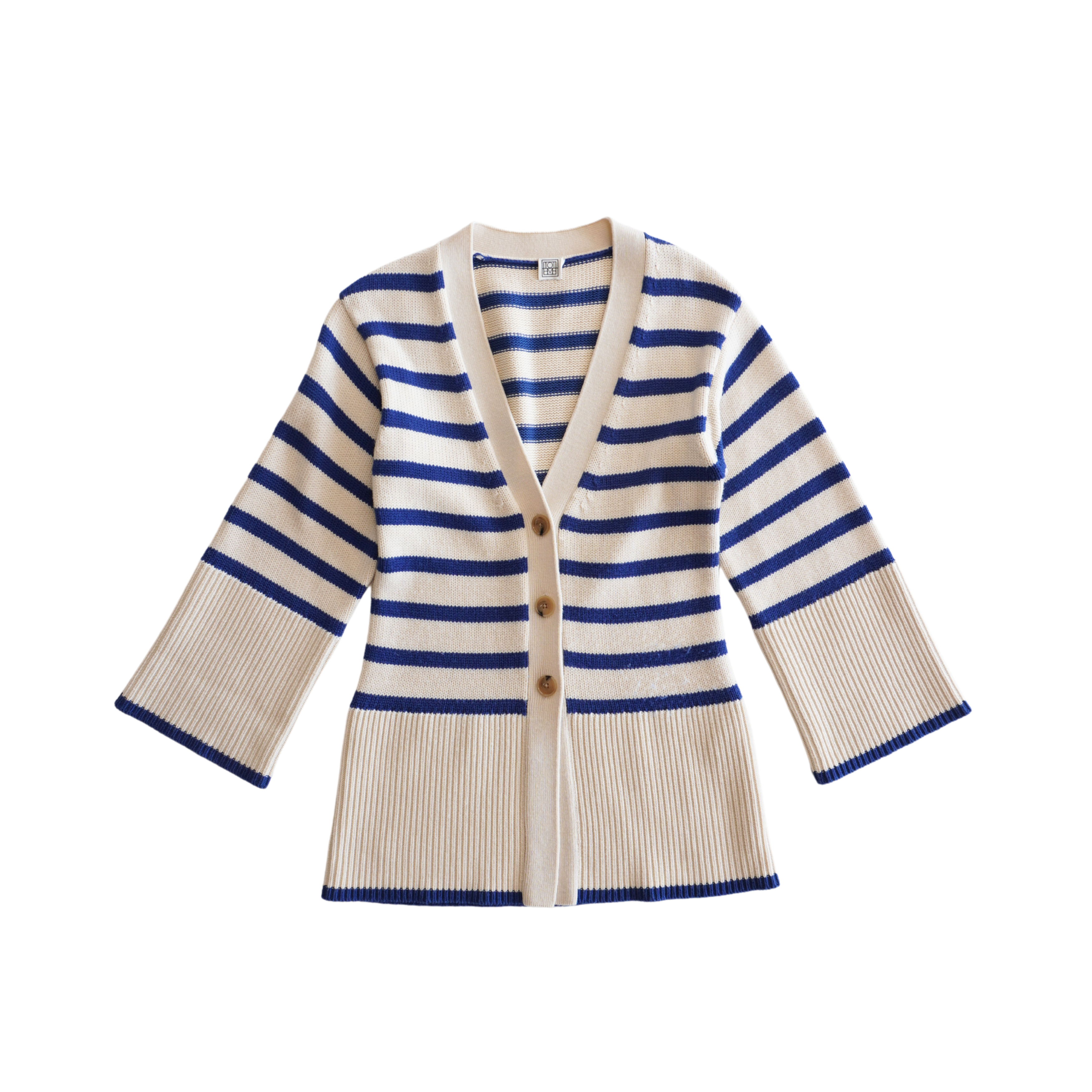 Toteme 'Signature Striped' knit cardigan in cream and blue stripes with wide sleeves and an elongated ribbed hem hem.