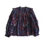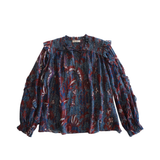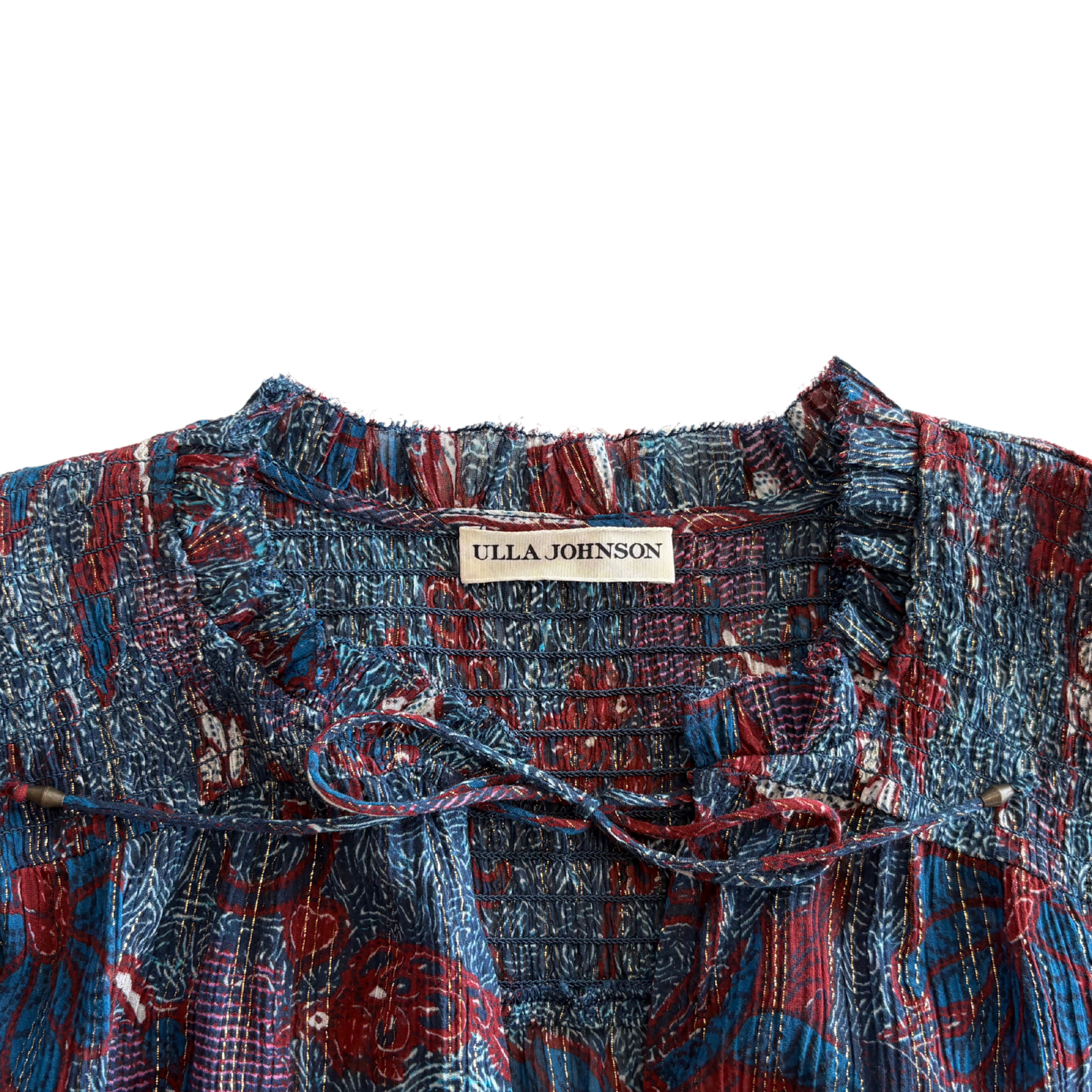 Ulla Johnson 'Lara' blouse in blue, burgundy, and white sheer floral print with ruffle detailing, metallic gold pinstripes, and a v-neck with self tie bow at the collar.