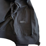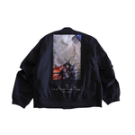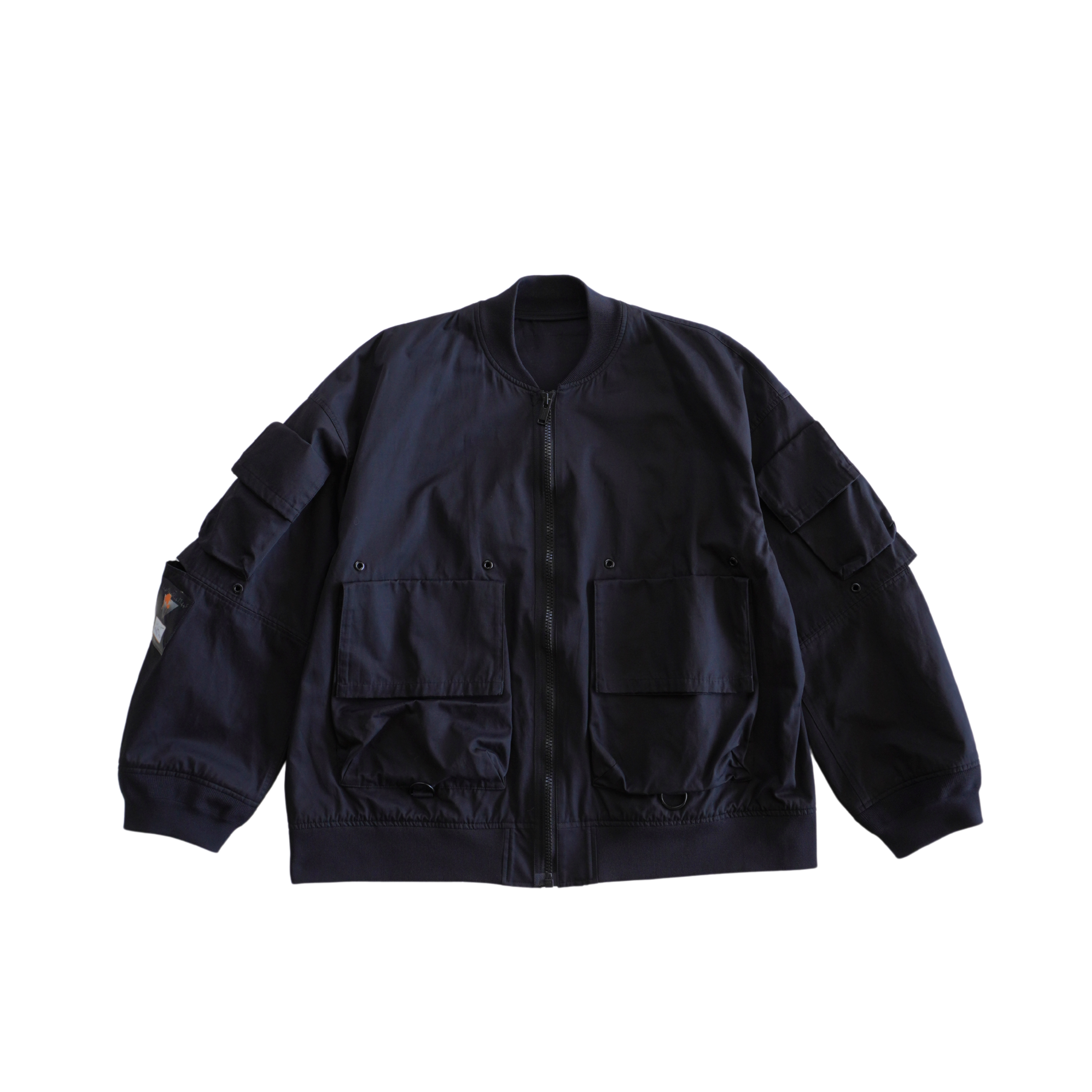 Undercover 'Psychic Force Generates' bomber jacket in black nylon with large cargo pockets around the front, a zip opening in black hardware, slits at the elbows, and a large pixel art graphic on the back.